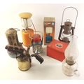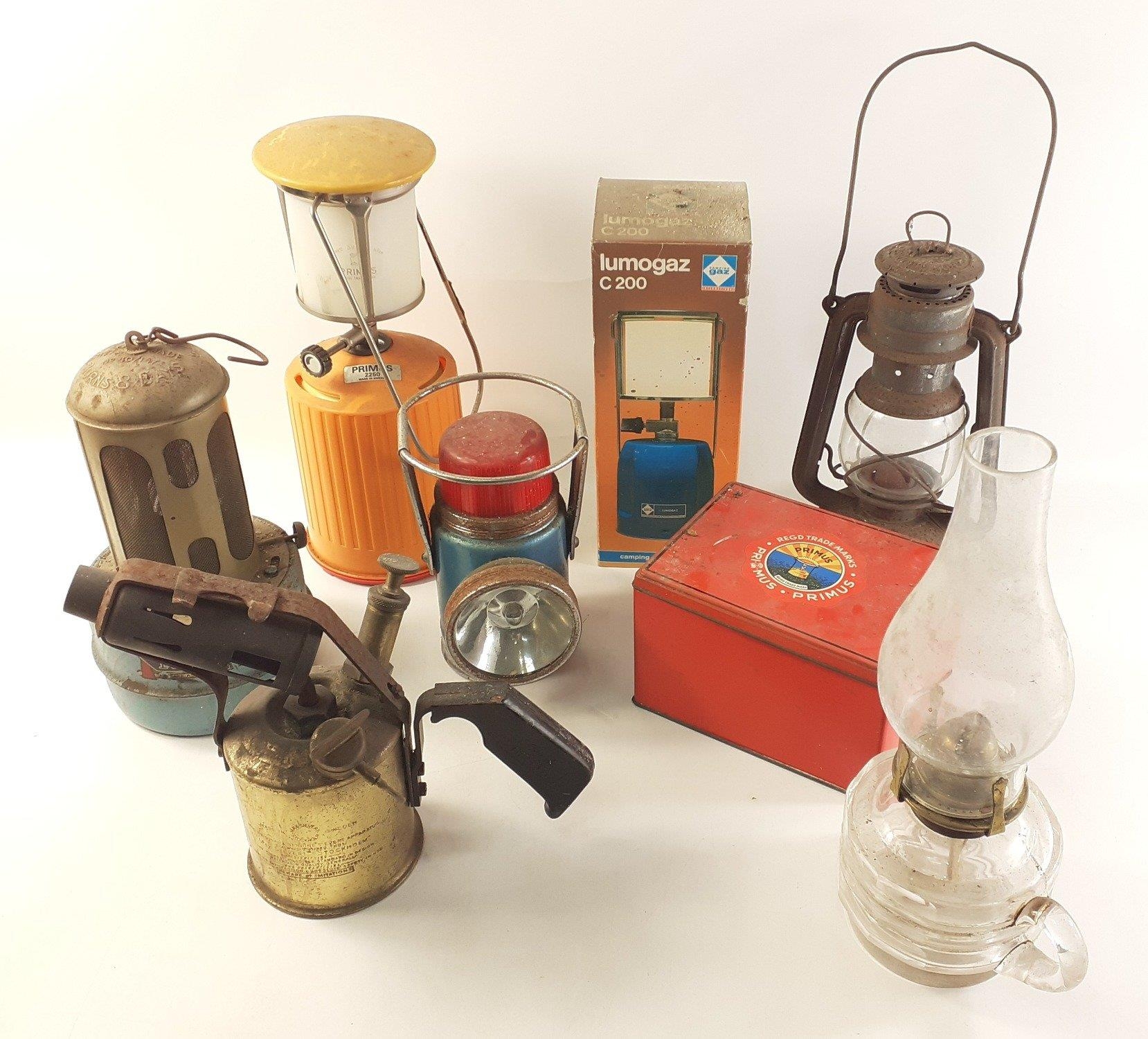 A box containing TILLEY lamps, a vintage brass blow torch, a vintage small PRIMUS STOVE (Lovely) etc