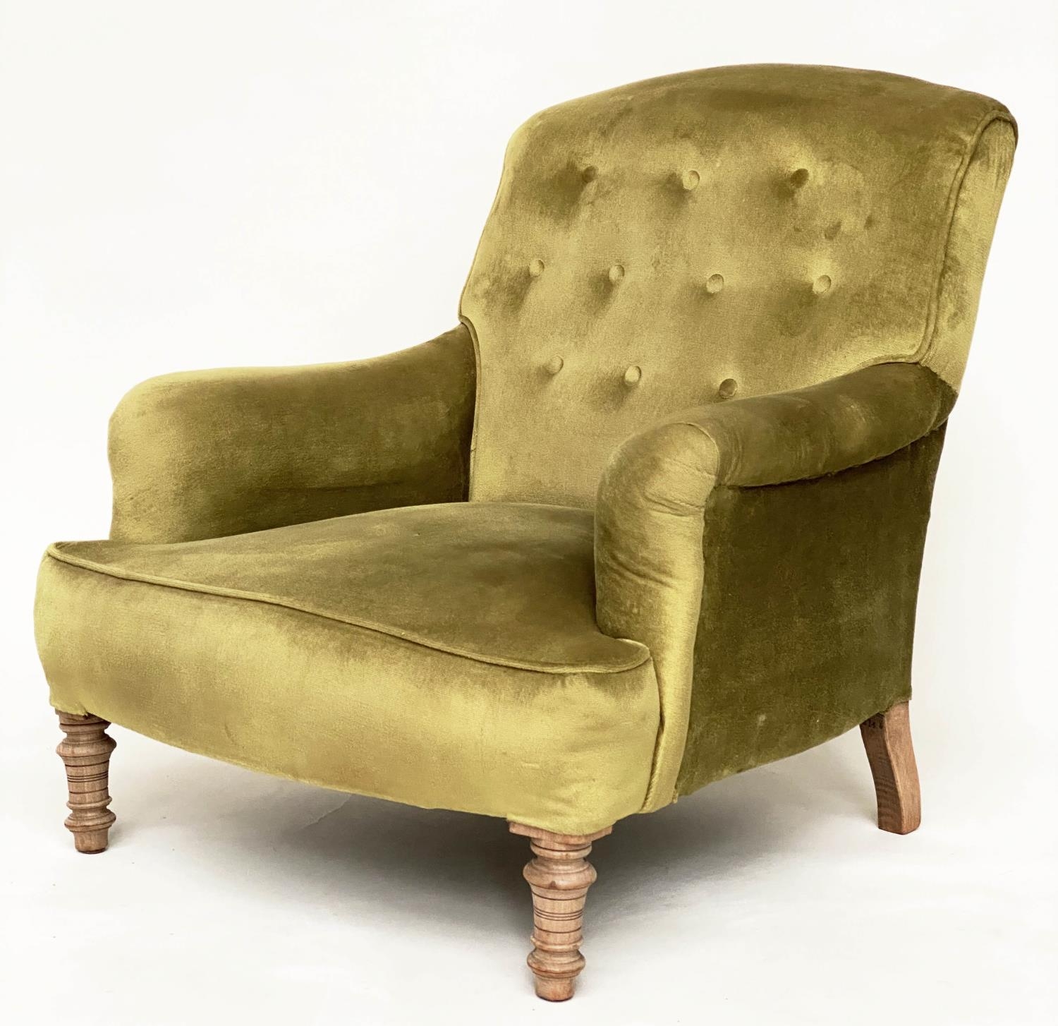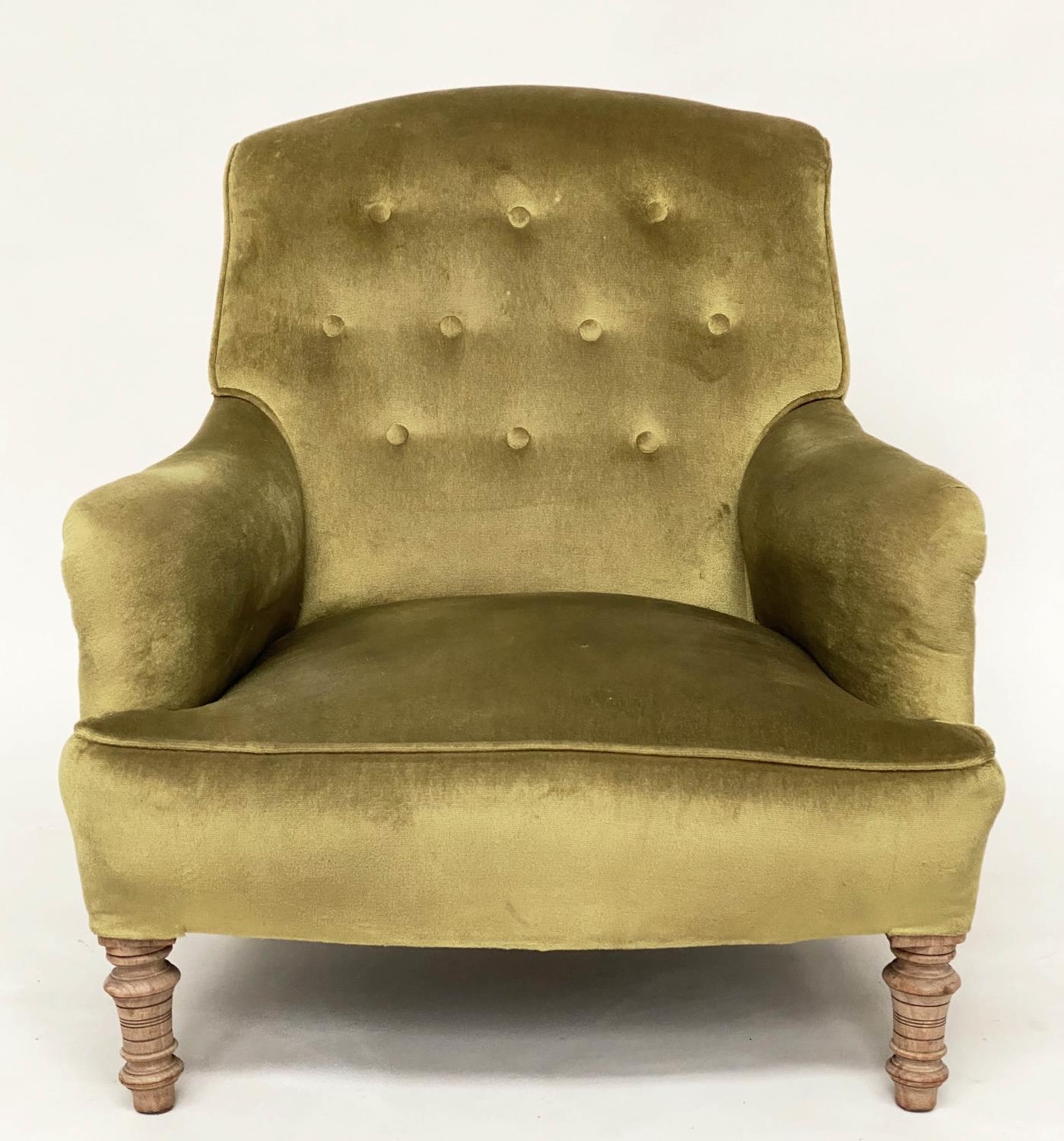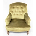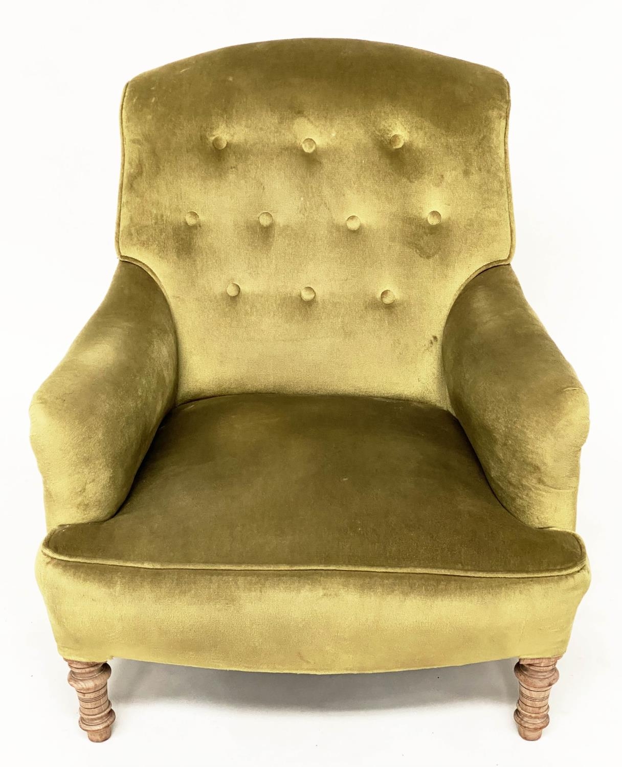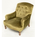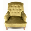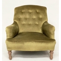 ARMCHAIR, Edwardian buttoned green velvet upholstered with turned front supports, 73cm W.