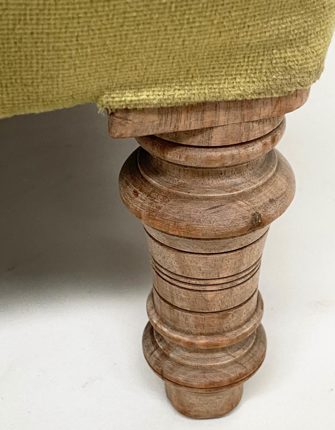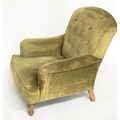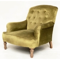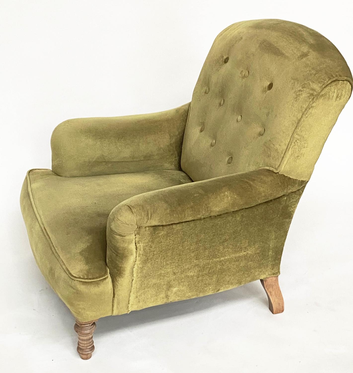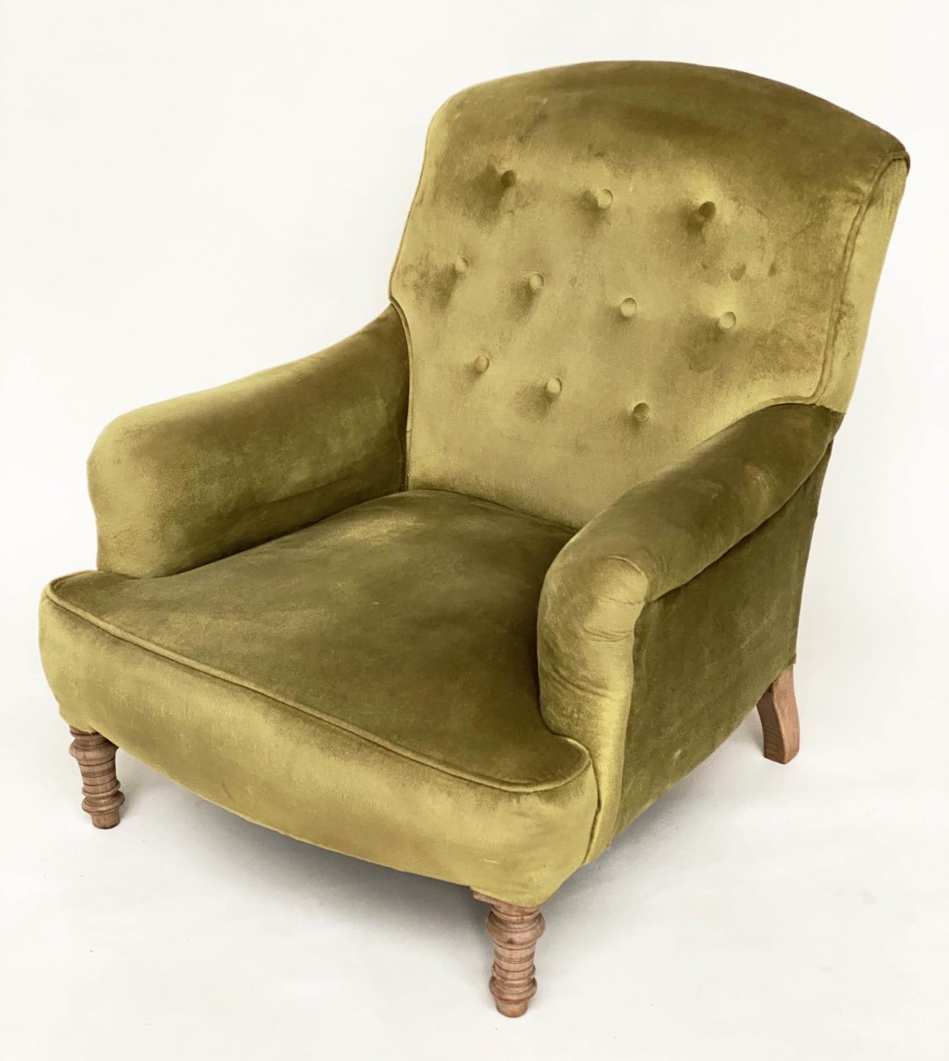 ARMCHAIR, Edwardian buttoned green velvet upholstered with turned front supports, 73cm W.