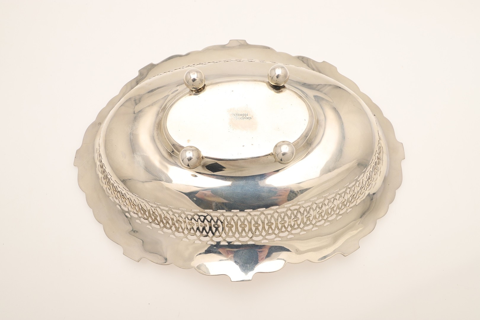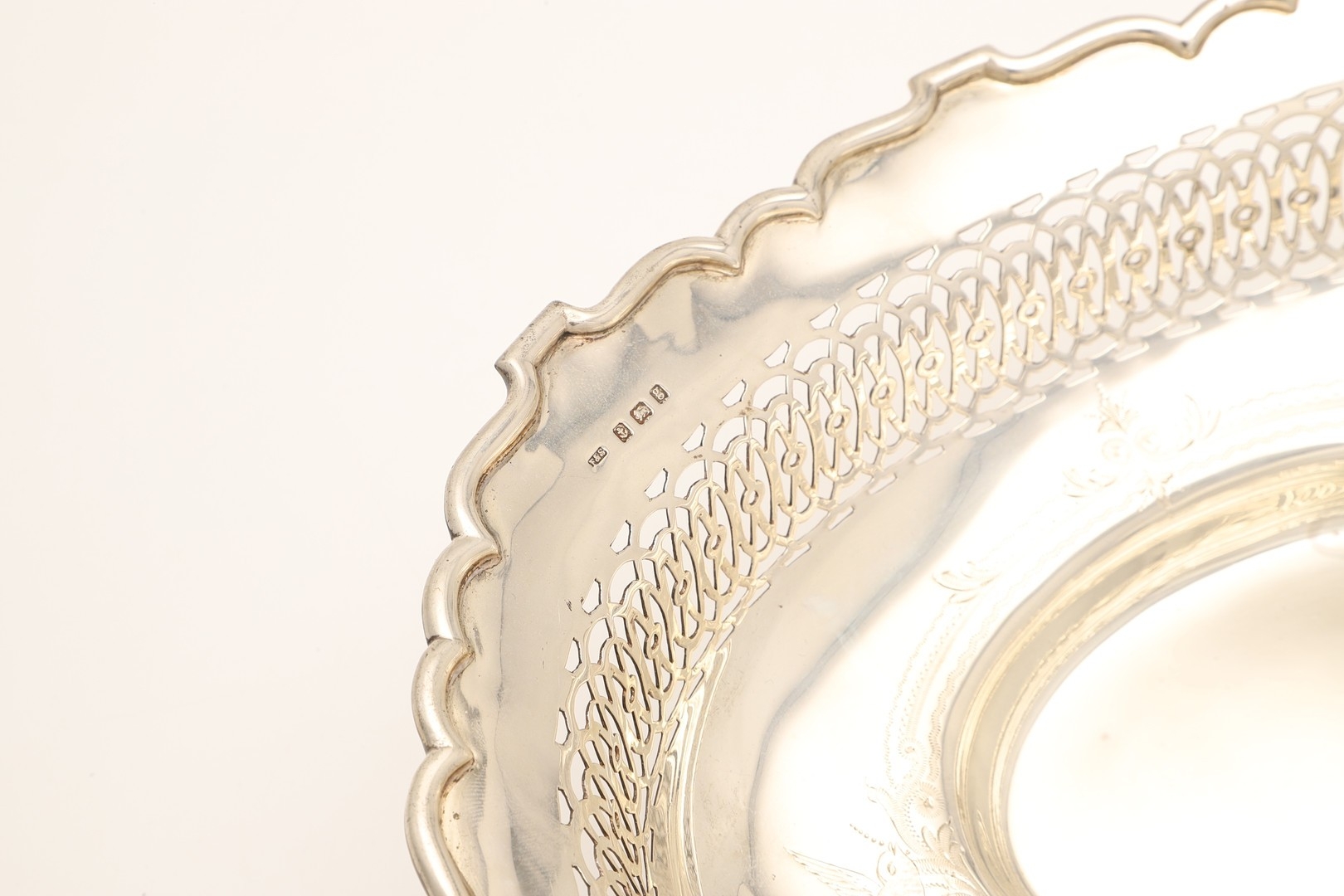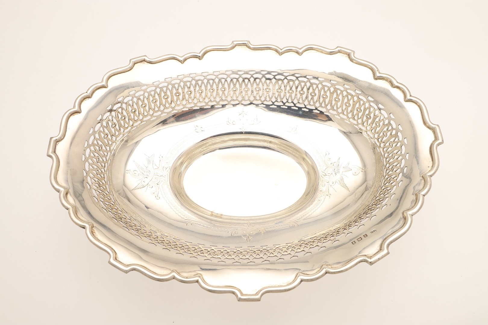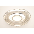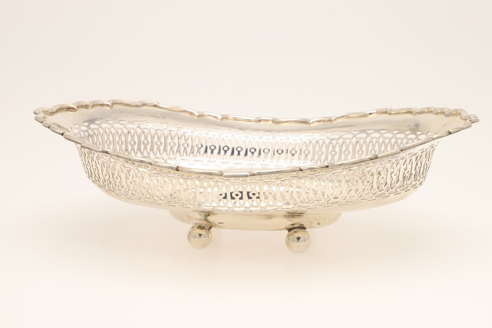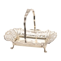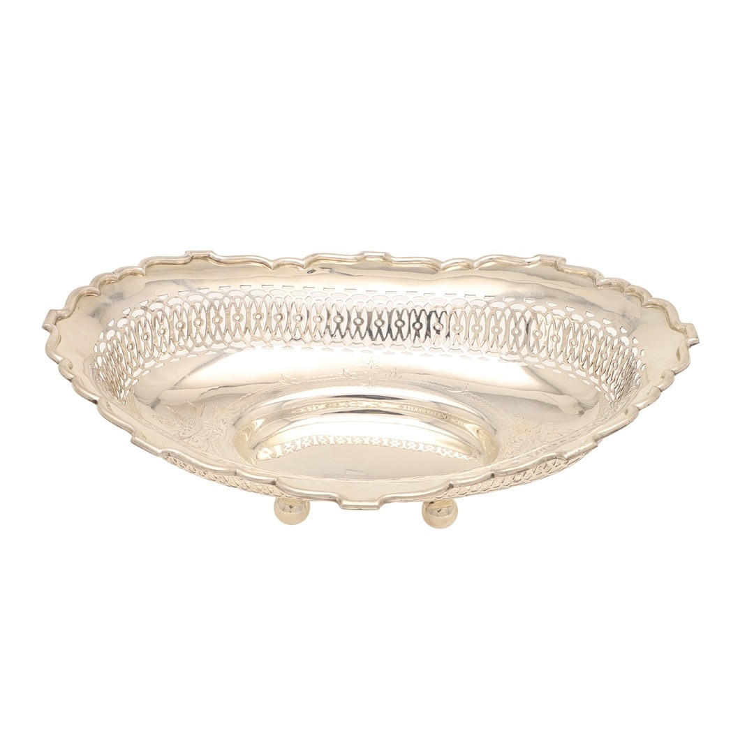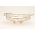 AN EDWARDIAN SILVER TABLE BASKET. Of oval form with shaped border, pierced design and engraved decoration, stood on ball feet. Hallmarked Fattorini & Sons Ltd, Birmingham, 1906. Height 8.5cm x Width 29cm x Depth 22cm. Weight 12.9ozt.
