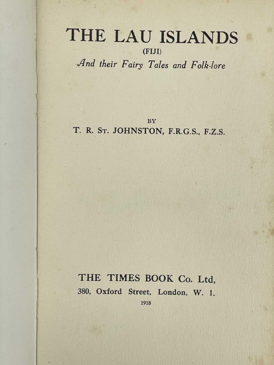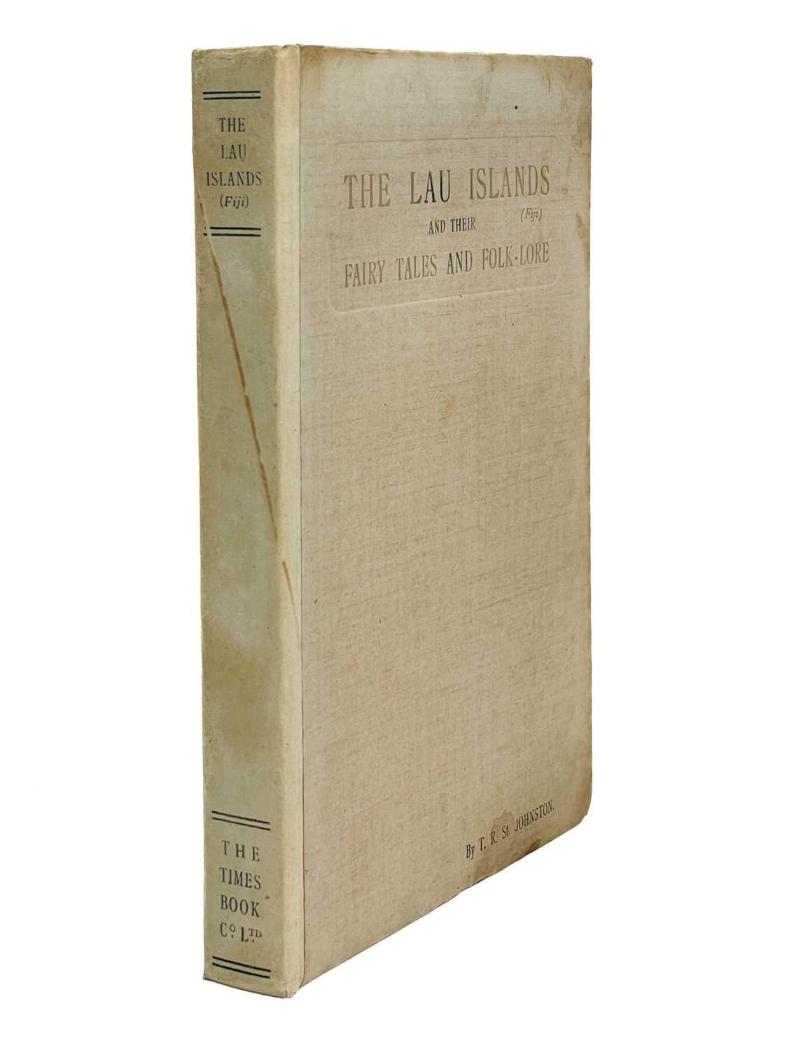 JOHNSTON, T. R. 'The Lau Islands (Fiji) And Their Fairy Tales and Folk-lore,' Inscribed by the author 'Lt. Col. F. S. Toogood "for auld lang eye" from the author', original boards with some staining, heavy spotting to edges of leaves, six plates as called for, a scarce work, The Times Book Co, London, 1918.