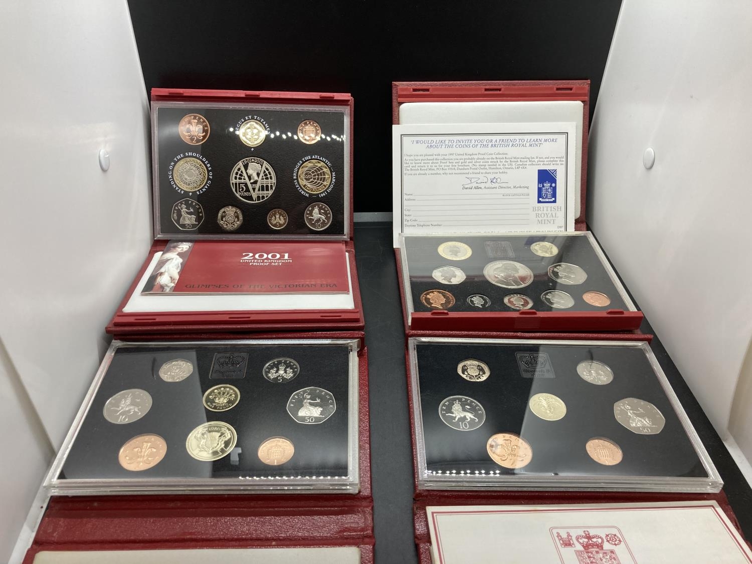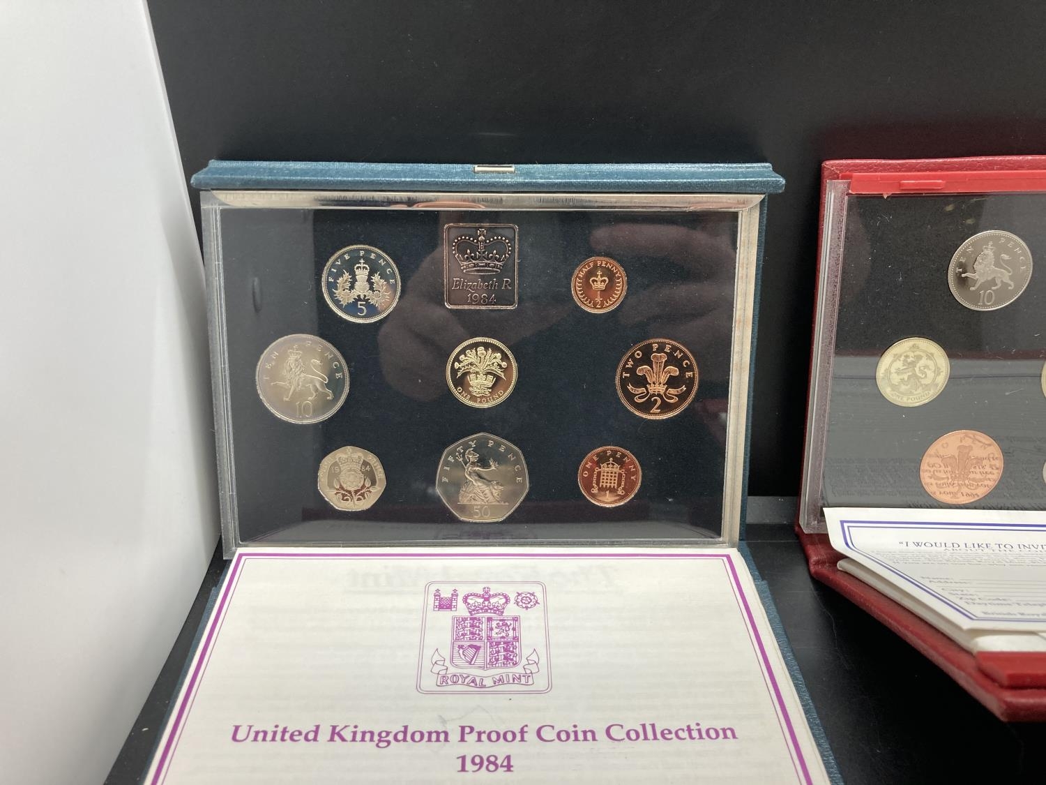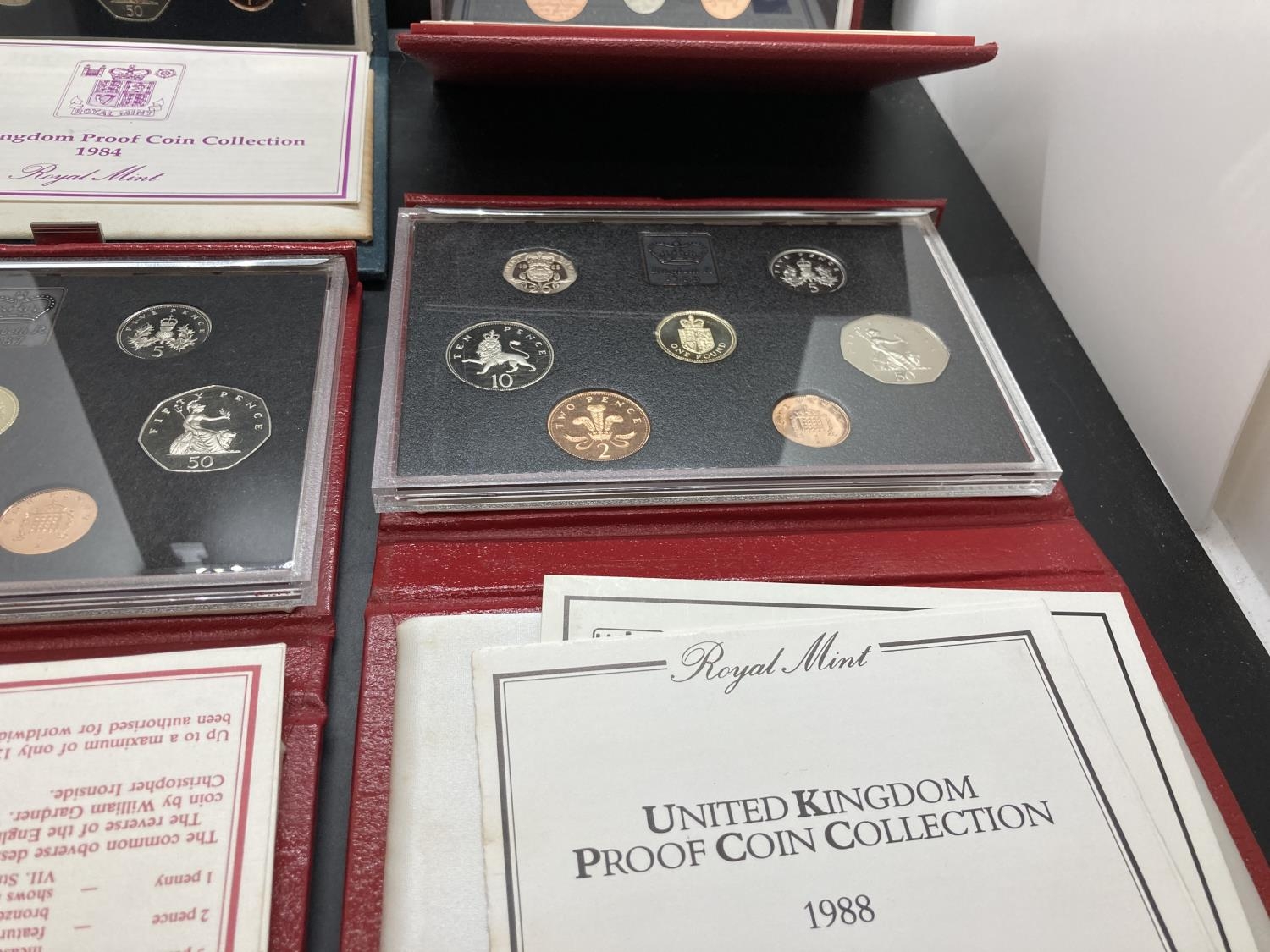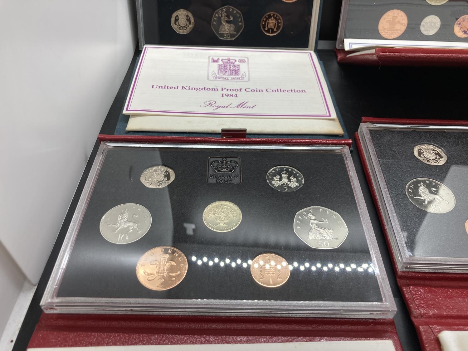 Thirteen cased Royal Mint United Kingdom Proof Coin Collections for years 1984, 1985, 1986, 1987, 1988, 1990, 1991, 1994, 1995, 1997, 2001, 2002 and 2004