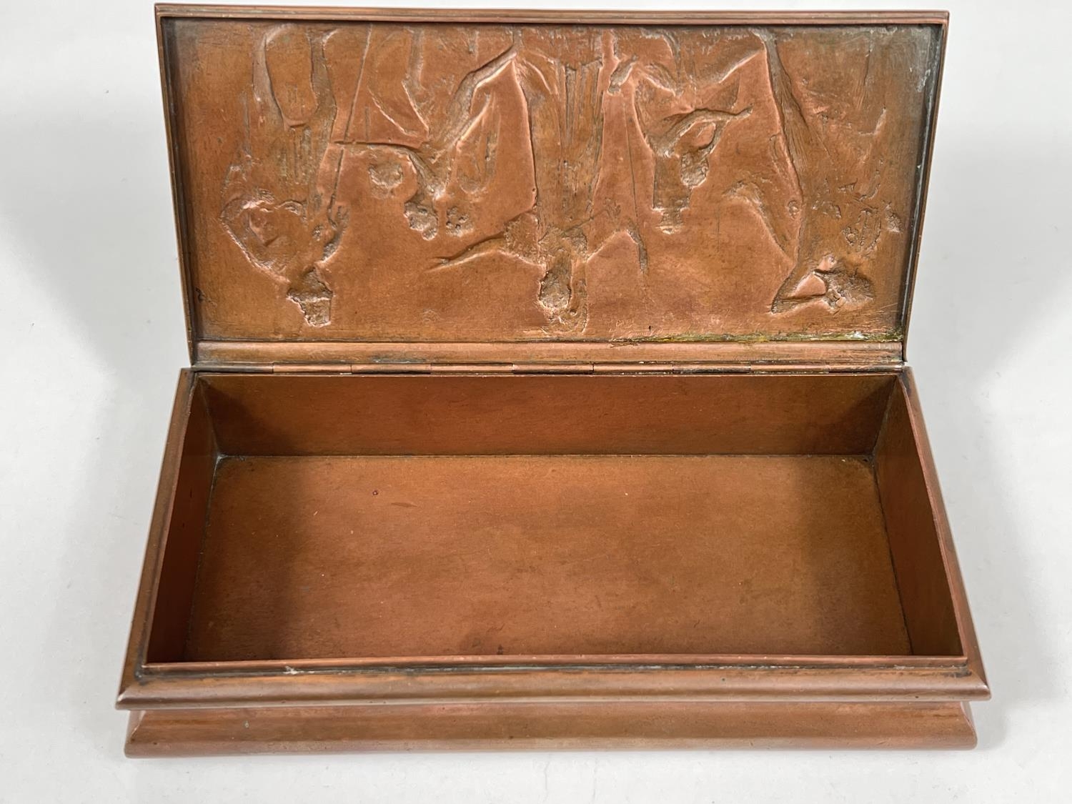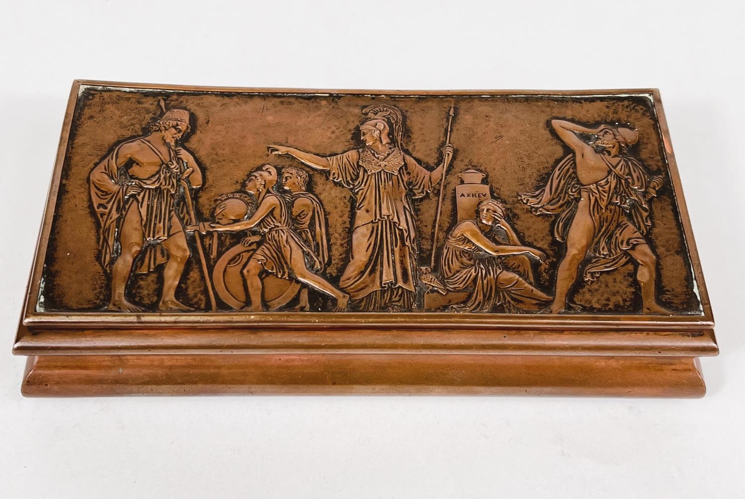 A copper box, originally silver plated, the lid depicting a classical scene with the goddess Athena