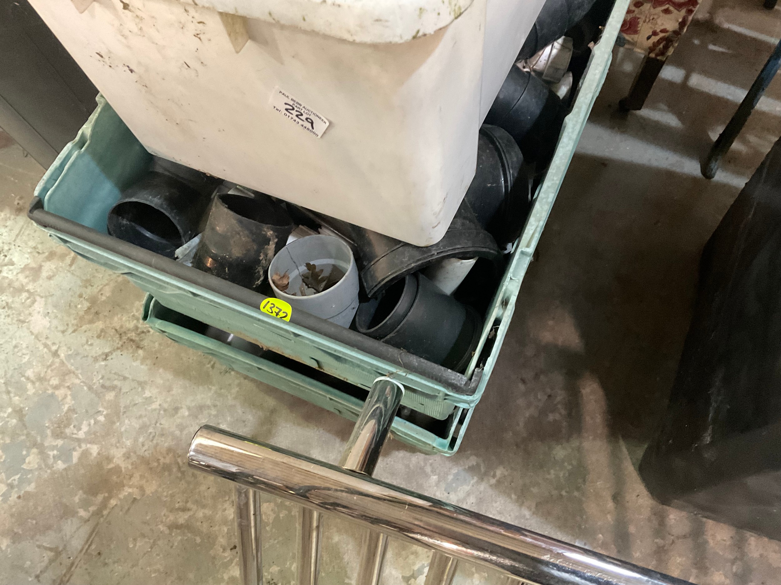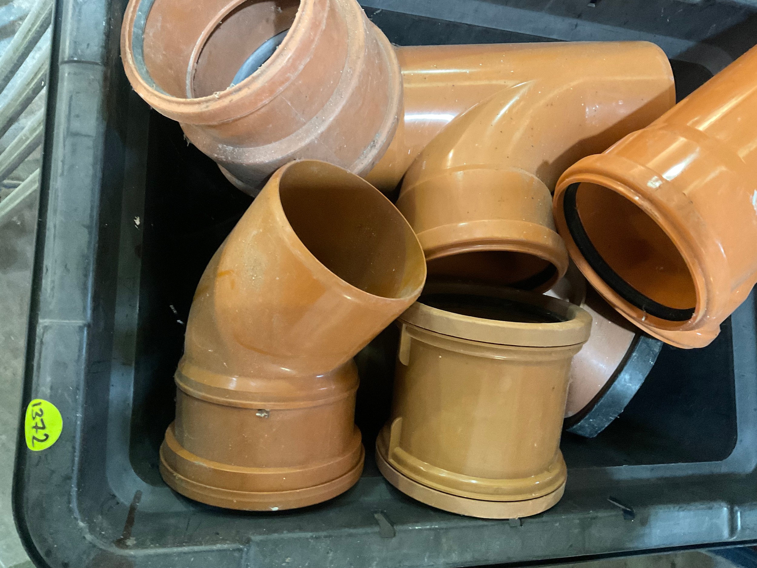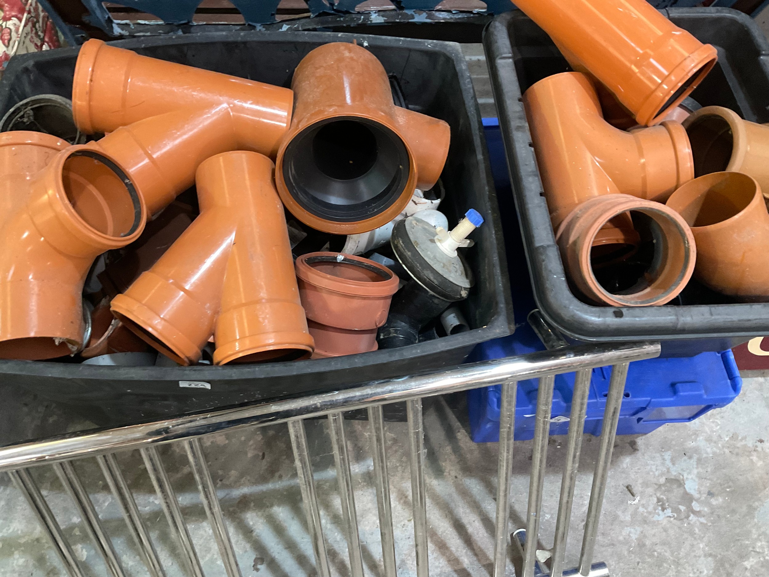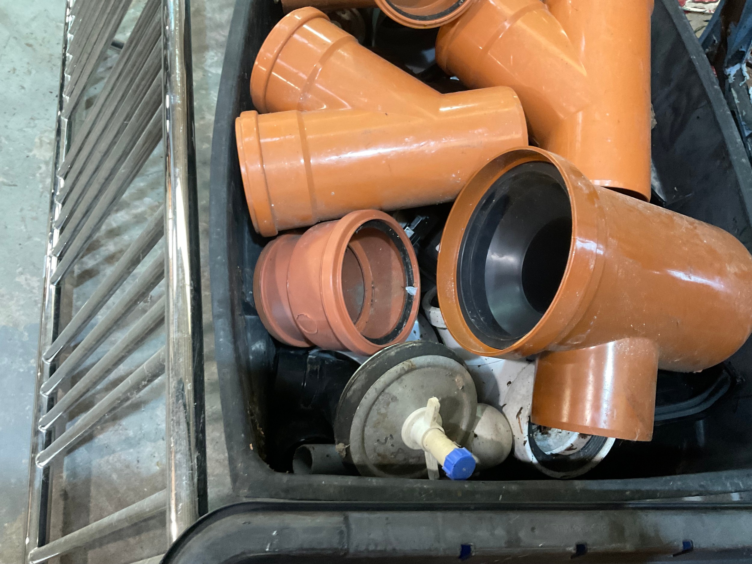 LARGE QTY OF PLASTIC DRAINAGE CONNECTING FITMENTS AND METAL RADIATOR