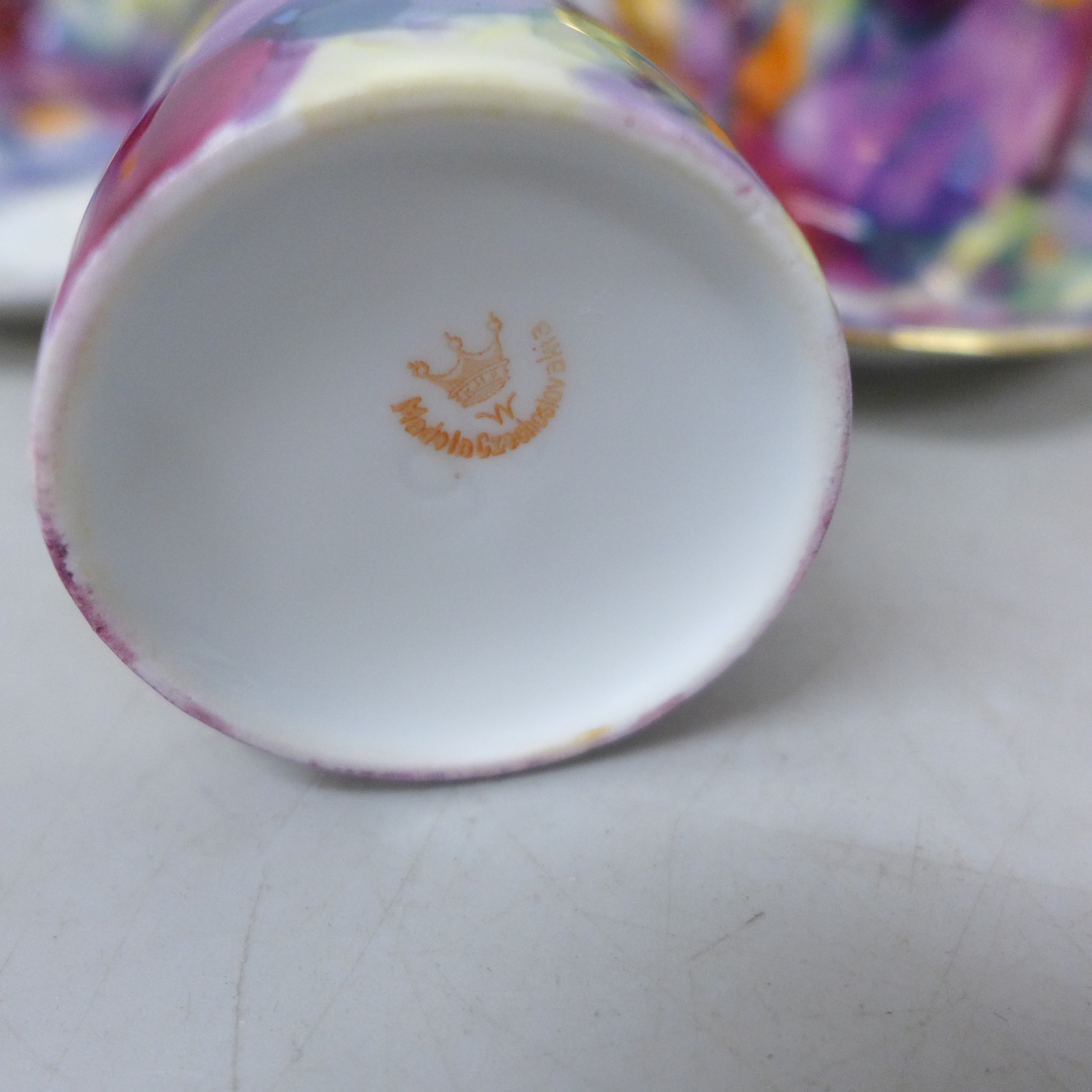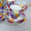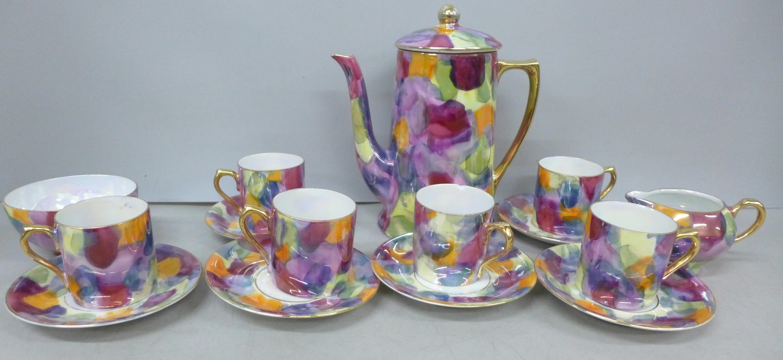 A Czechoslovakian porcelain six setting coffee service, fifteen pieces in total, one cup chipped