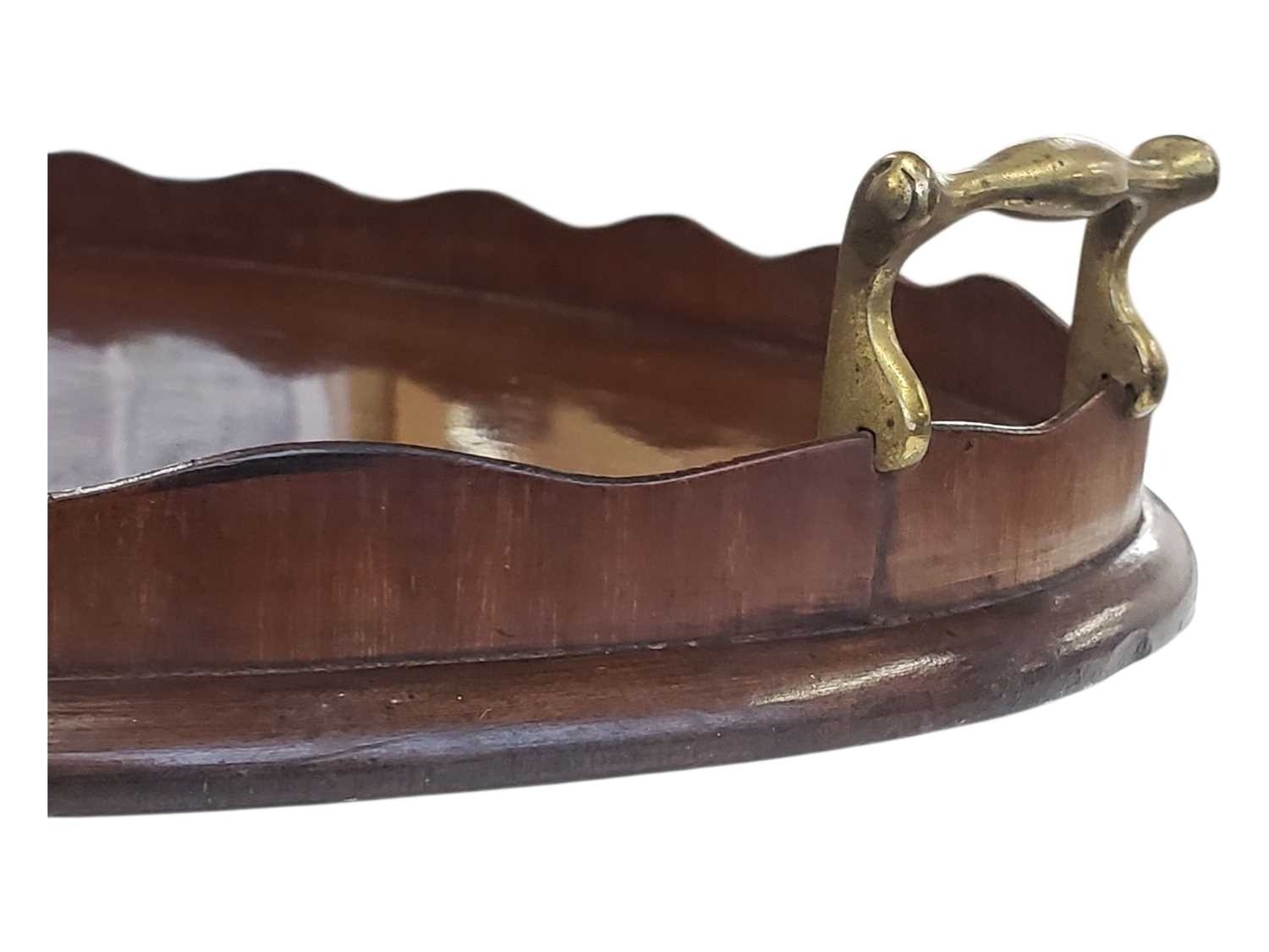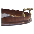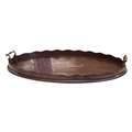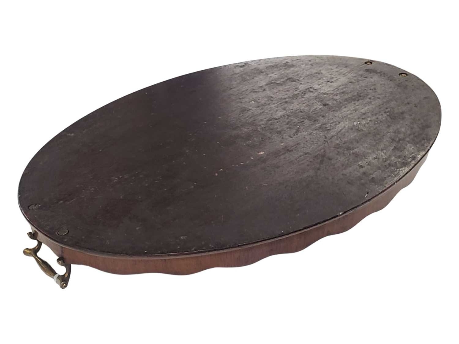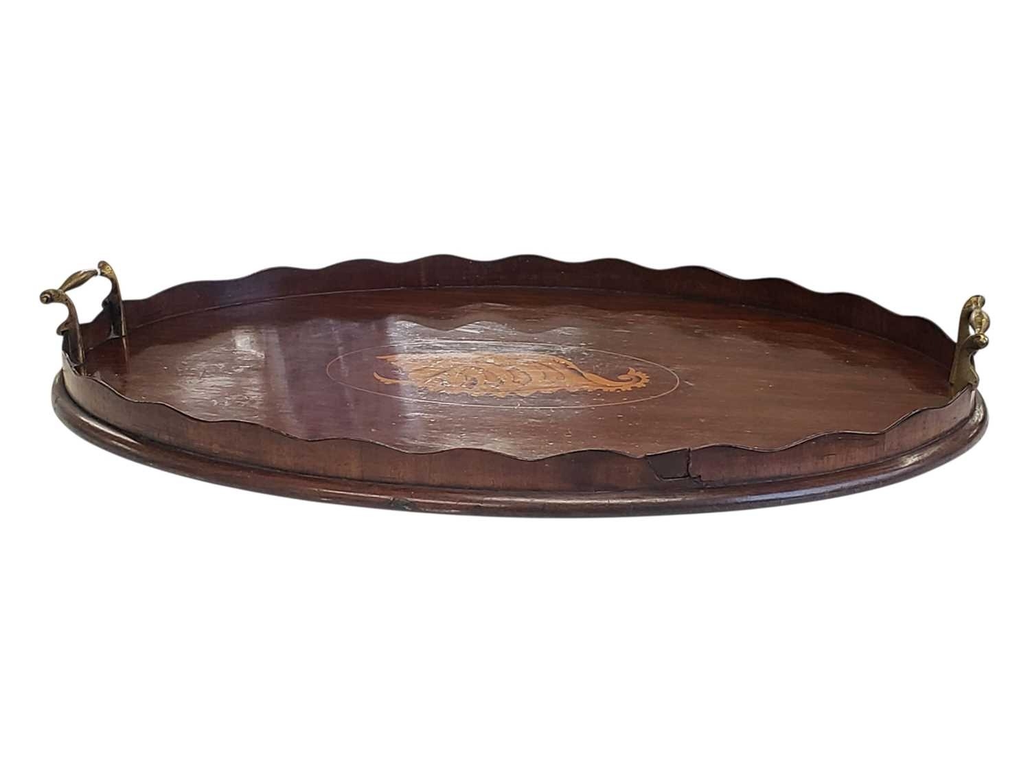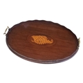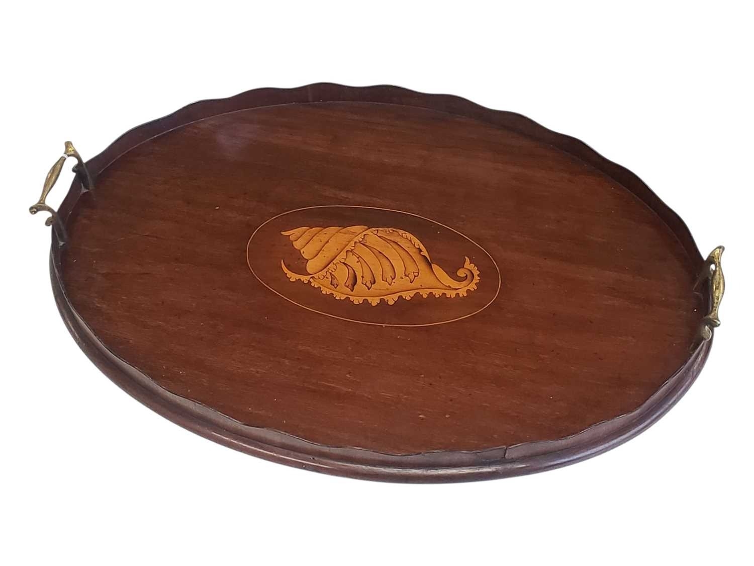 Victorian 19th century mahogany inlaid serving carry tray. Shell inlaid decoration to centre in oval form with pie crust edge, twin brass carry handles.