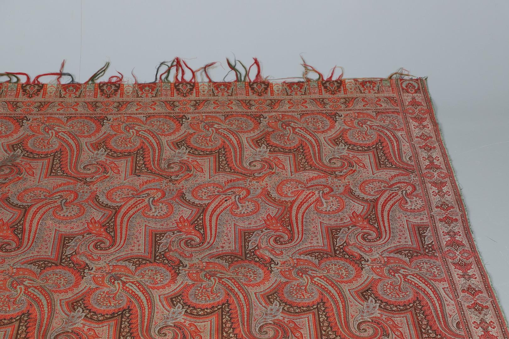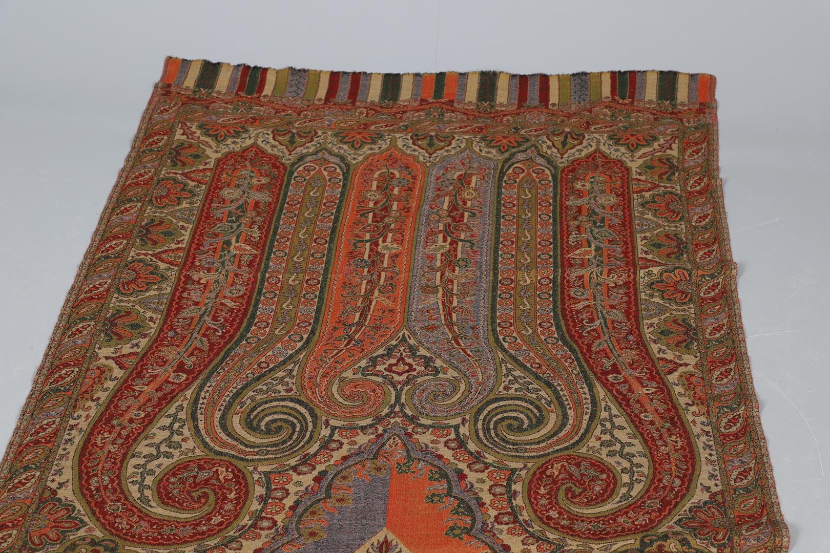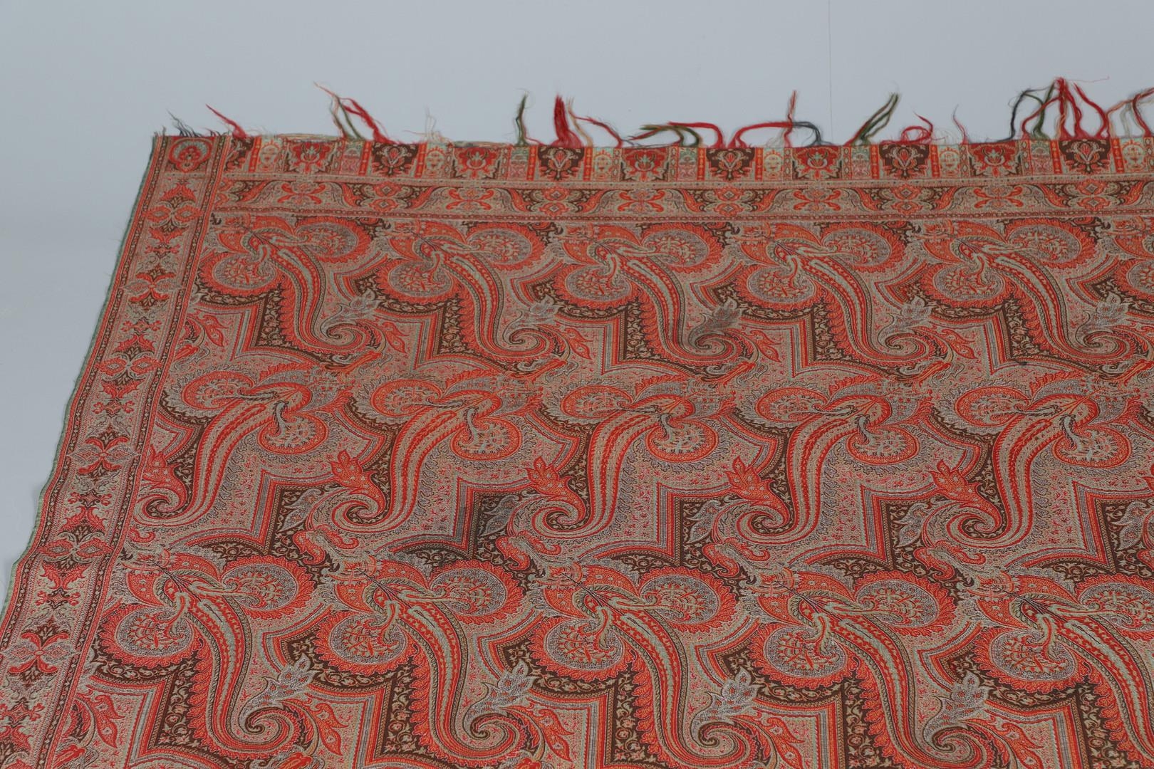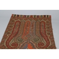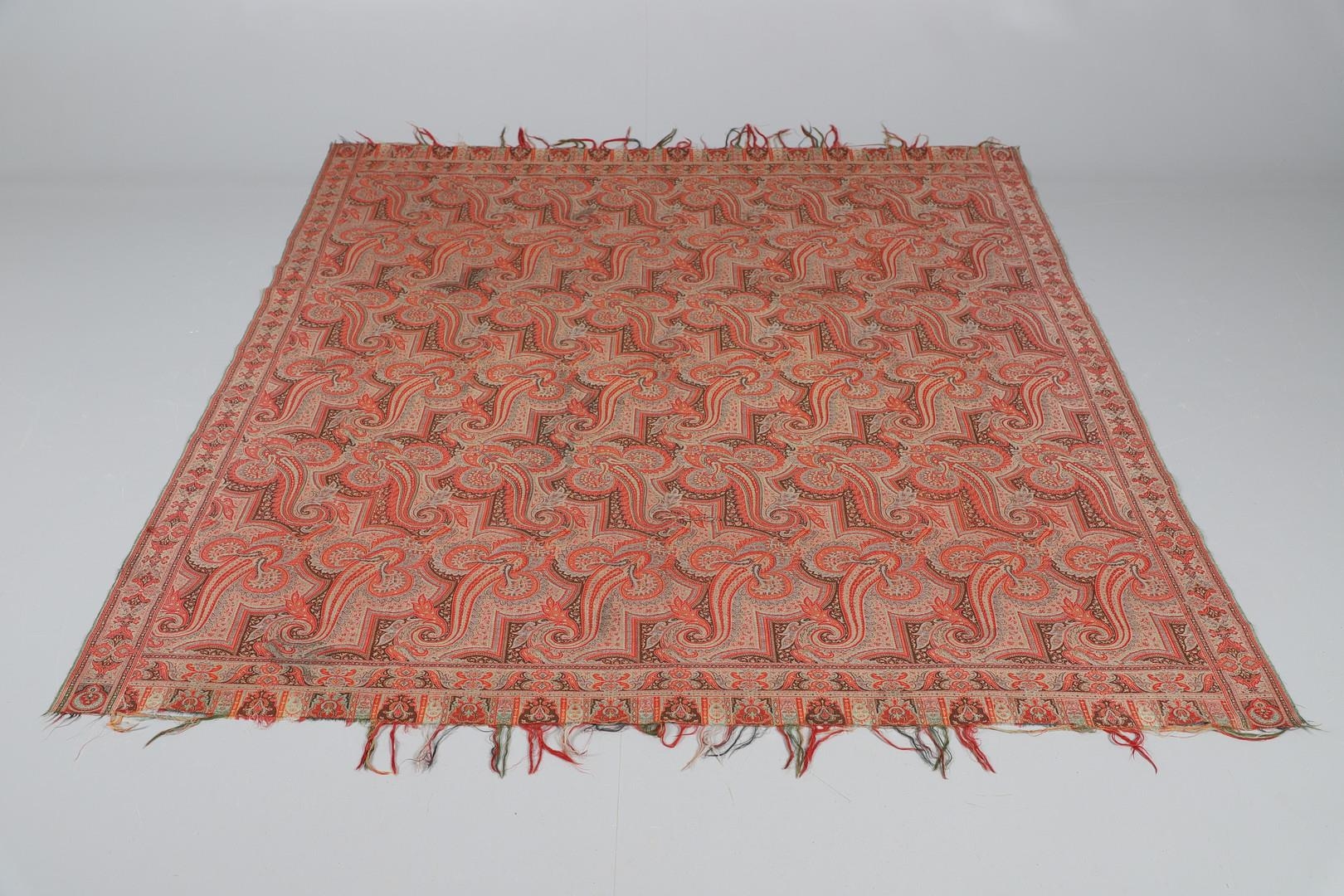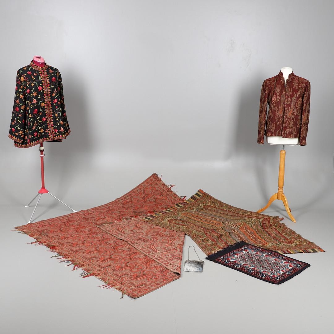 LATE 19THC PAISLEY SHAWL & VARIOUS TEXTILES. A late 19thc Paisley wool shawl, some damages to the edges and loss of tassels/fringes in places (170cms by 170cms), also with a wool shawl of a later date (208cms by 102cms), a black woollen crewelwork jacket, an early 20thc bead evening bag with white metal clasp/fastening, and a small wool panel (size 65cms by 50cms). *CR See online images.
