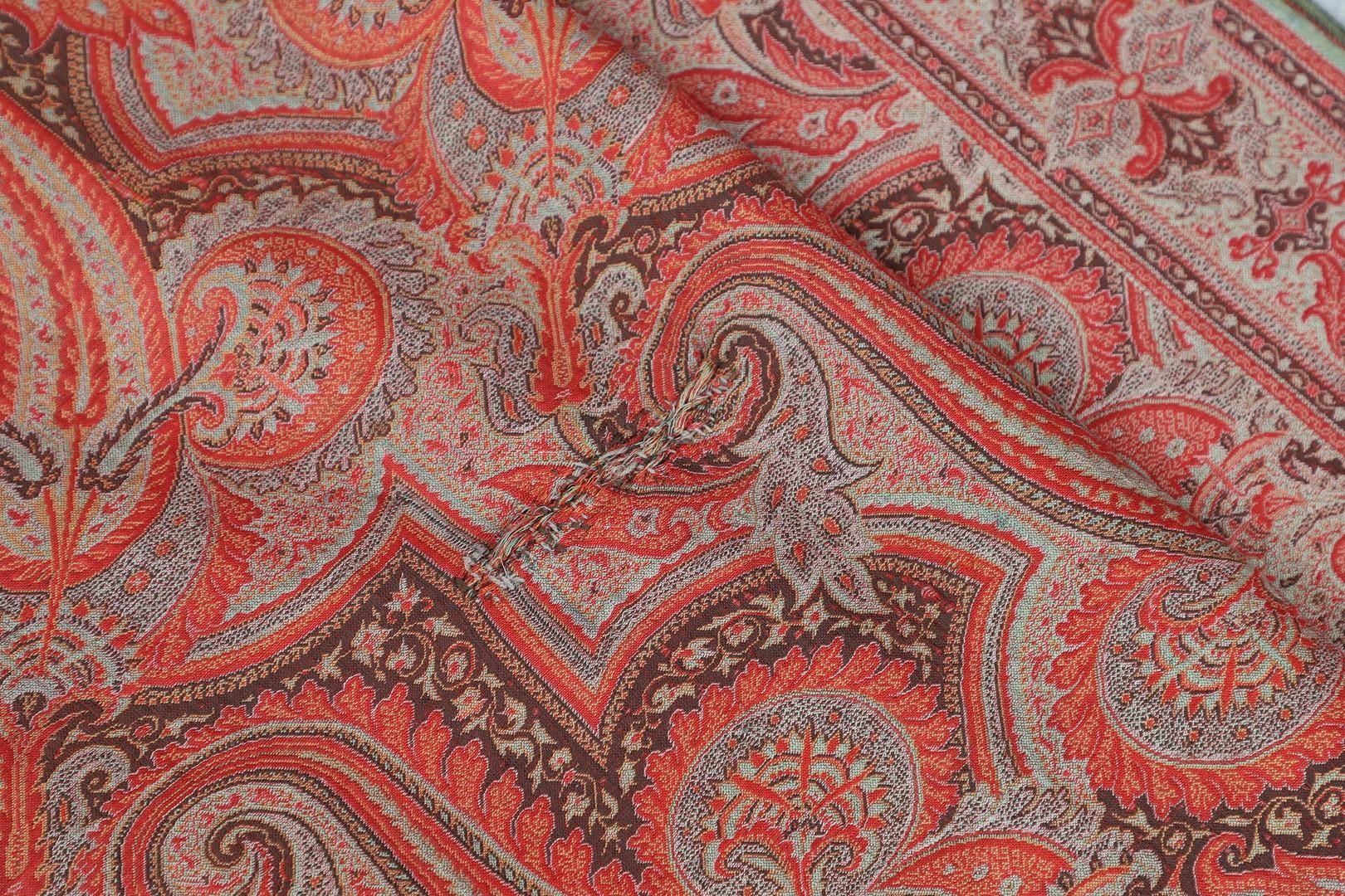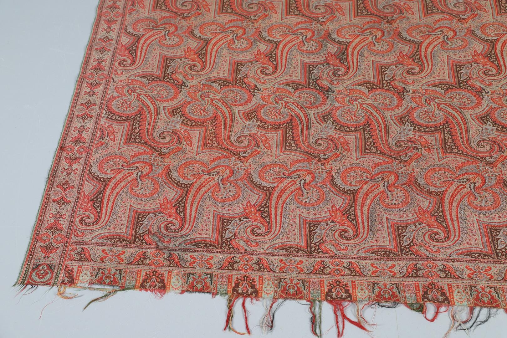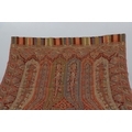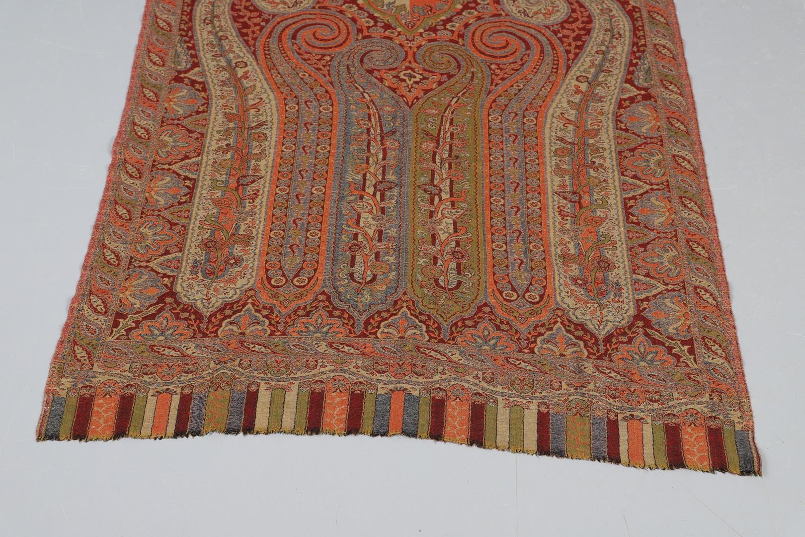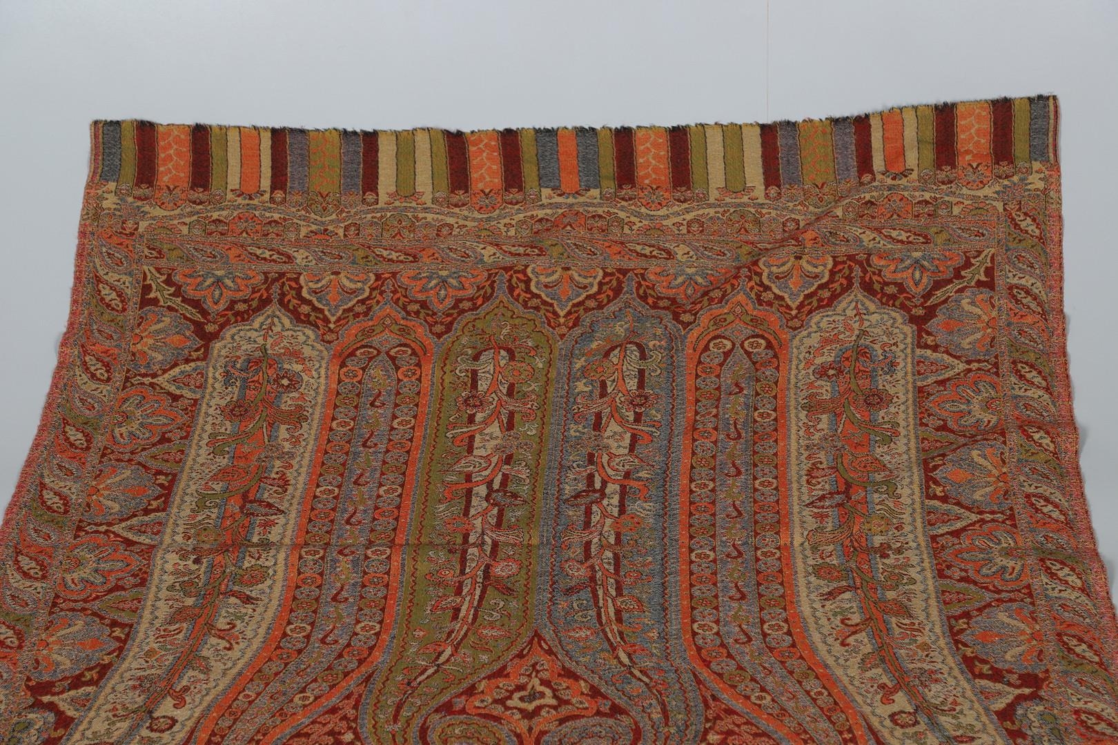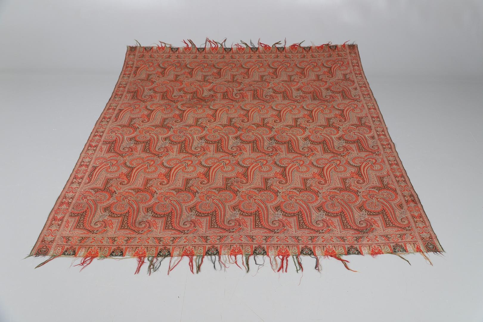 LATE 19THC PAISLEY SHAWL & VARIOUS TEXTILES. A late 19thc Paisley wool shawl, some damages to the edges and loss of tassels/fringes in places (170cms by 170cms), also with a wool shawl of a later date (208cms by 102cms), a black woollen crewelwork jacket, an early 20thc bead evening bag with white metal clasp/fastening, and a small wool panel (size 65cms by 50cms). *CR See online images.