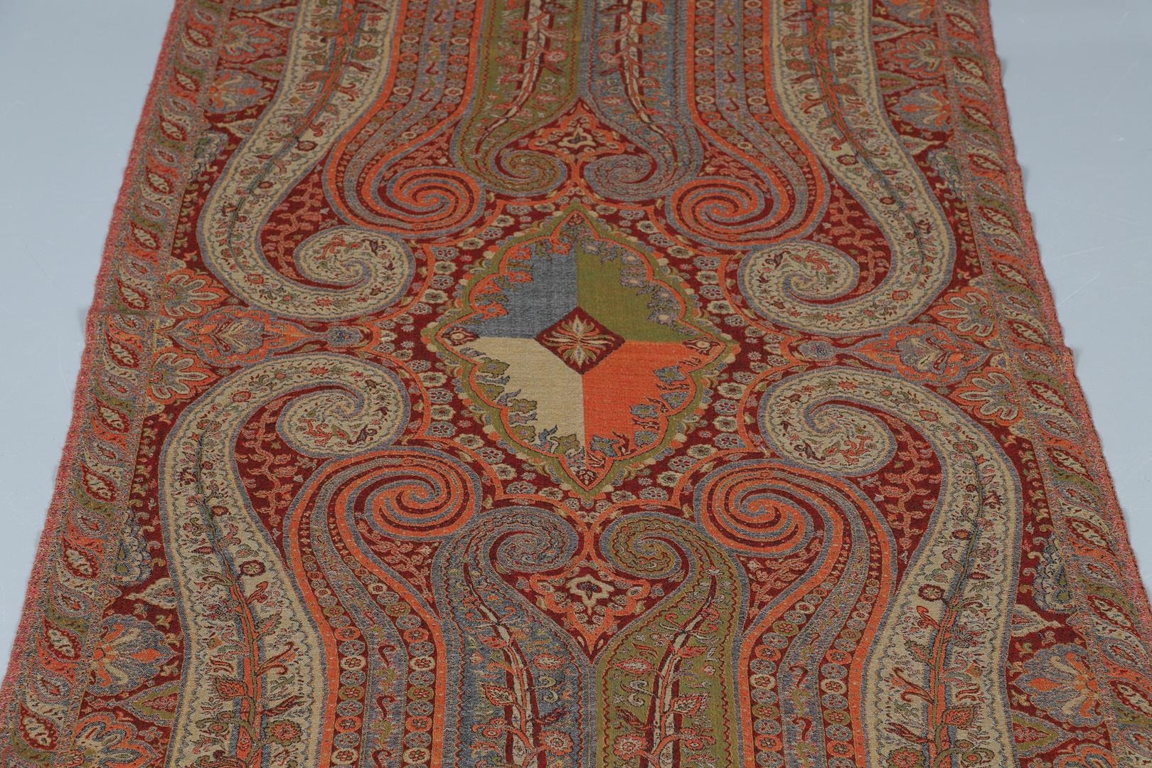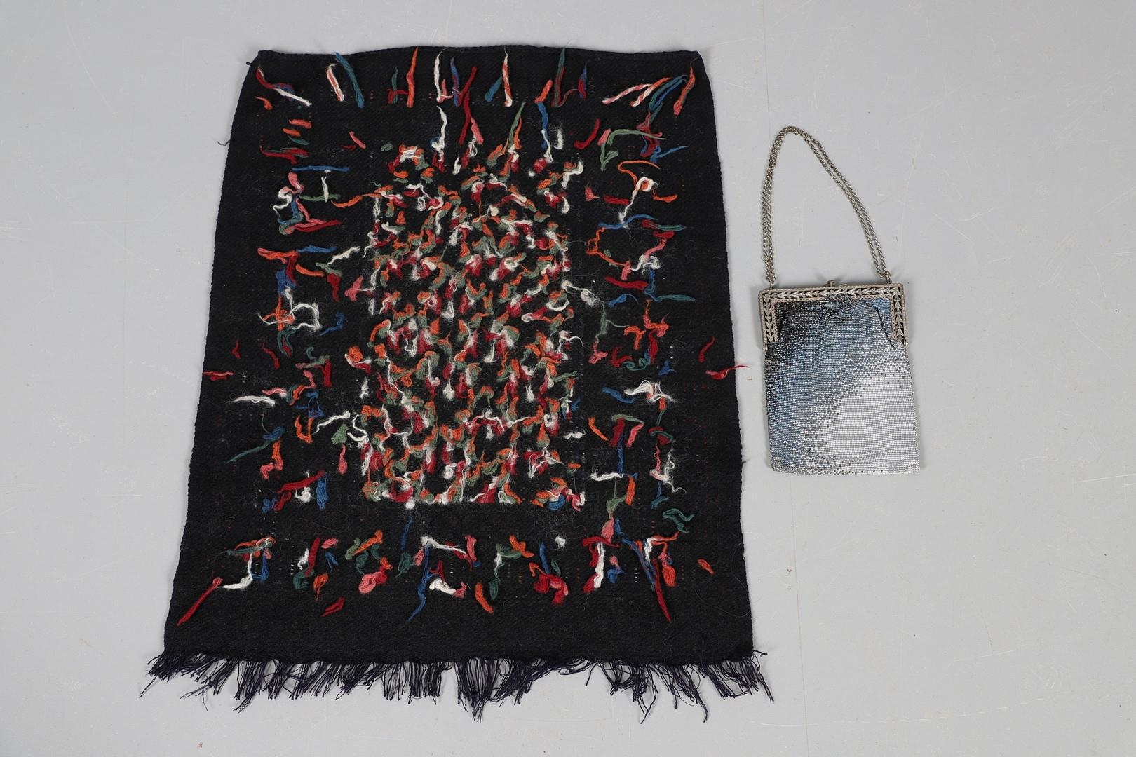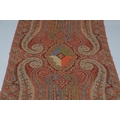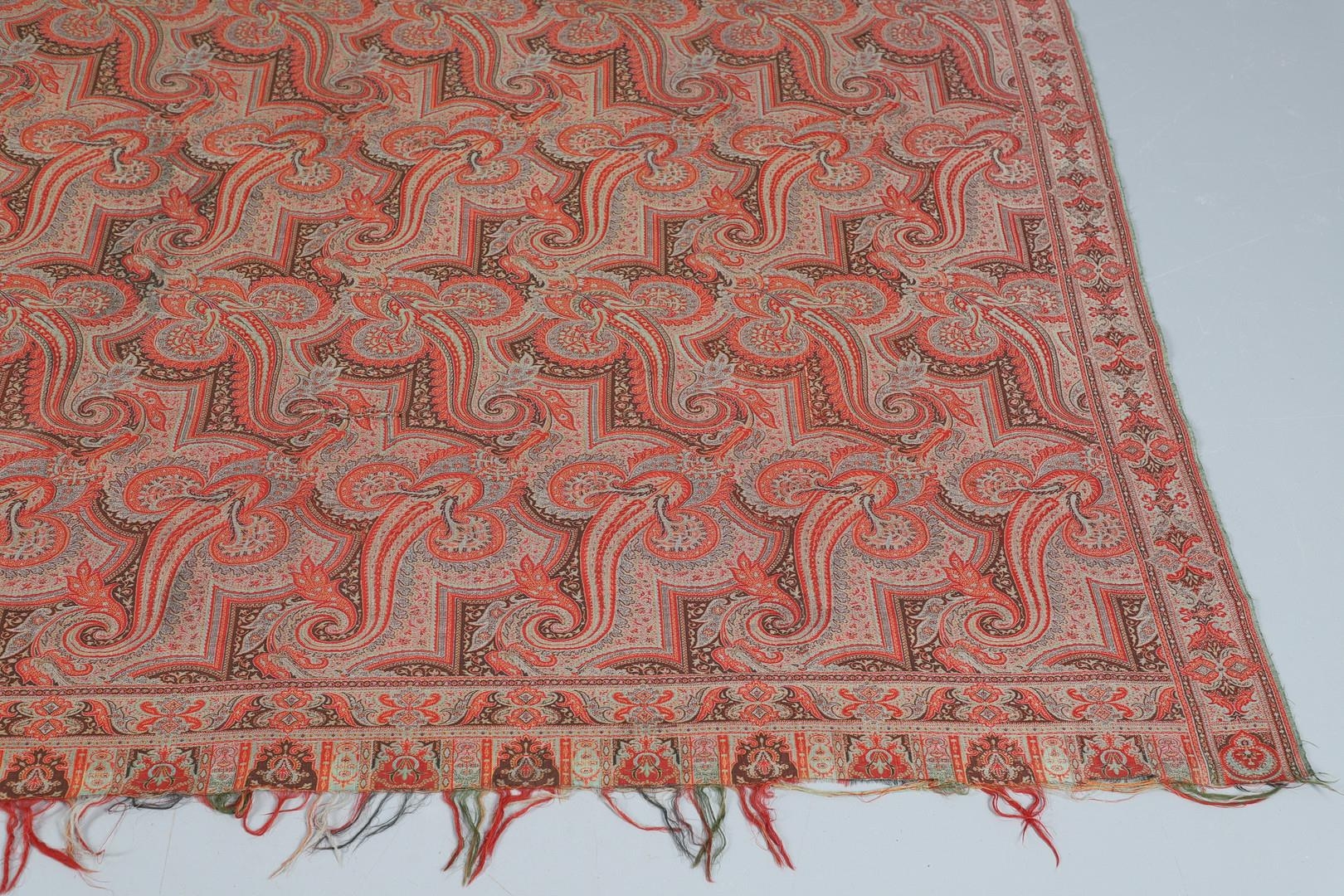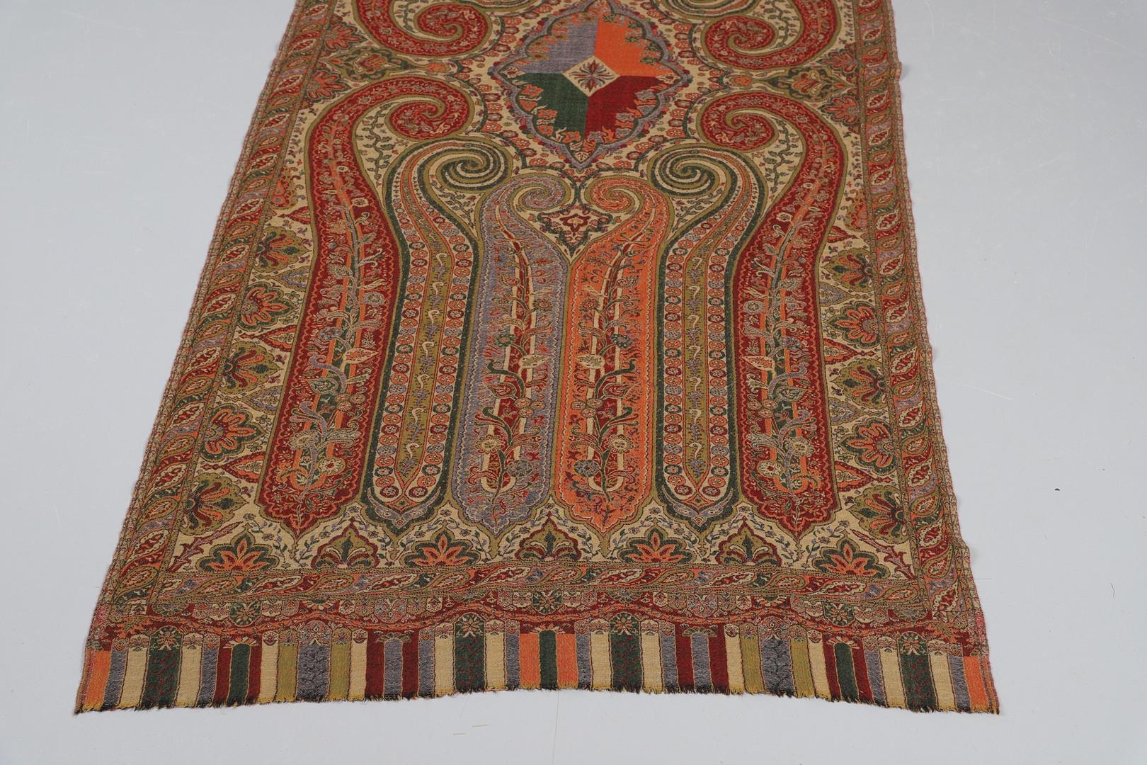 LATE 19THC PAISLEY SHAWL & VARIOUS TEXTILES. A late 19thc Paisley wool shawl, some damages to the edges and loss of tassels/fringes in places (170cms by 170cms), also with a wool shawl of a later date (208cms by 102cms), a black woollen crewelwork jacket, an early 20thc bead evening bag with white metal clasp/fastening, and a small wool panel (size 65cms by 50cms). *CR See online images.