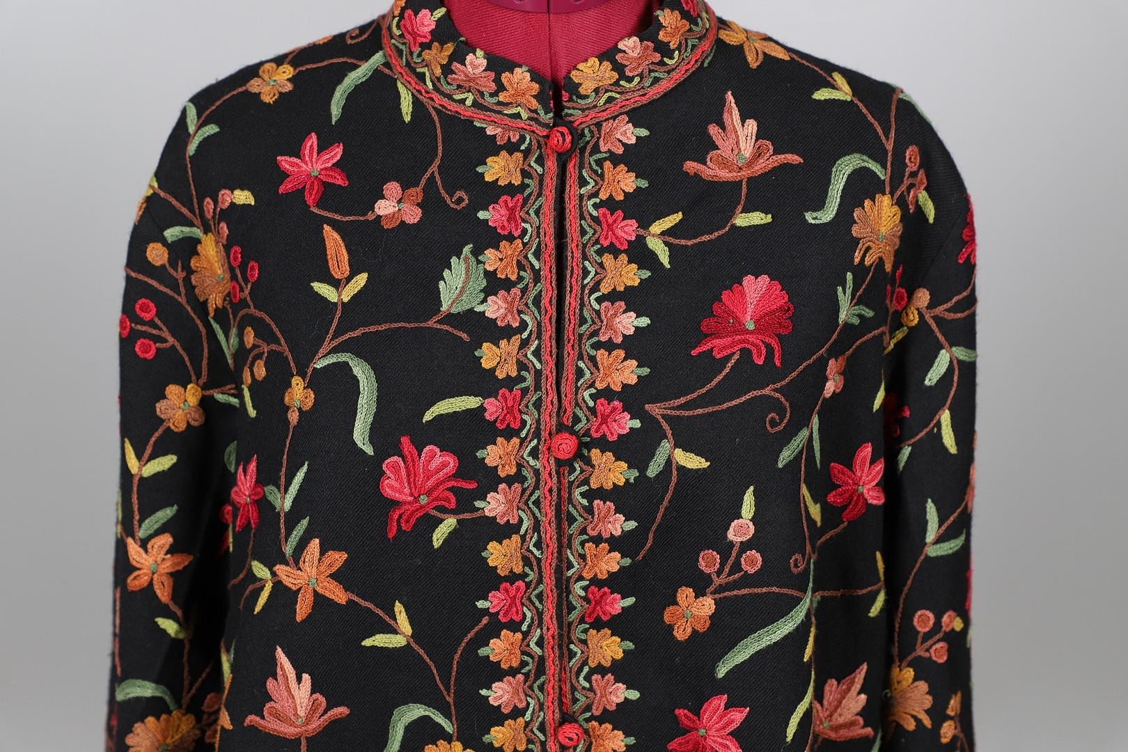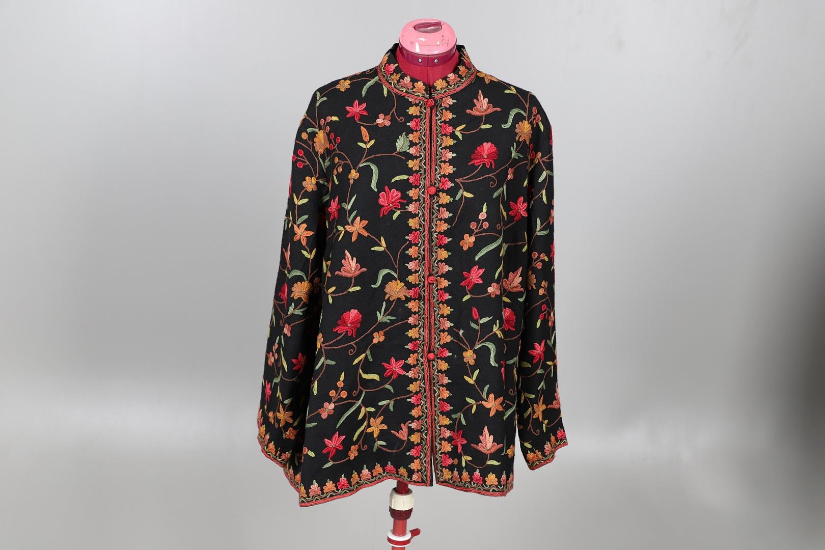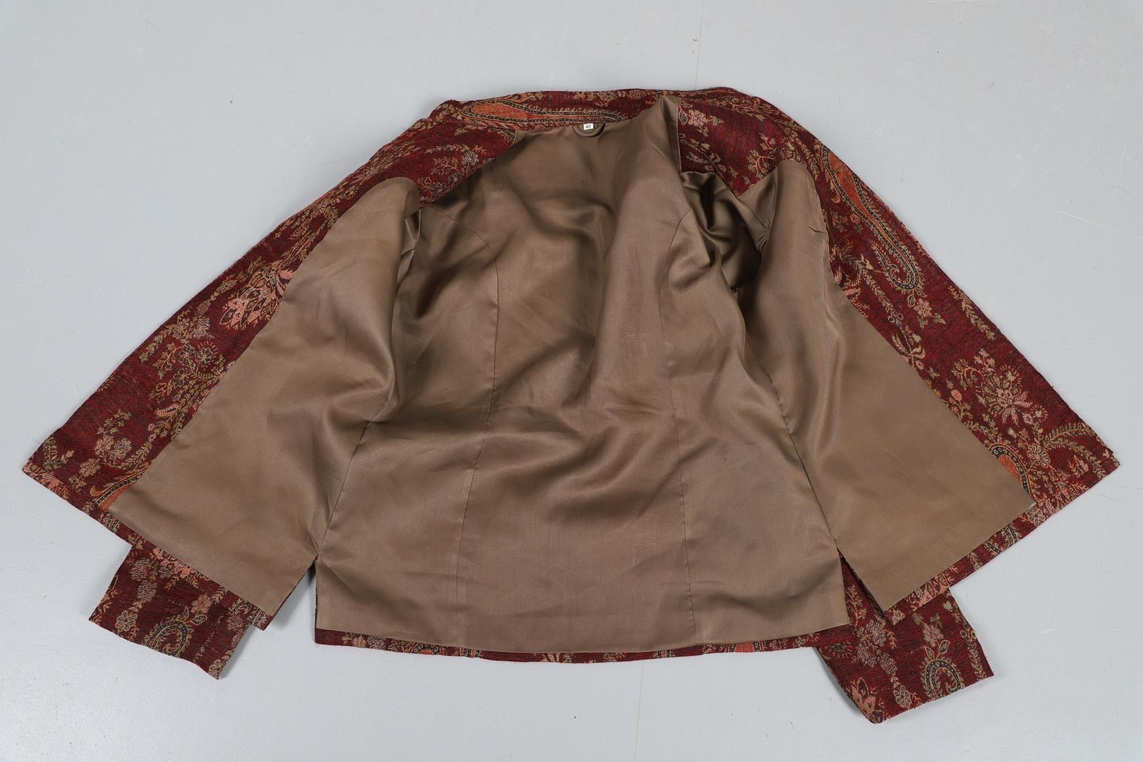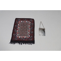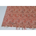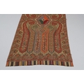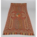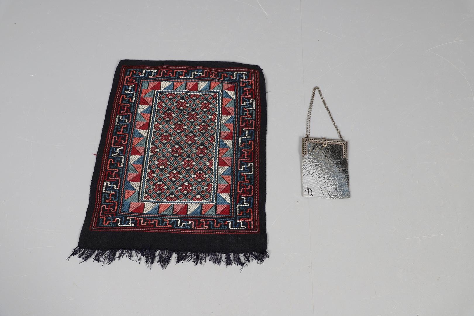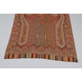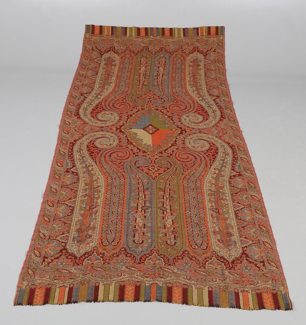 LATE 19THC PAISLEY SHAWL & VARIOUS TEXTILES. A late 19thc Paisley wool shawl, some damages to the edges and loss of tassels/fringes in places (170cms by 170cms), also with a wool shawl of a later date (208cms by 102cms), a black woollen crewelwork jacket, an early 20thc bead evening bag with white metal clasp/fastening, and a small wool panel (size 65cms by 50cms). *CR See online images.