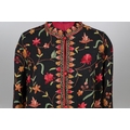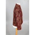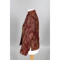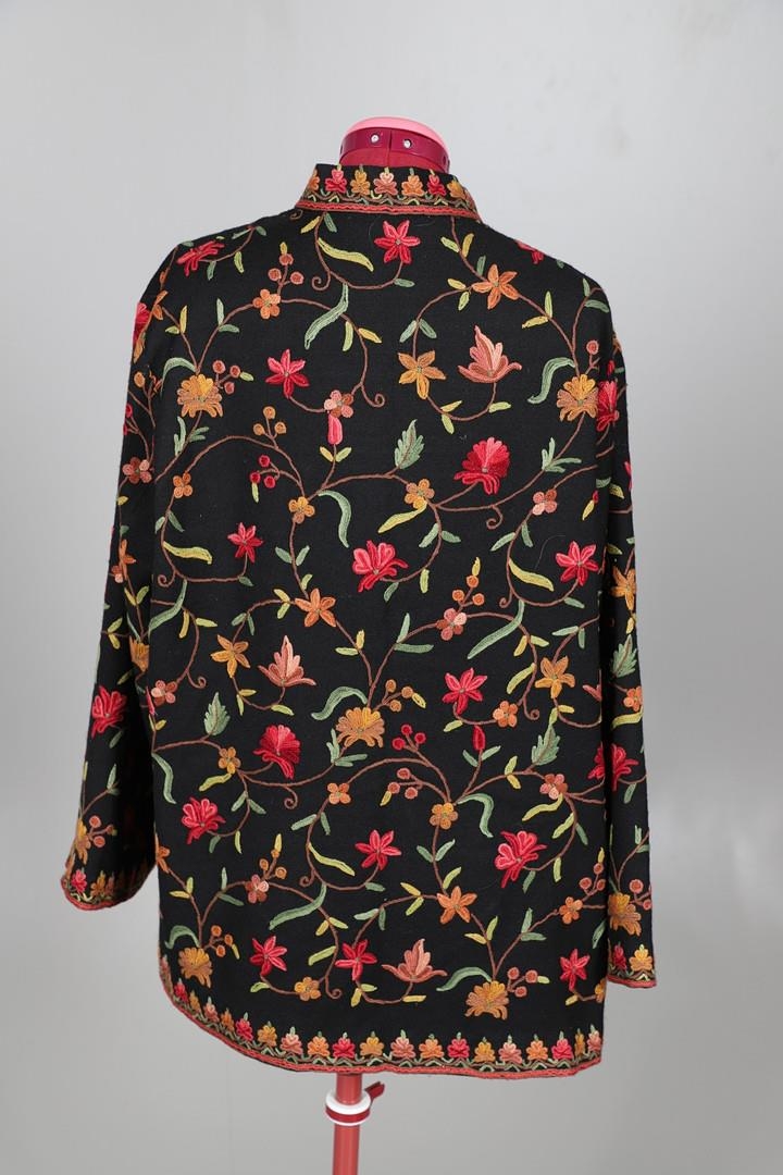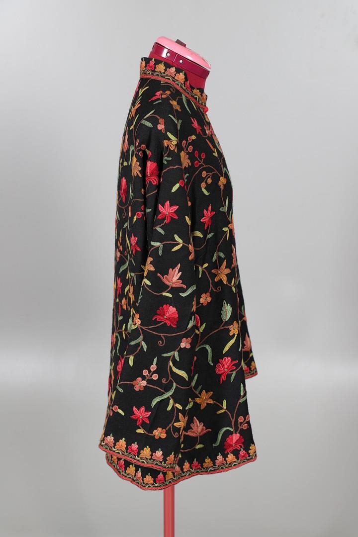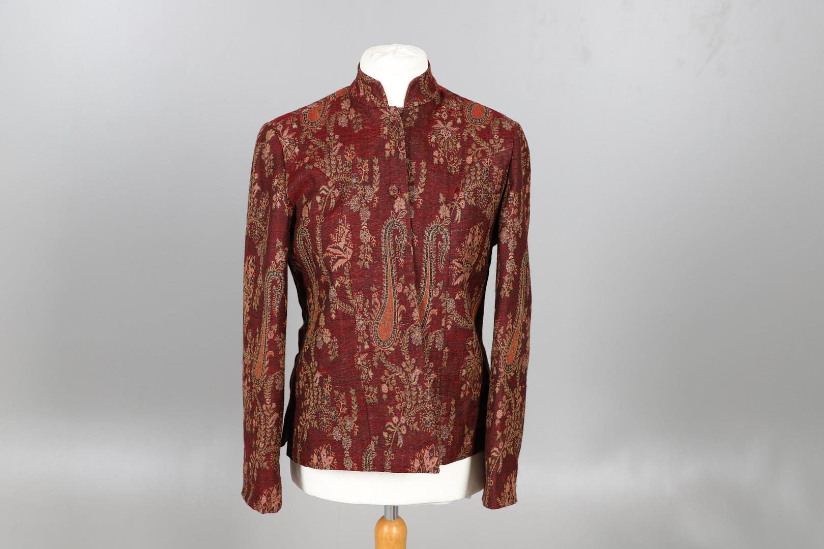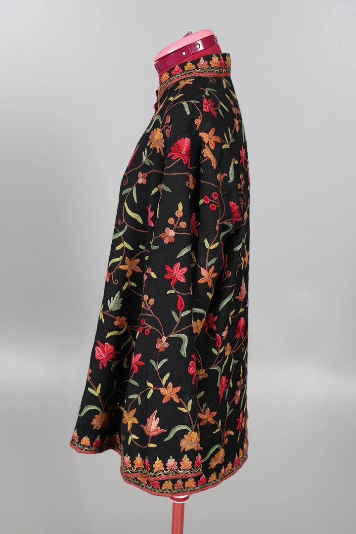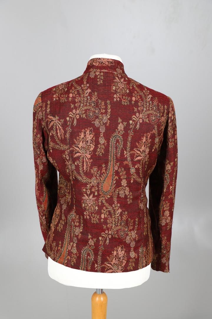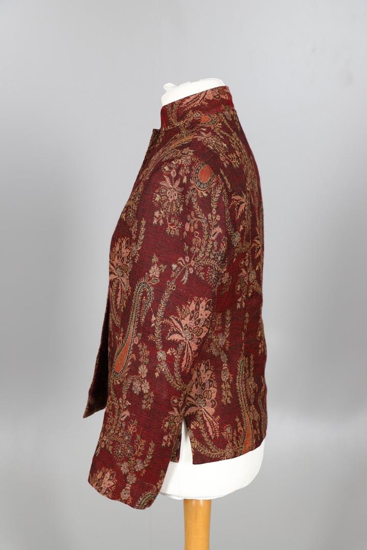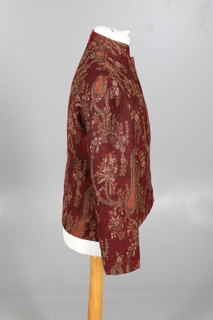 LATE 19THC PAISLEY SHAWL & VARIOUS TEXTILES. A late 19thc Paisley wool shawl, some damages to the edges and loss of tassels/fringes in places (170cms by 170cms), also with a wool shawl of a later date (208cms by 102cms), a black woollen crewelwork jacket, an early 20thc bead evening bag with white metal clasp/fastening, and a small wool panel (size 65cms by 50cms). *CR See online images.