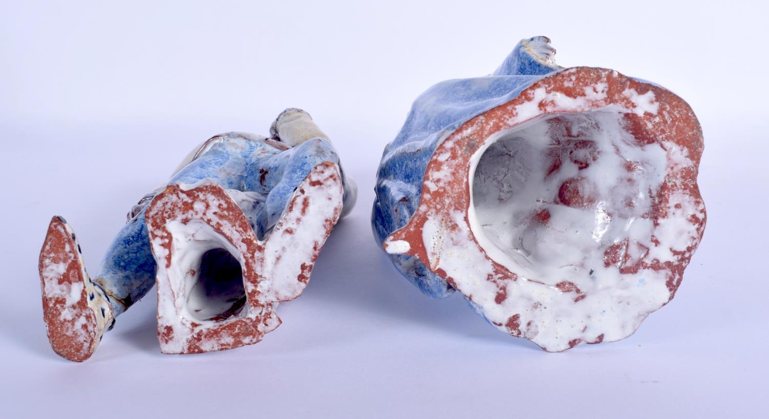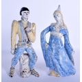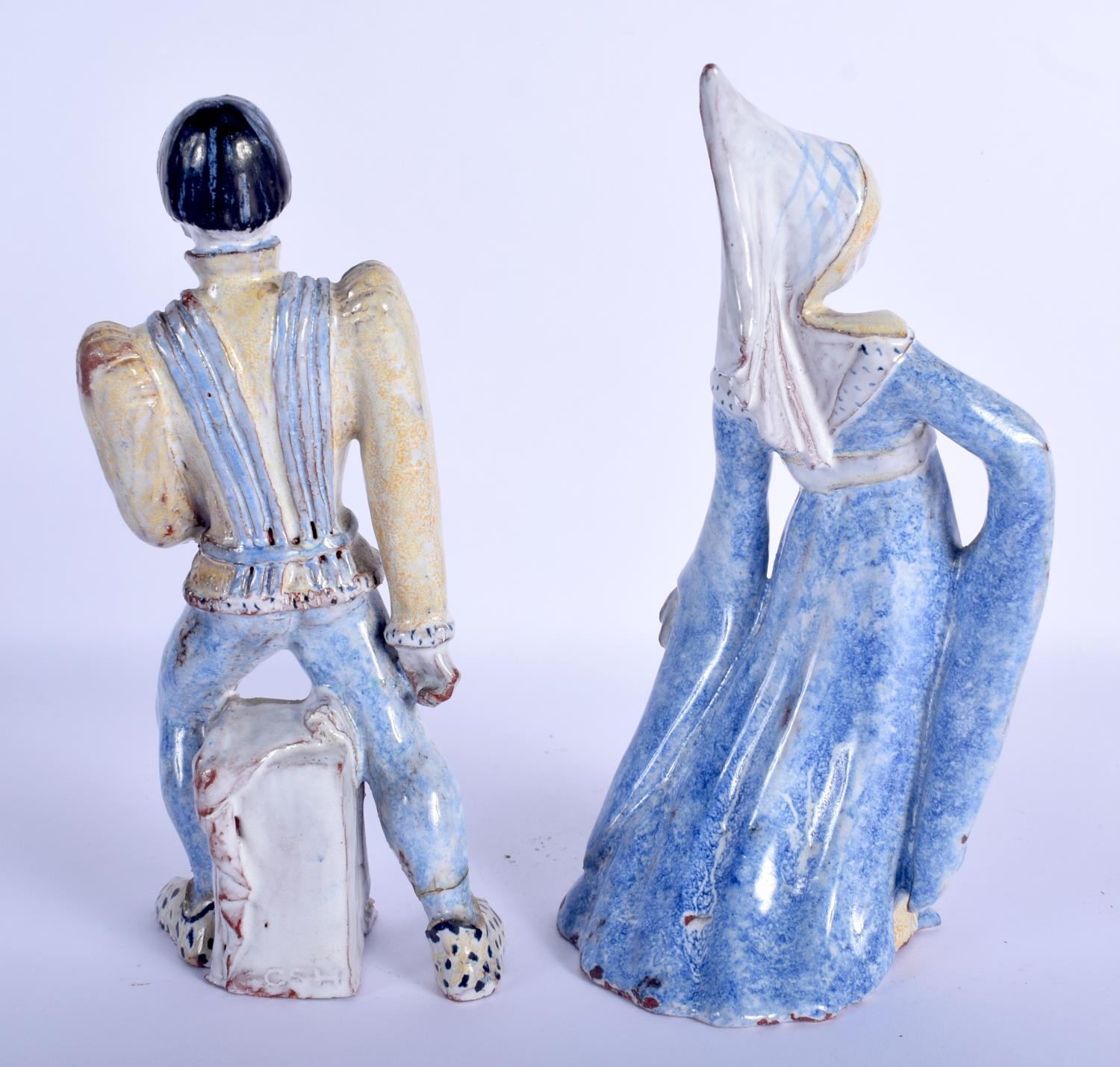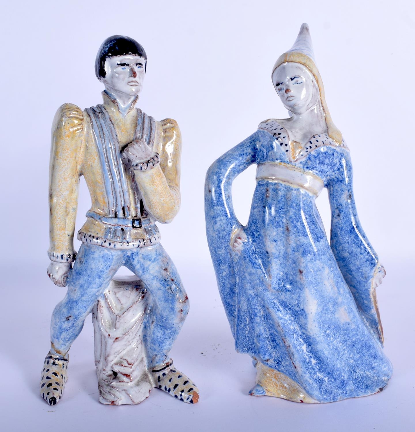 A PAIR OF CONTINENTAL FAIENCE GLAZED POTTERY FIGURES modelled as theatrical characters. 22 cm high.