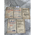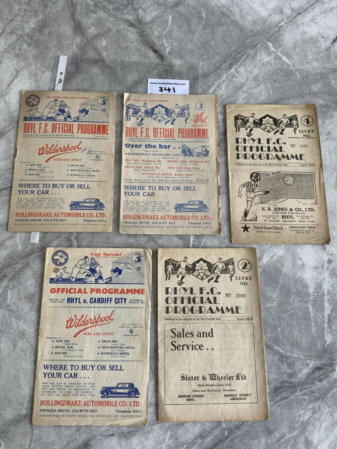 Rhyl Home Football Programmes: 52/53 Cardiff City WCSF, Llandudno Junction, 51/52 Holywell Town Coast Cup wear to edge, 49/50 Flint Town Cookson Cup and 48/49 Wrexham Welsh Cup. Overall good. (5)