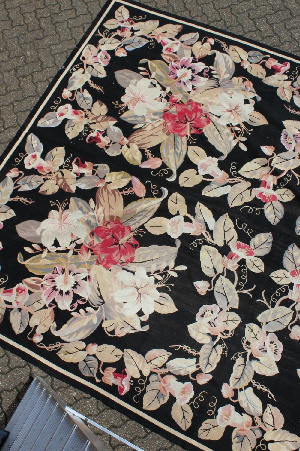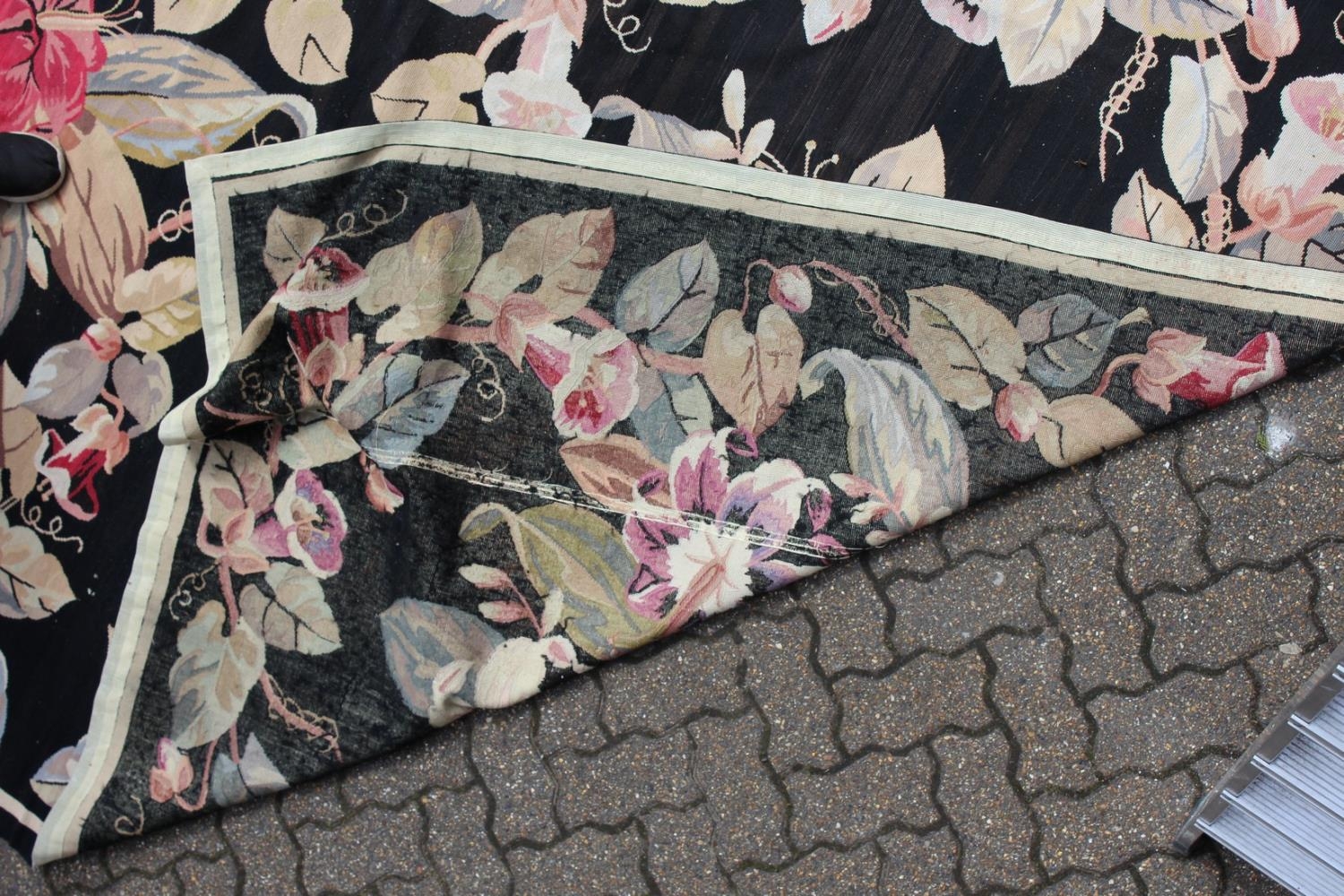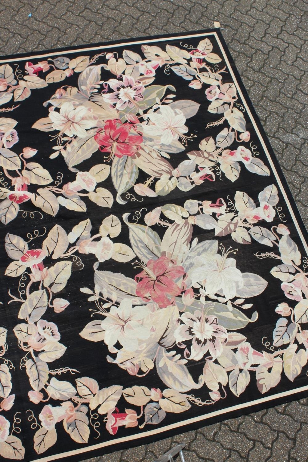 A LARGE ABUSSON STYLE TAPESTRY WALL HANGING, black ground, with floral decoration.