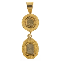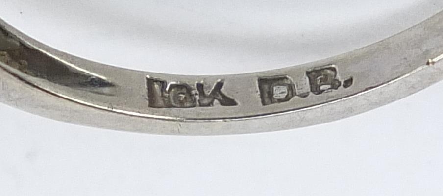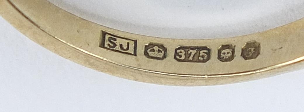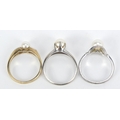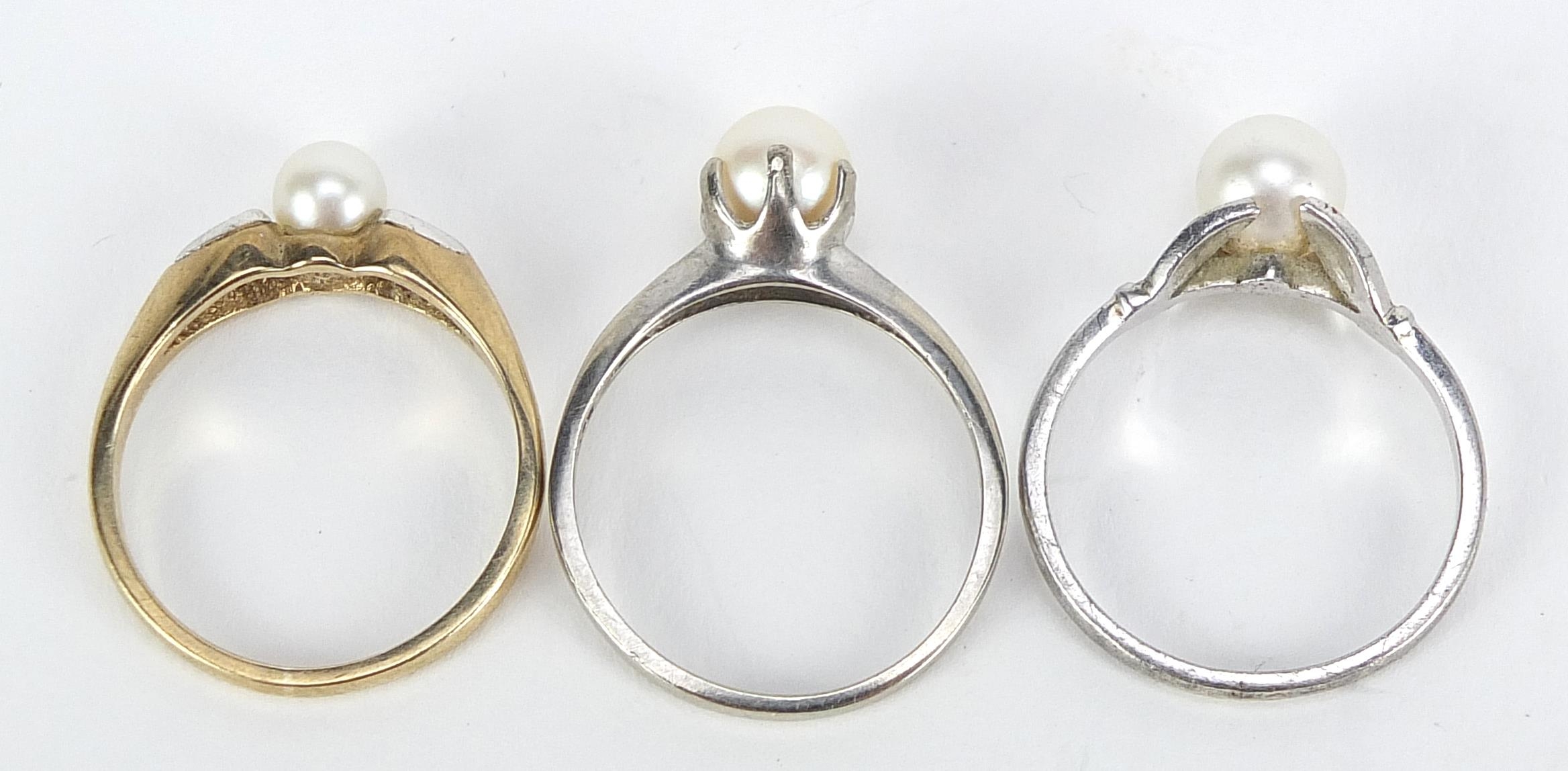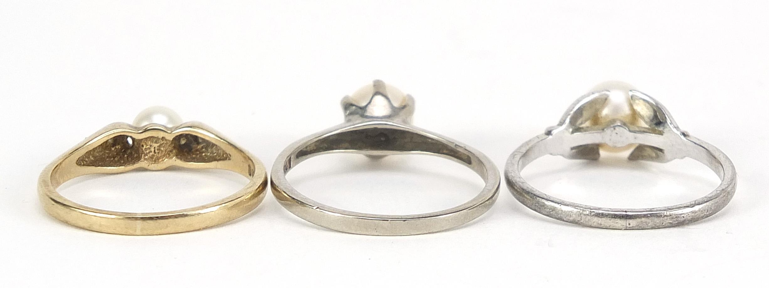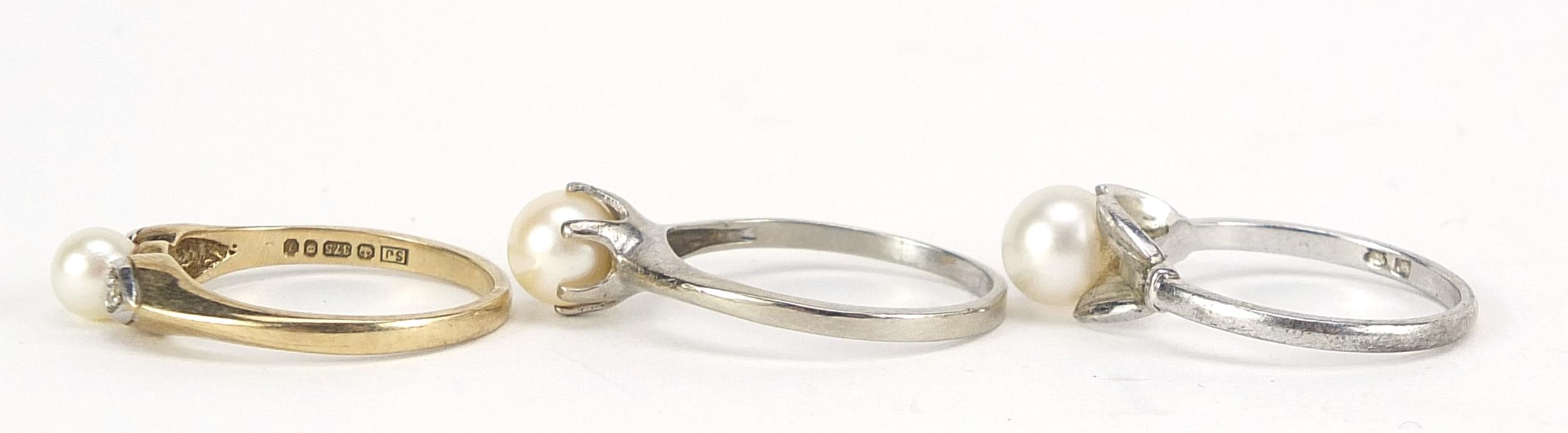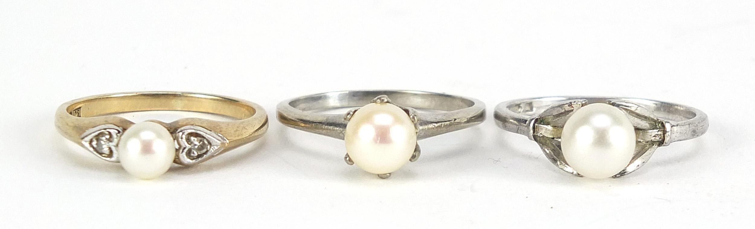 Three 9ct gold pearl rings including one with diamond shoulders, sizes L and M, total 5.6g