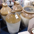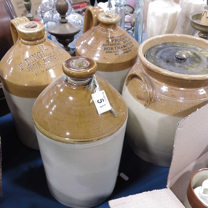 Three stoneware flagons, Dingle & Sons, Worcester, E P Booker, Northampton, and a twin handled stone ware jar with matched lid. (4)