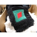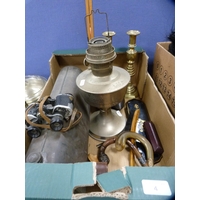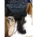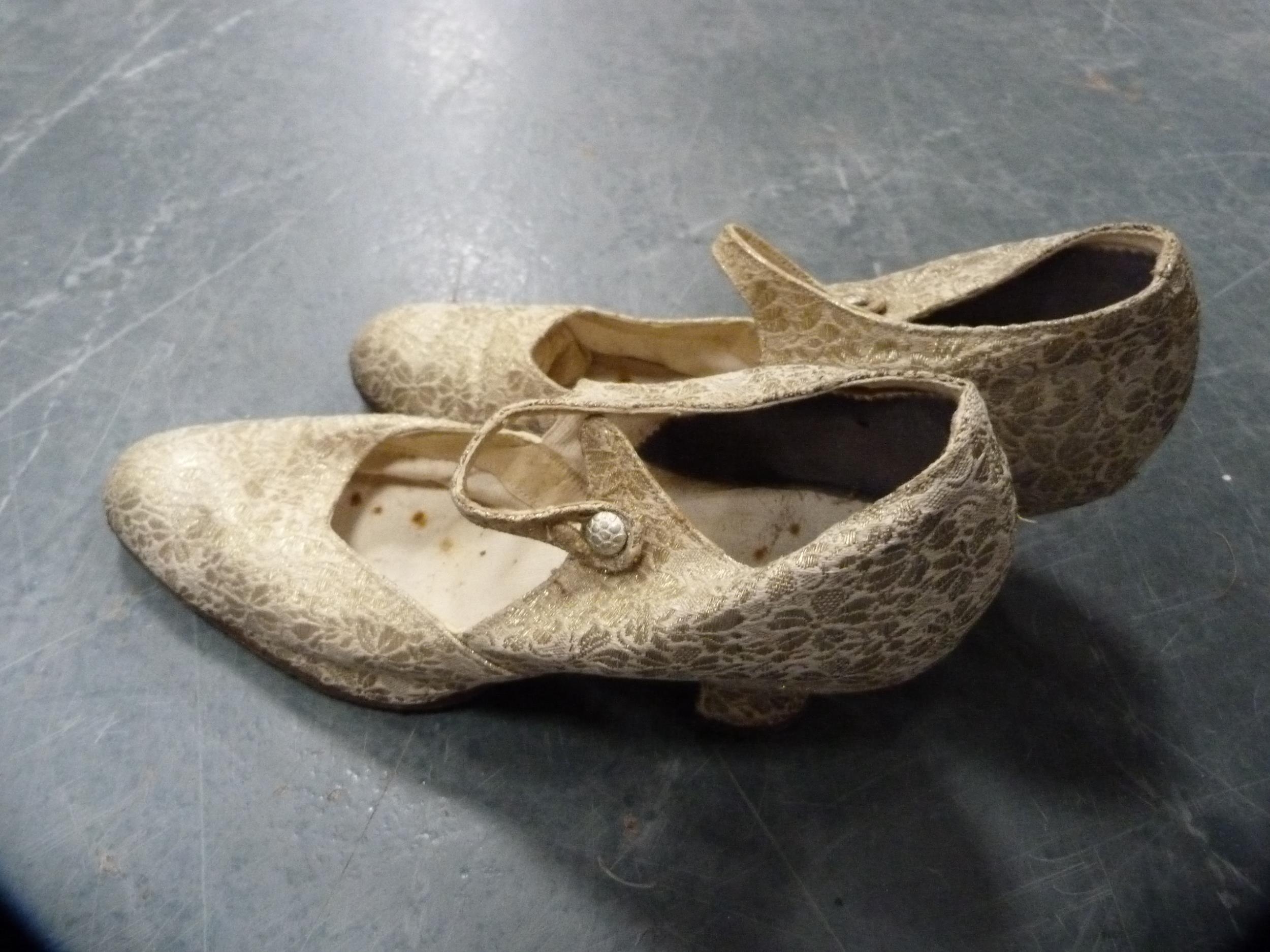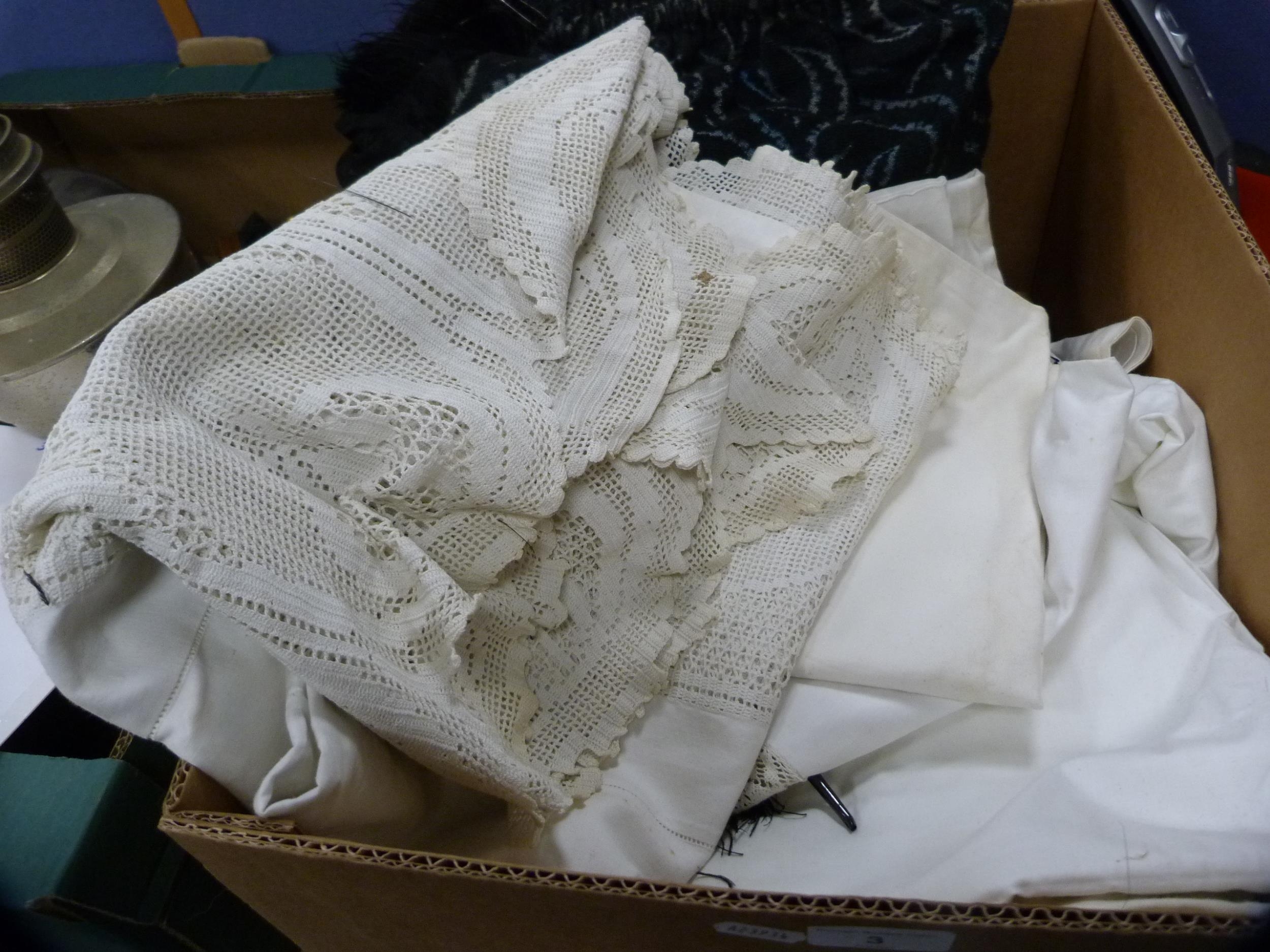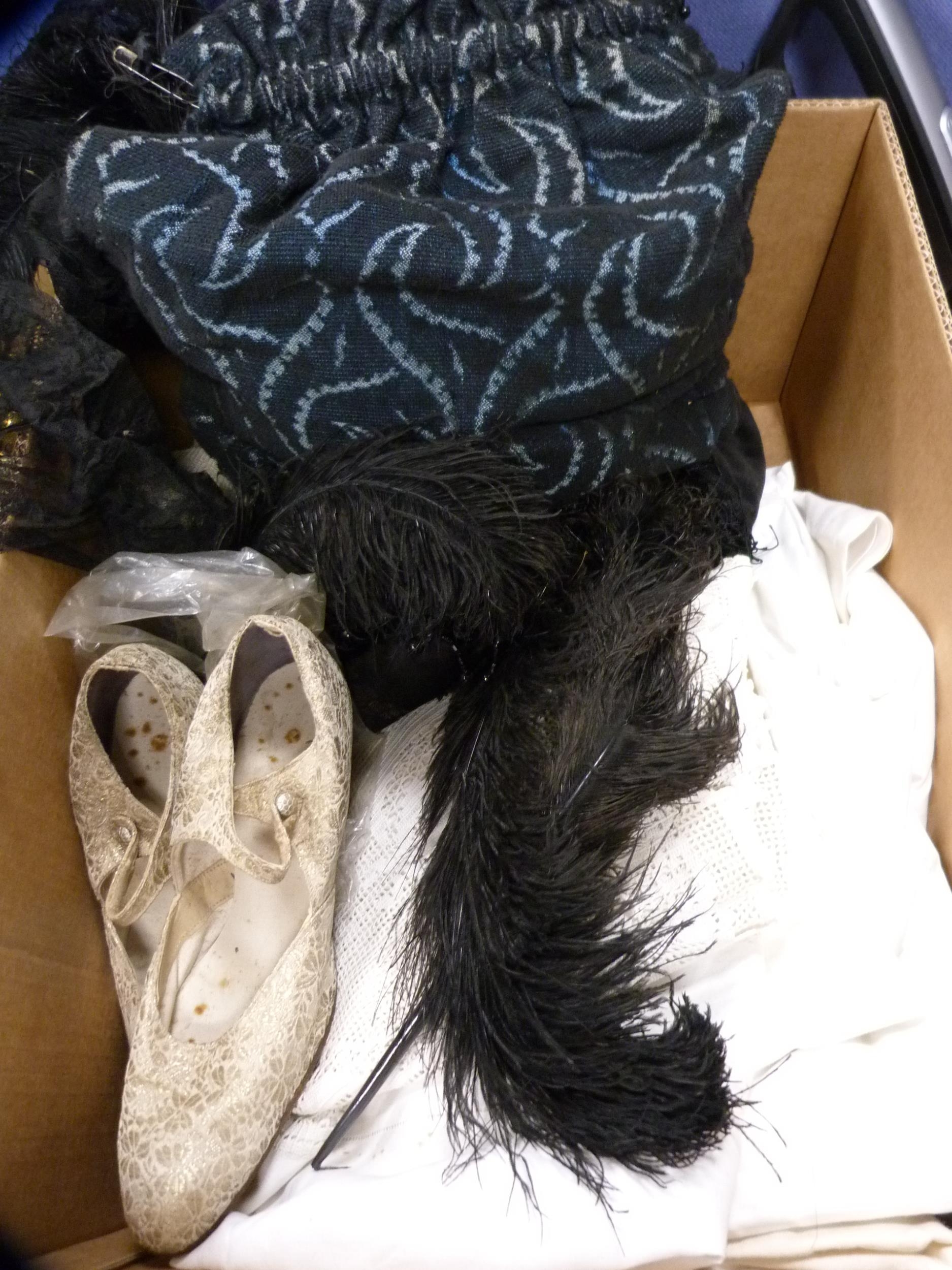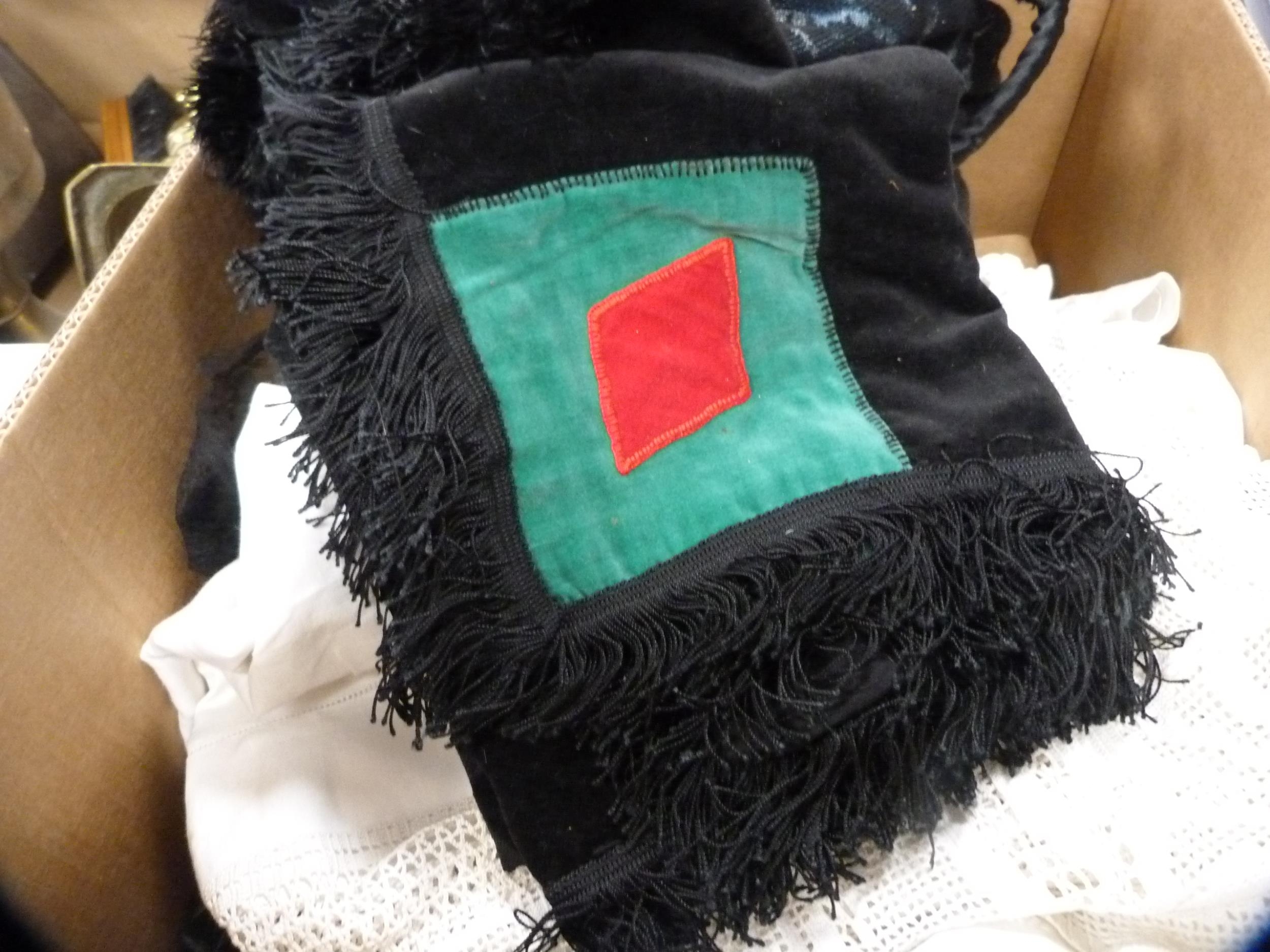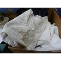 Carton containing napery and linen, and a pair of lady's damask-style shoes etc.