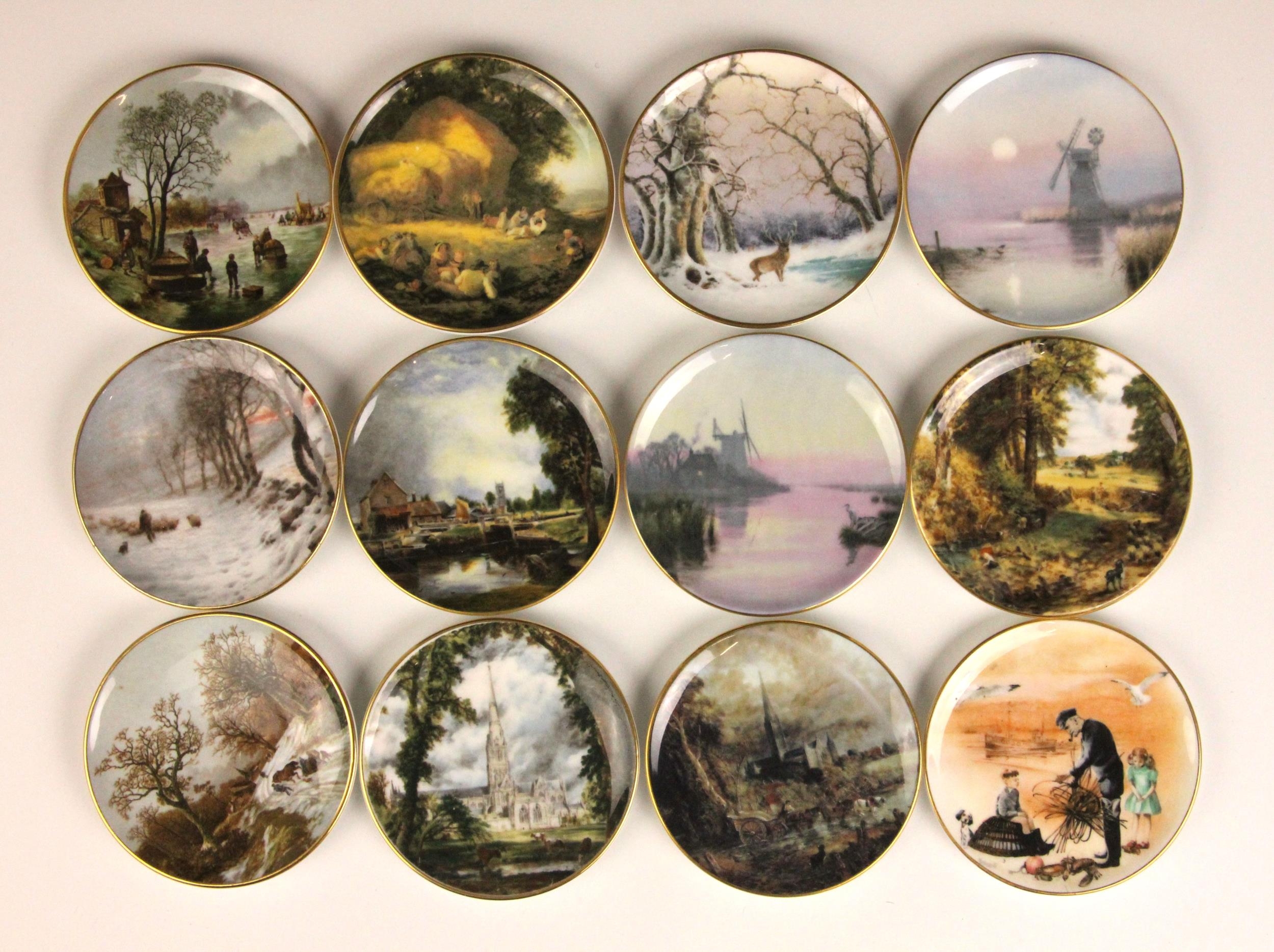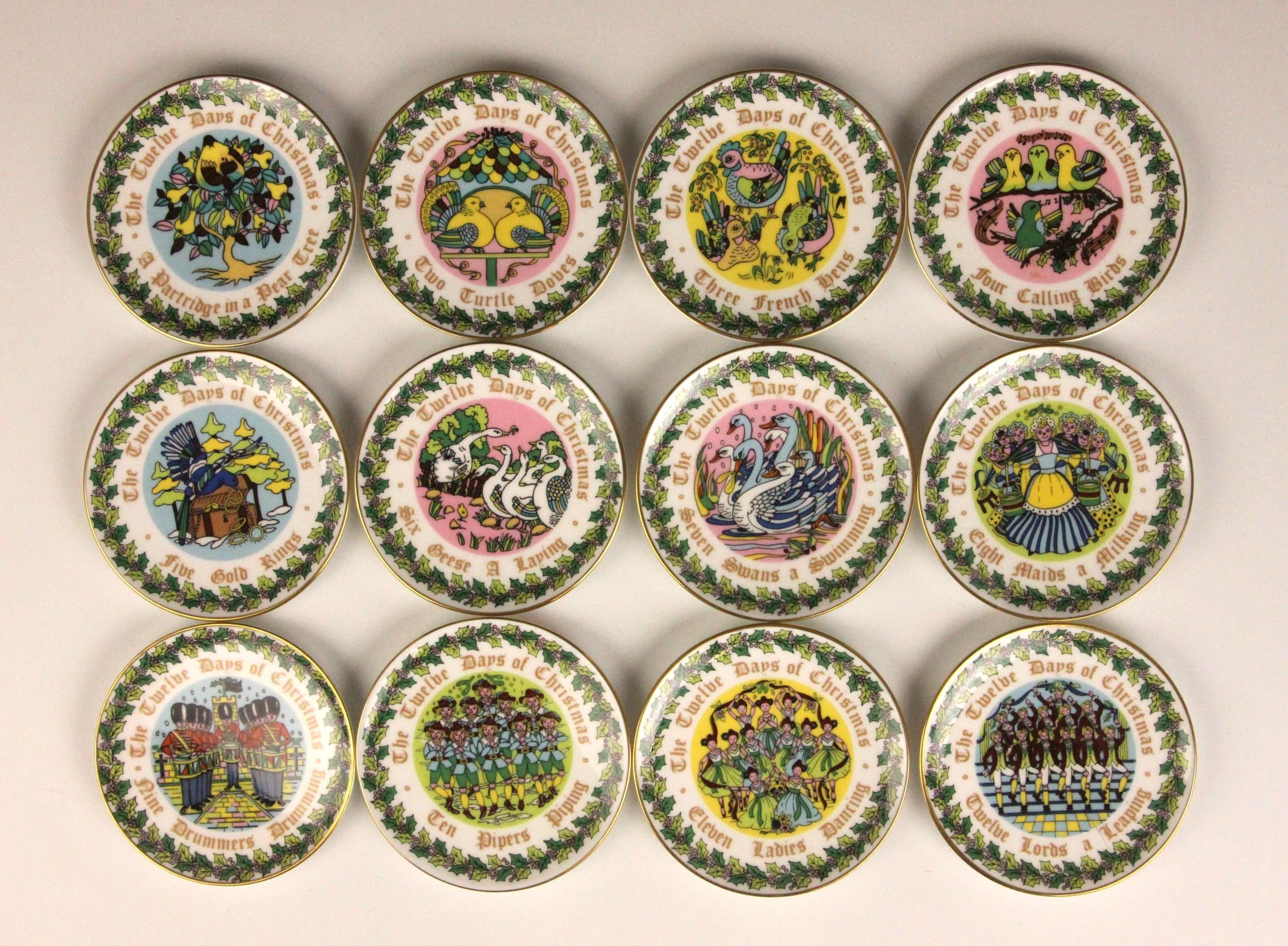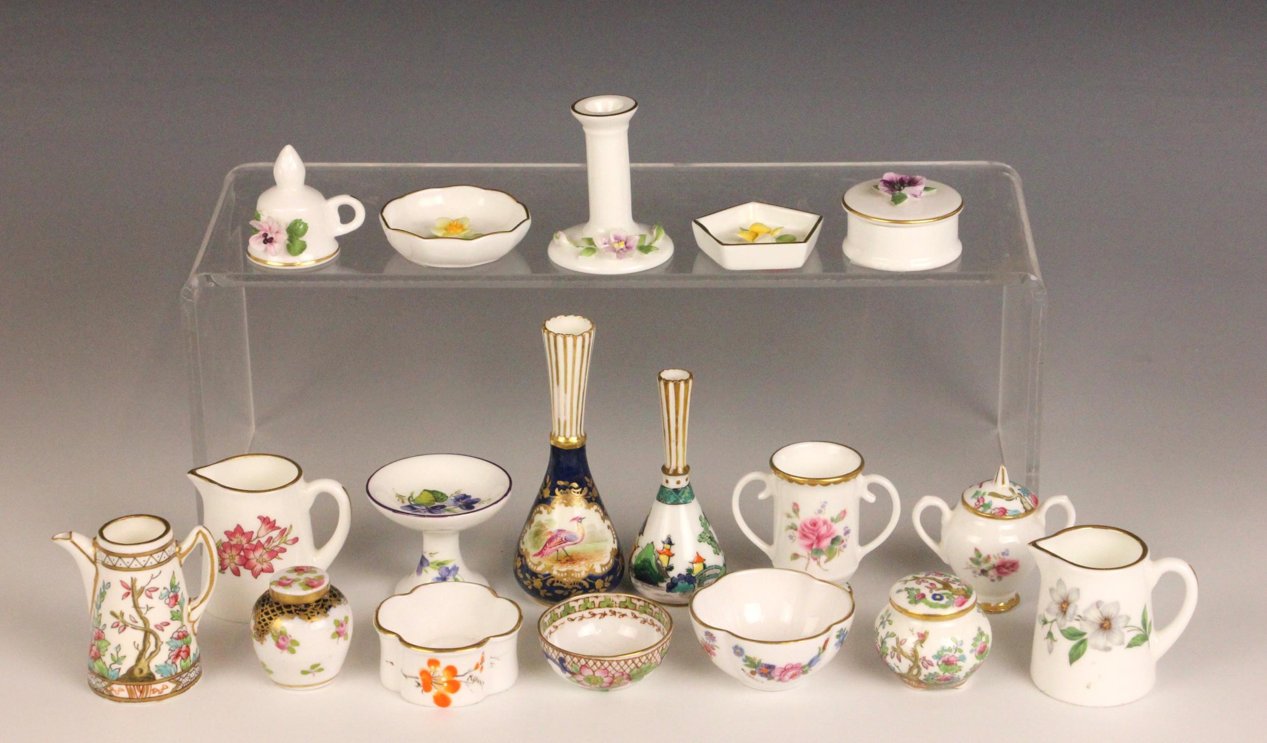 A quantity of Coalport miniature cabinet pieces, to include the 'Twelve Days Of Christmas' cabinet plate set, further miniature cabinet plates, various pieces from the 'Raised Flower' range, and a selection of miniature vases, bowls, tea wares, etc, in various patterns, each piece with printed mark to base (Qty)