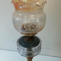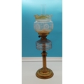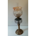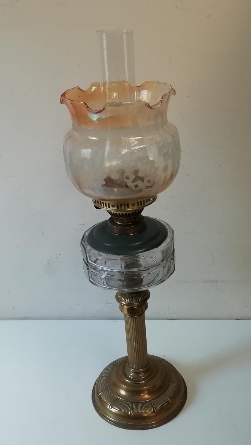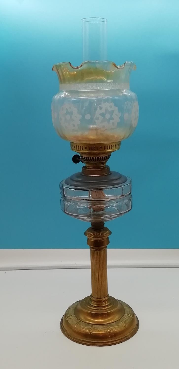 Brass Columned Oil Lamp with Shade. Overall Height 66cm.