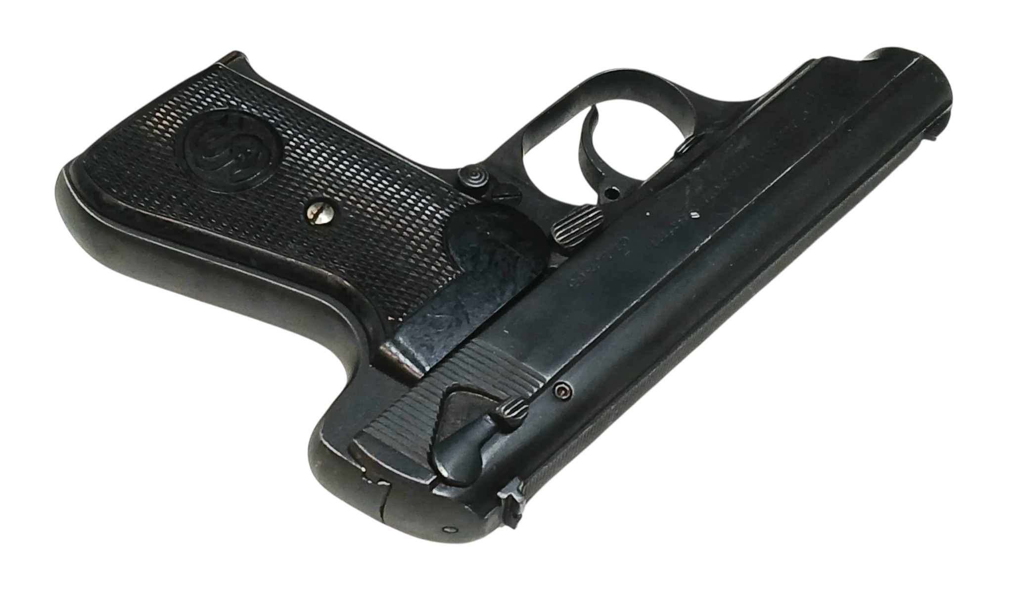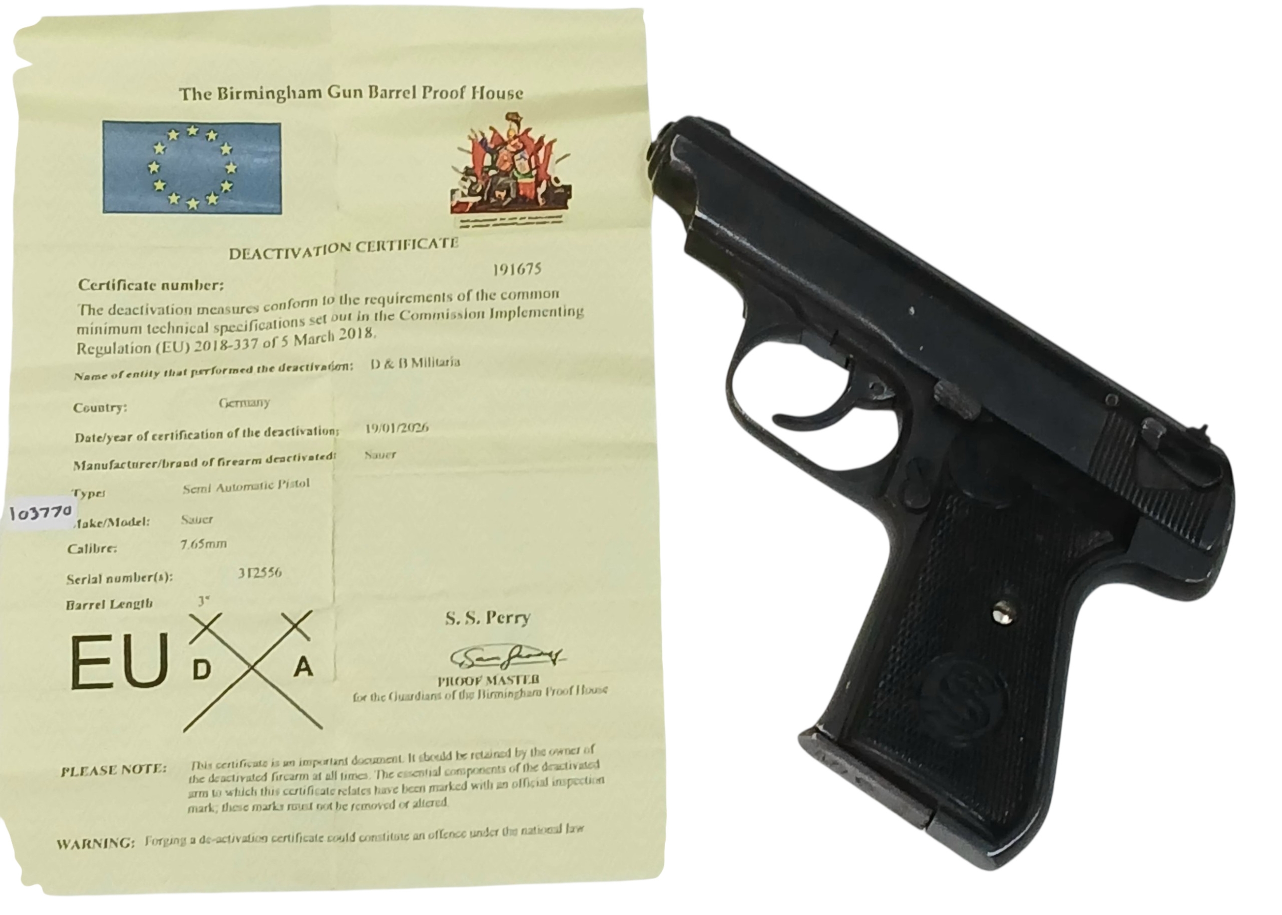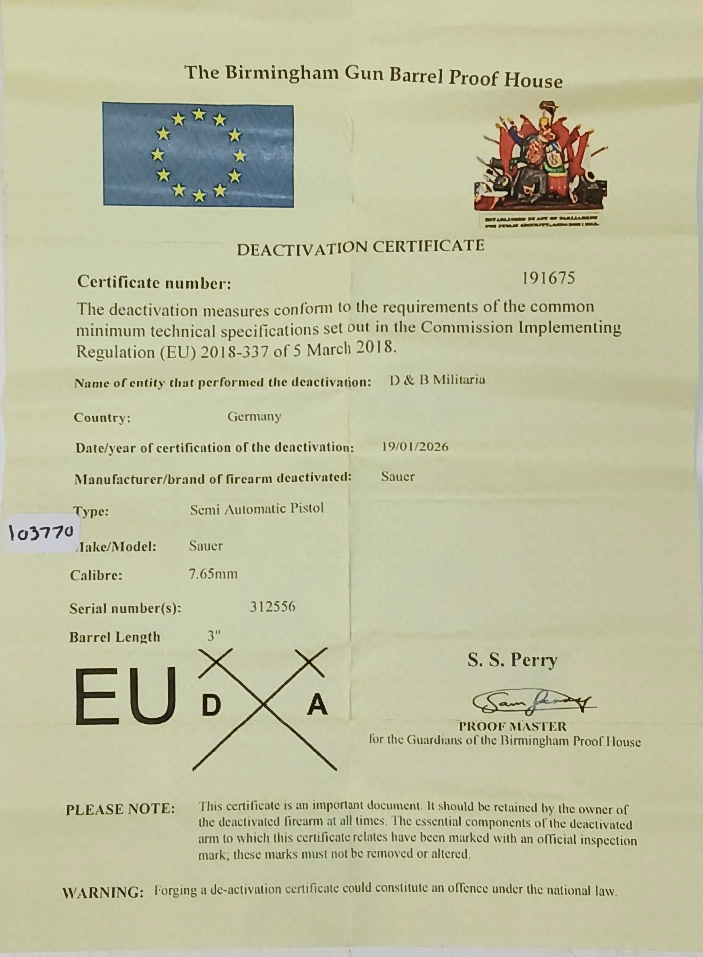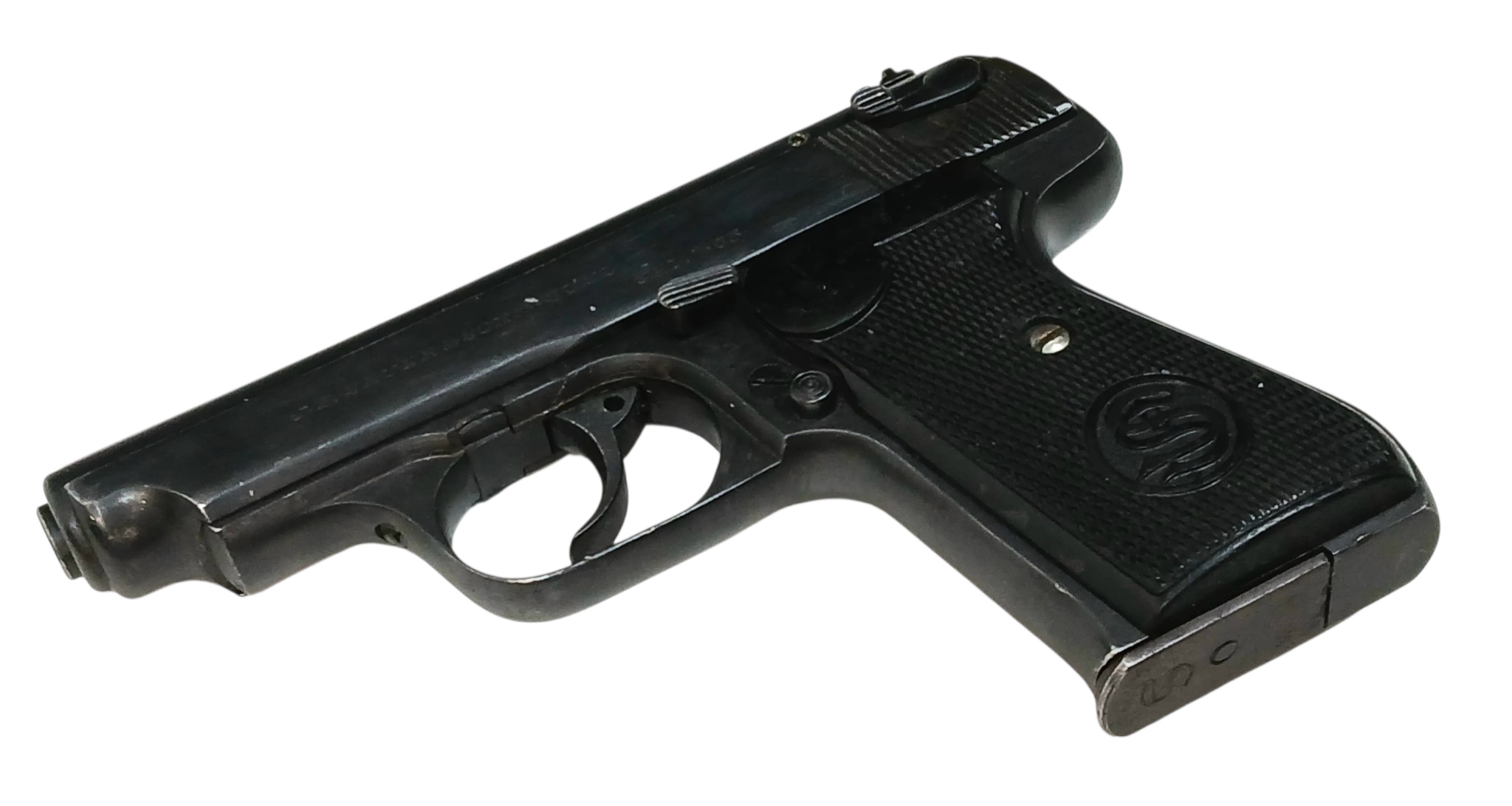A Deactivated WW2 Era German Sauer Semi Automatic Pistol - German Third Reich Eagle Mark. 7.65mm calibre with a 3 inch barrel length. Comes with an EU deactivation certificate - EU/UK sales only - Not Holland.