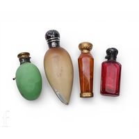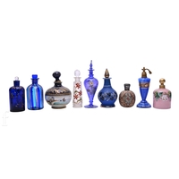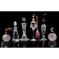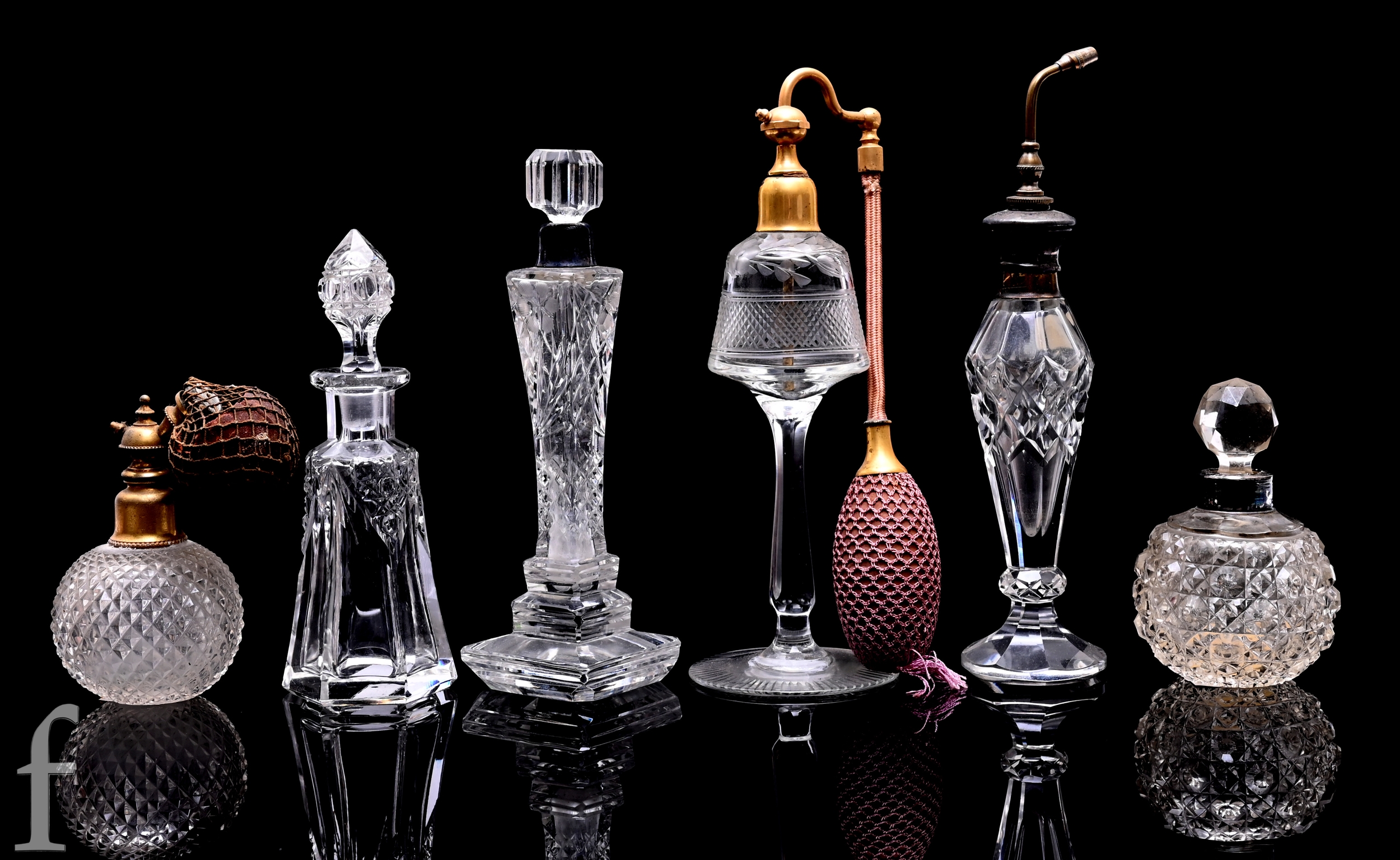 A small assorted collection of early 20th Century clear cut crystal scent bottles to include cut and engraved examples of spherical and pedestal form with stoppers and atomizer fittings, tallest 19.5cm. (6)
