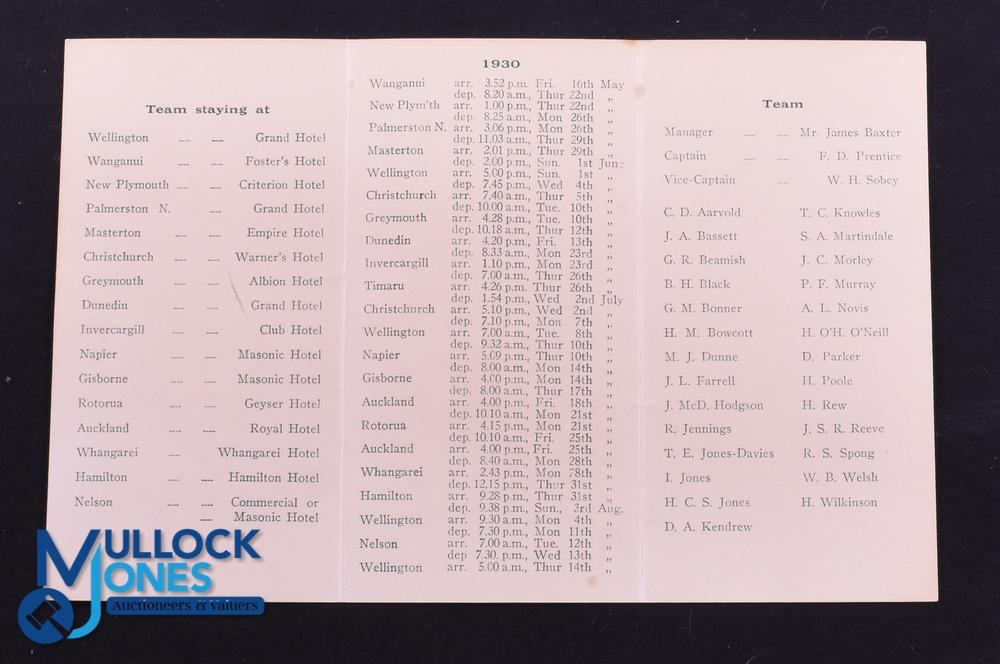 Rare 1930 British and I Lions Itinerary: 5.5" x 3" buff trifold itinerary card with details of team, travel and hotels, plus fixture list. Some light foxing, o/wise clean and VG for age Part of the WGM Bonner 1930 BRFT Lions Collection