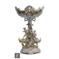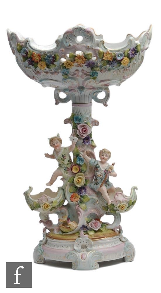 A 20th Century Dresden type table centre, the pedestal with three cherub figures amidst encrusted flowers with two small bowls to the sides, the shaped bowl with flowers and foliate scrolls, all in pastel tones, unmarked, height 46cm, S/D.