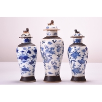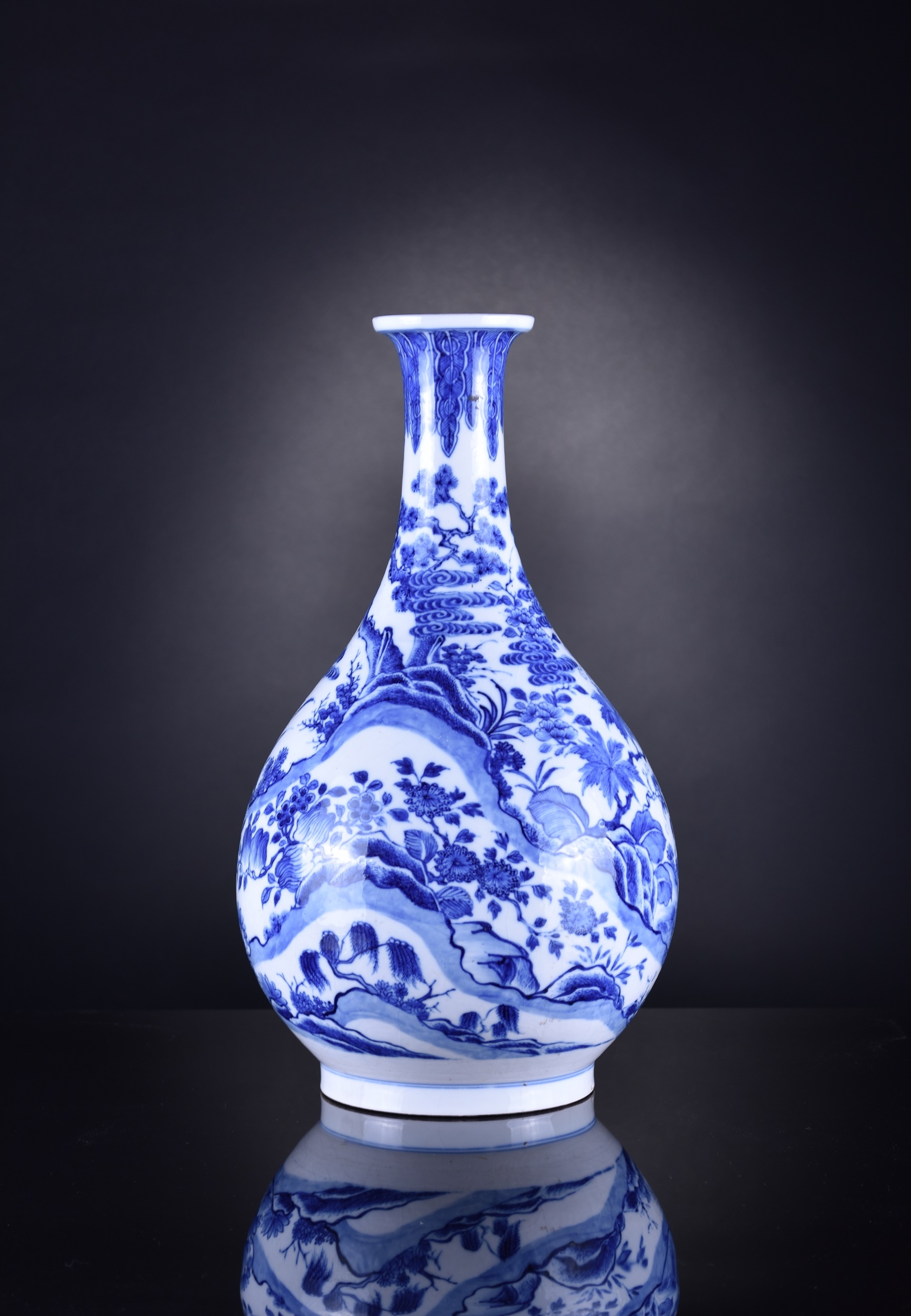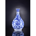 A Chinese blue and white porcelain vase, Yuhuchunping, Qianlong Of ovoid shape with everted rim, decorated with a continuous scene of fruiting trees and flowering plants including pomegranates, finger citron, grapes, pine, peonies and willow, the neck with a band of stiff banana leaves, the inside rim with a narrow diaper band. 37.5cm high (small chip to foot rim) Acquired in 1929 at a dispersal sale of the contents of Walcot Hall, Lydbury, Shropshire, thence by descent to the vendor.