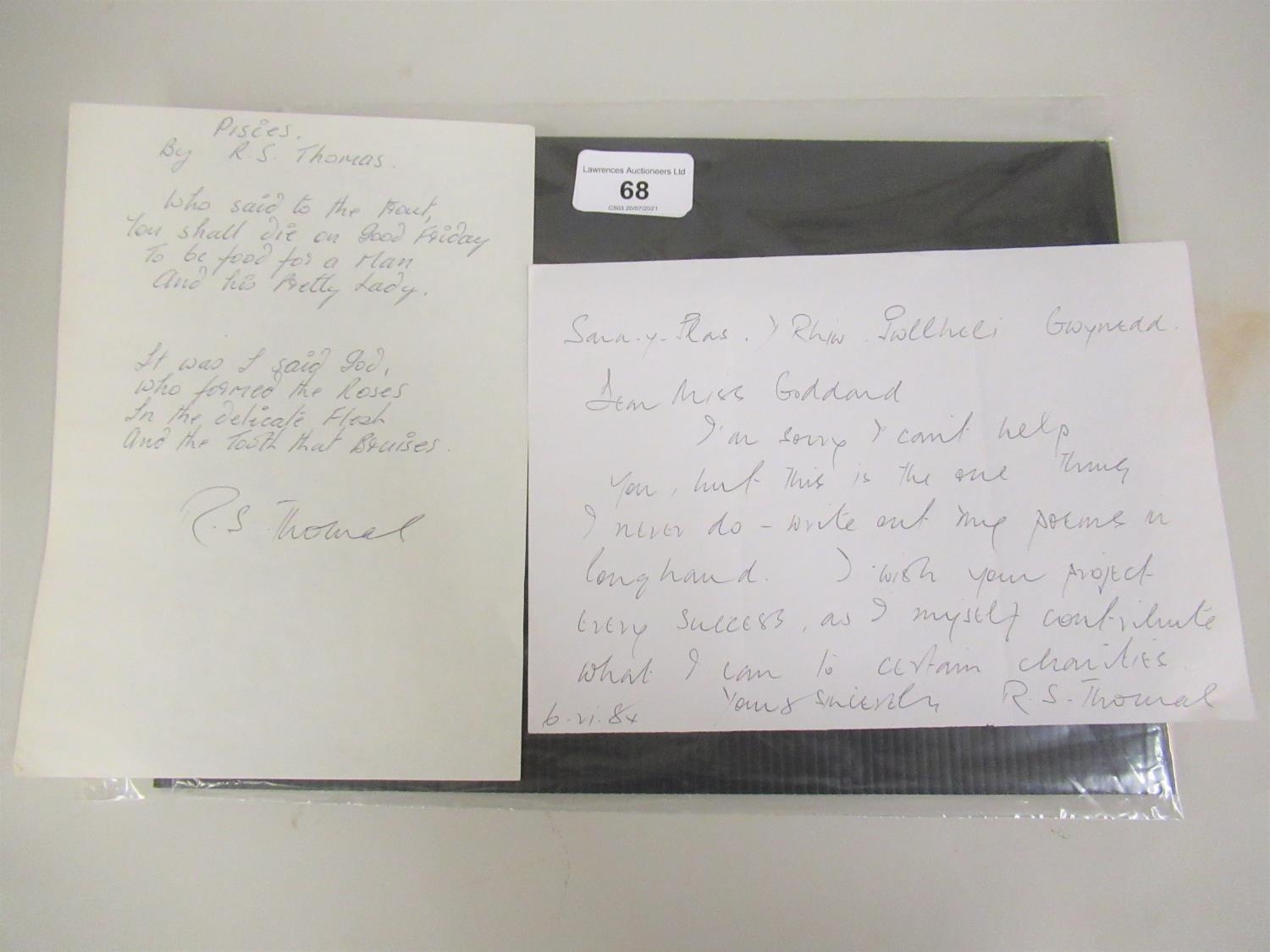 R.S. Thomas (poet), an autograph letter in which he explains that the one thing he never does is to write out his poems in long hand, together with a poem ' Pisces ', signed by Thomas