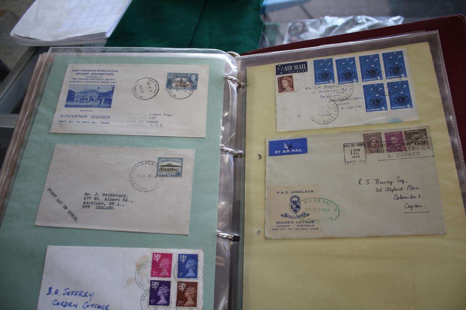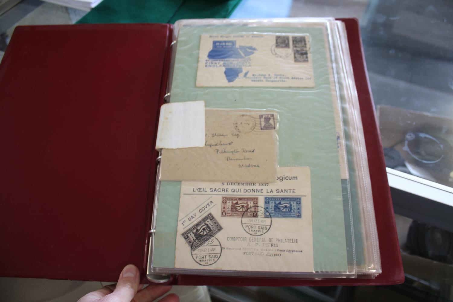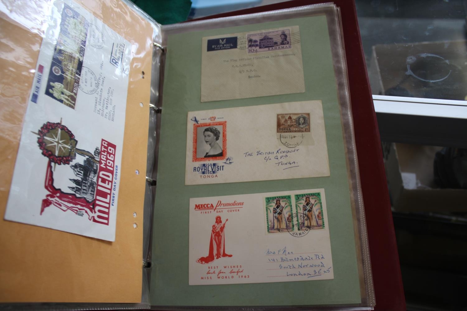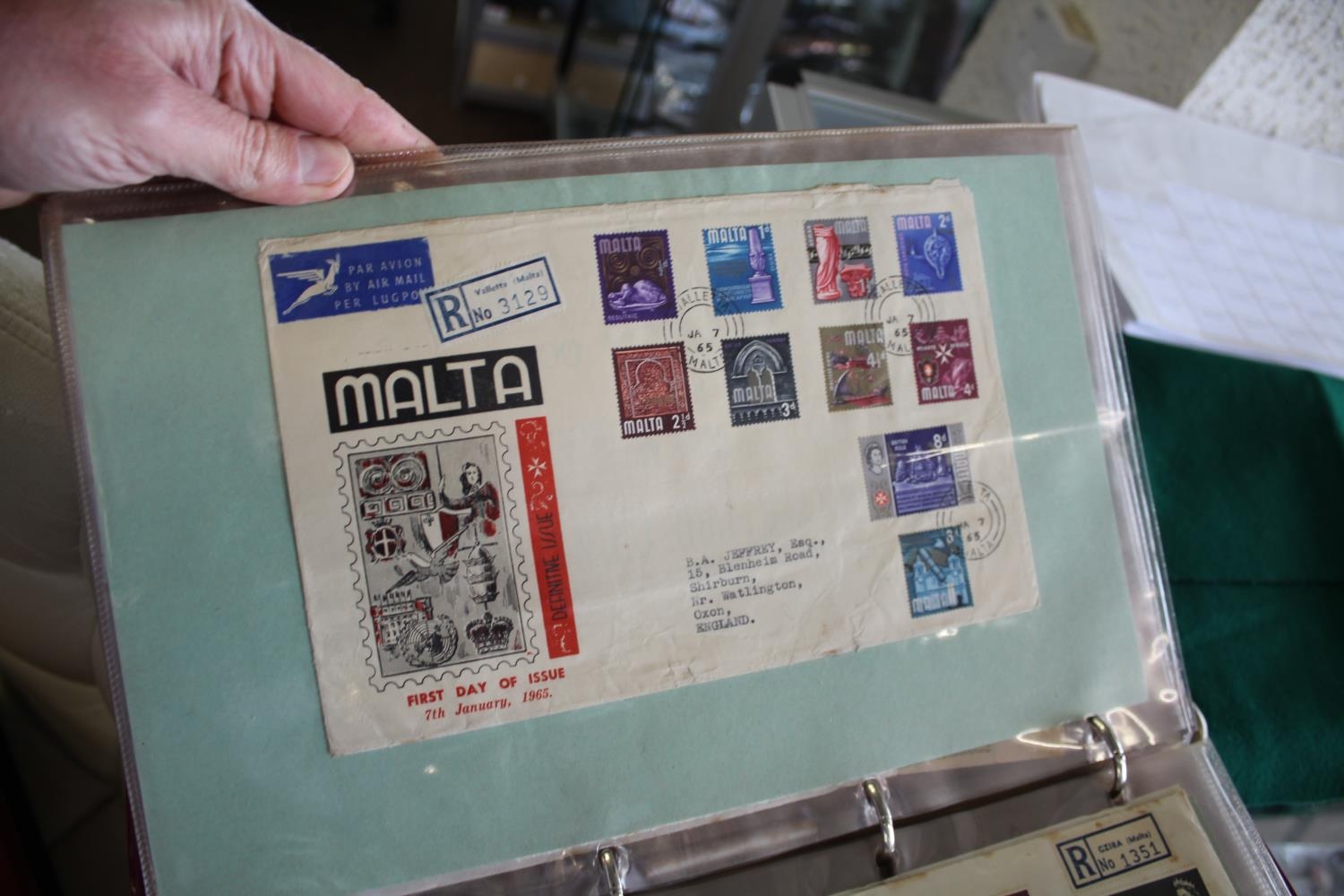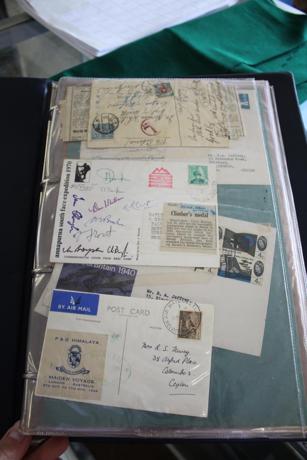 STAMP ALBUMS - EARLY FIRST DAY COVERS, AIR MAIL & POSTAL HISTORY 3 interesting albums, 1st album including Imperial Airways First Air Mail England Africa, Nelson's Dockyard Antigua 1961, Red Cross Centenary 1963, Malta Air Mail 1963 (and other Malta covers), Royal Visit Tonga 1954, Miss World 1963, New Zealand (1953 Coronation, Health Stamps etc), Australia (Scout Jamboree 1952, Discovery of Gold 1951 etc), Indian Everest Expedition 1965 etc. 2nd album, Aviation (1960's and 1970's, some signed including Air Mail Service, International Air Day, Royal Air Force, P & O Himalaya 1949, postcards etc), 19thc covers etc. 3rd album, Channel Islands Liberation 1945, International Stamp Exhibition 1950, Festival of Britain 1951, National Maritime Museum 1960, United Nations 1965, Stampex 1964, Westminster Abbey 1966, World Cup 1966, Silver Jubilee, and many more. (3)