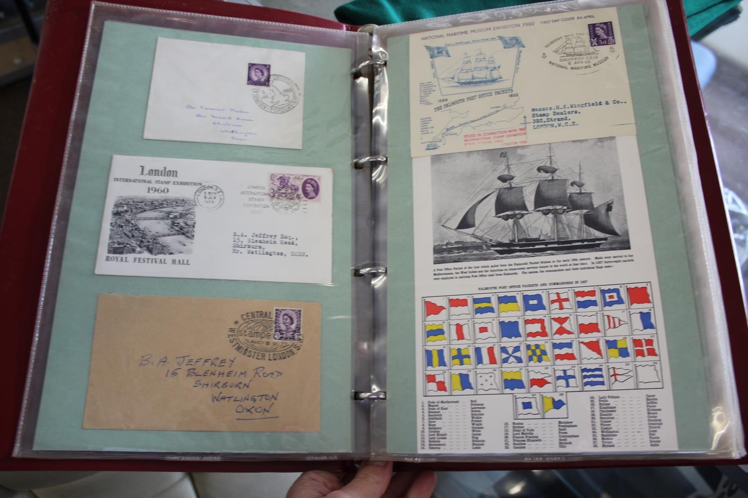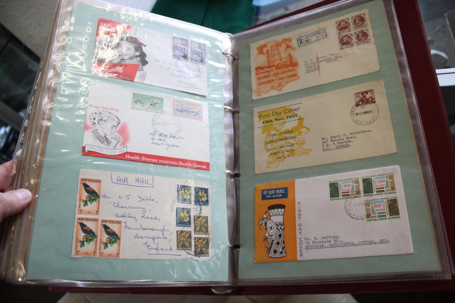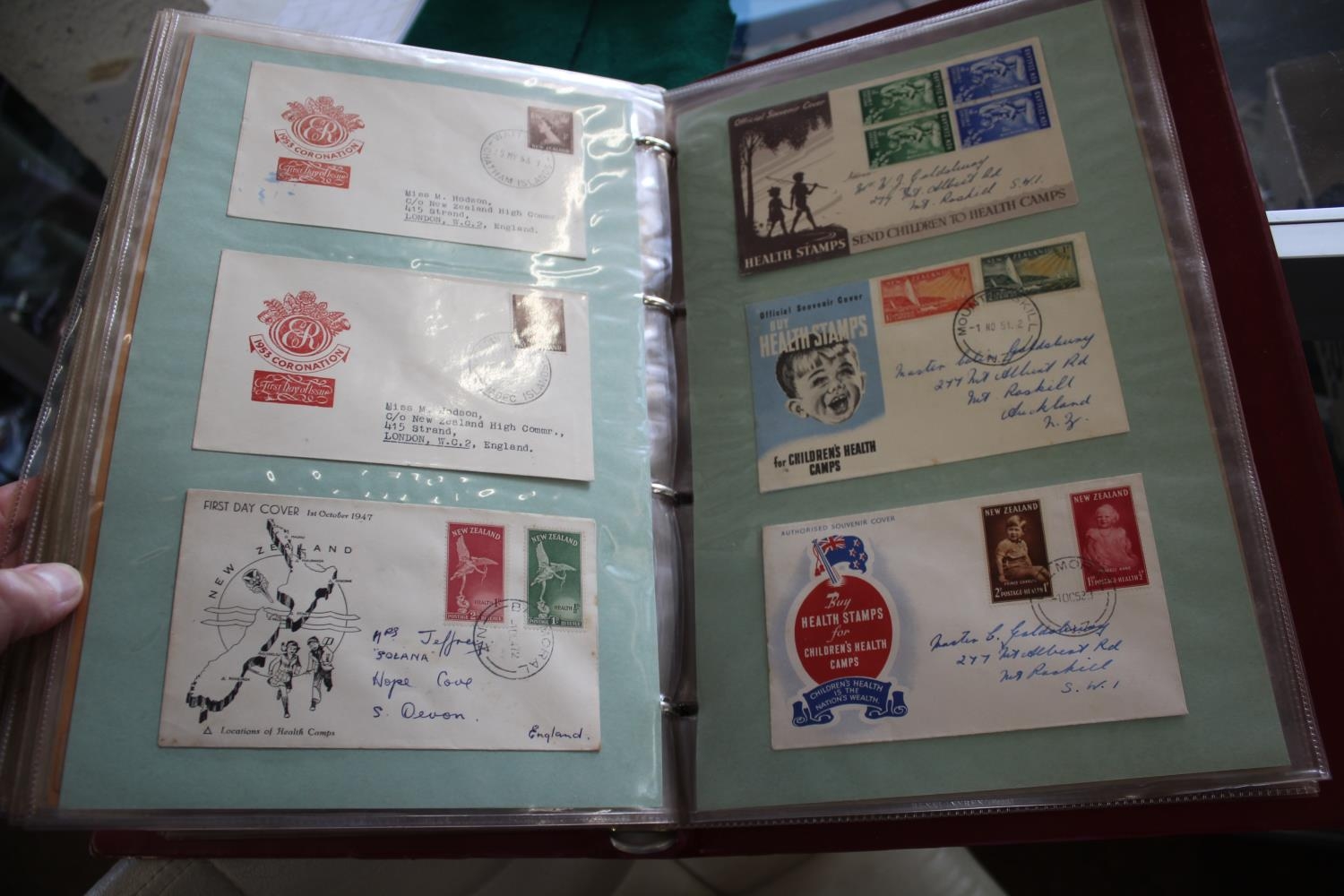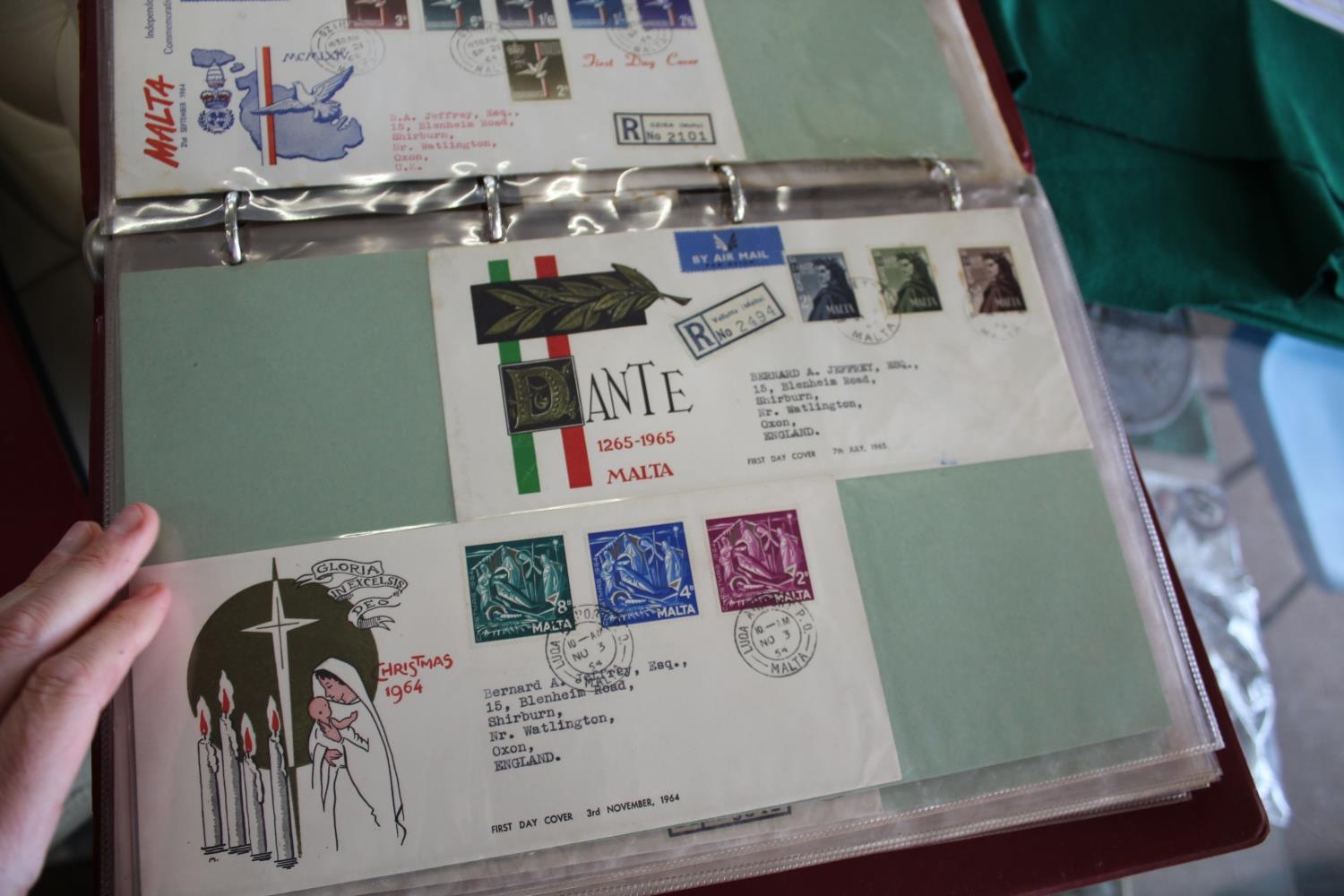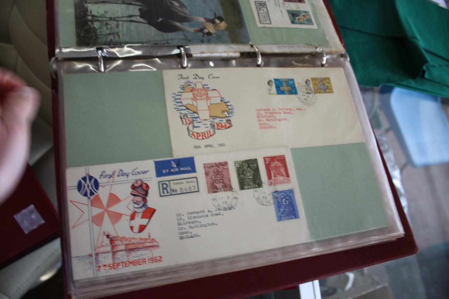 STAMP ALBUMS - EARLY FIRST DAY COVERS, AIR MAIL & POSTAL HISTORY 3 interesting albums, 1st album including Imperial Airways First Air Mail England Africa, Nelson's Dockyard Antigua 1961, Red Cross Centenary 1963, Malta Air Mail 1963 (and other Malta covers), Royal Visit Tonga 1954, Miss World 1963, New Zealand (1953 Coronation, Health Stamps etc), Australia (Scout Jamboree 1952, Discovery of Gold 1951 etc), Indian Everest Expedition 1965 etc. 2nd album, Aviation (1960's and 1970's, some signed including Air Mail Service, International Air Day, Royal Air Force, P & O Himalaya 1949, postcards etc), 19thc covers etc. 3rd album, Channel Islands Liberation 1945, International Stamp Exhibition 1950, Festival of Britain 1951, National Maritime Museum 1960, United Nations 1965, Stampex 1964, Westminster Abbey 1966, World Cup 1966, Silver Jubilee, and many more. (3)