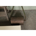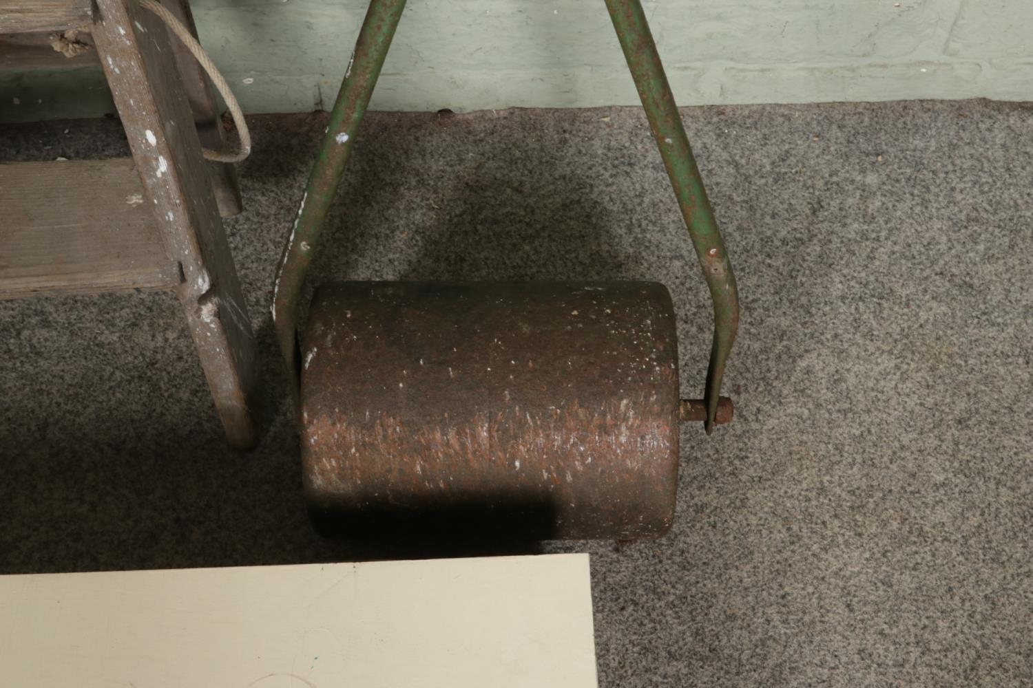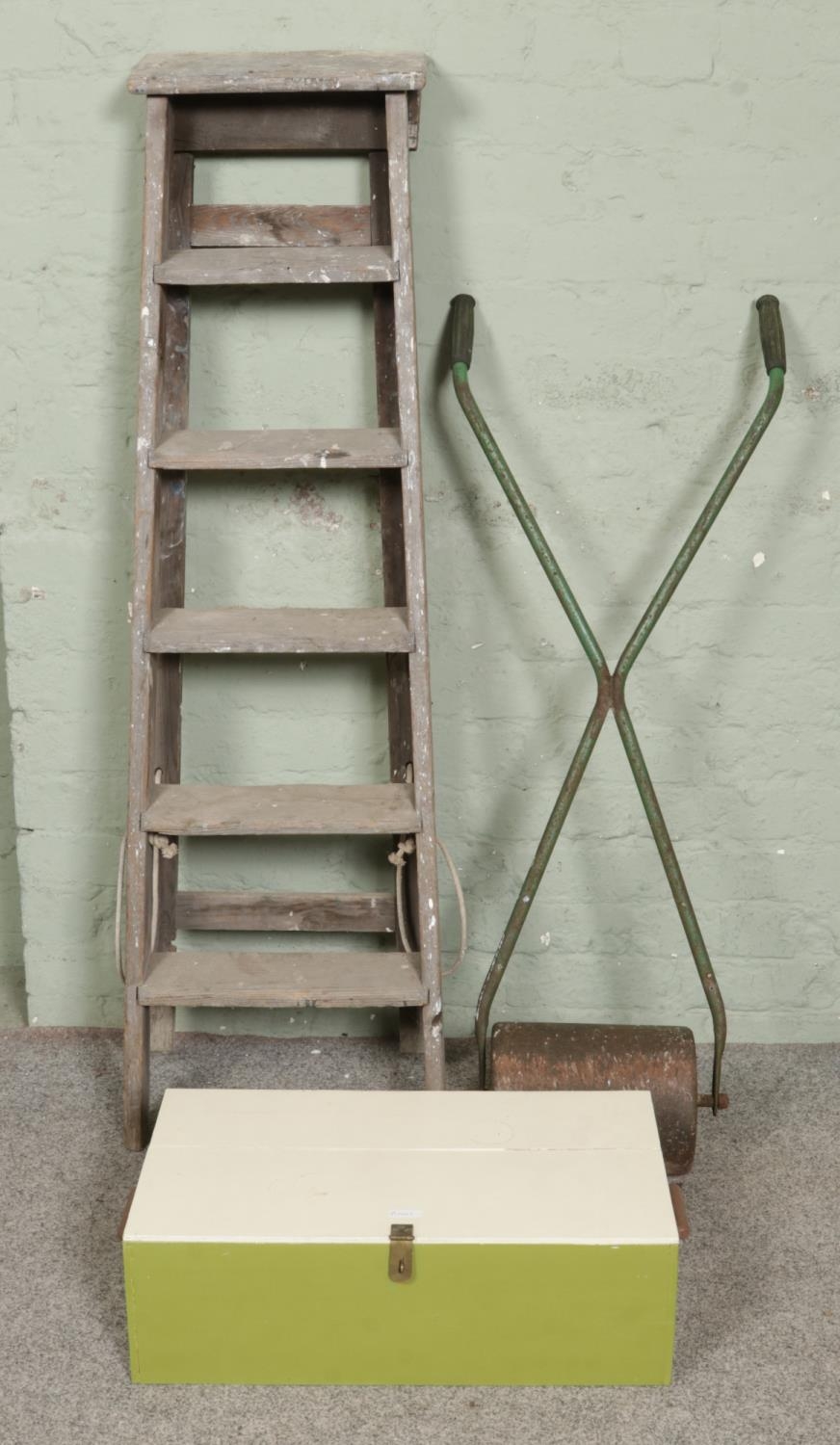 A heavy metal garden roller alongside a bespoke tool box and stepladders.