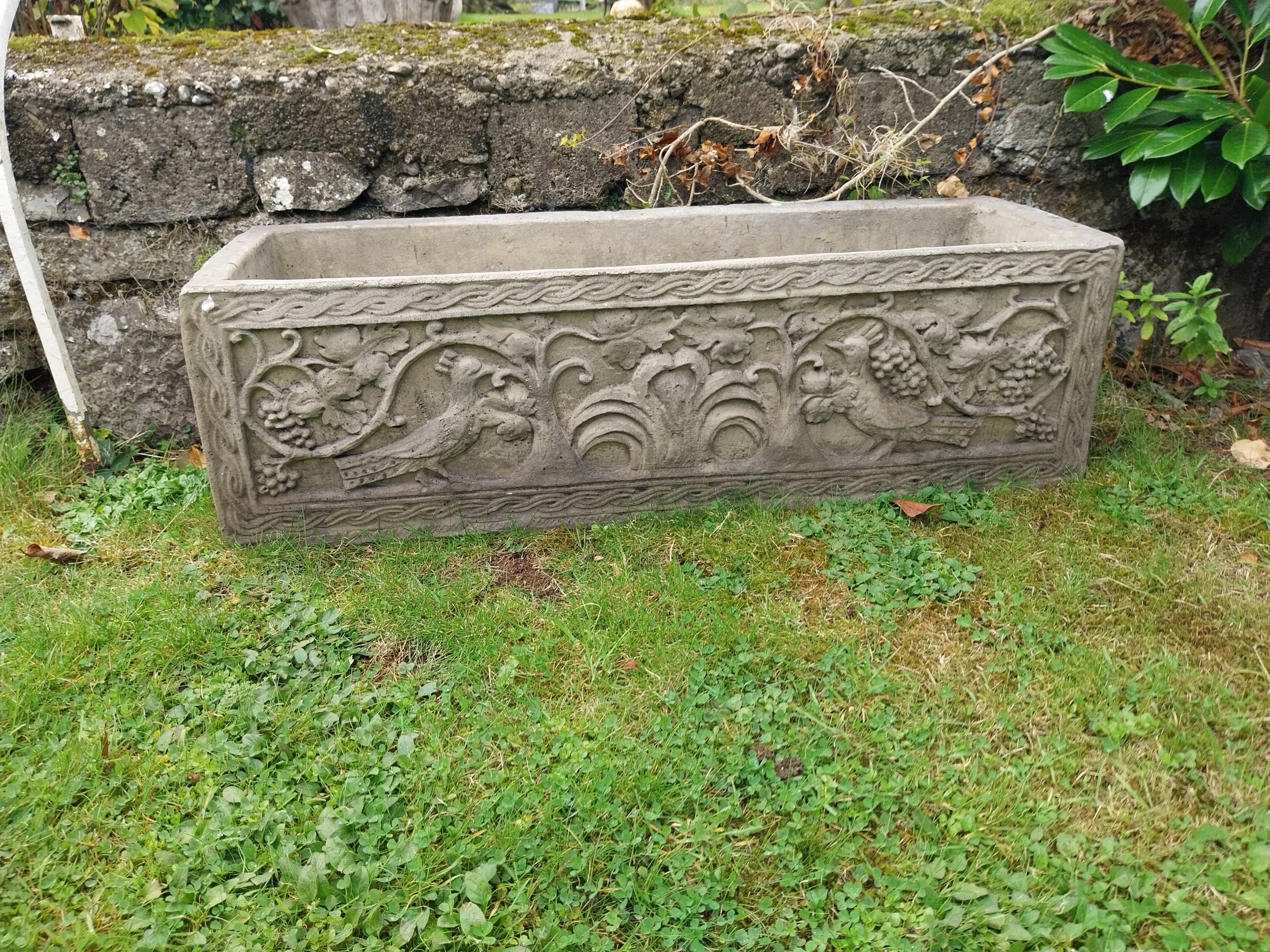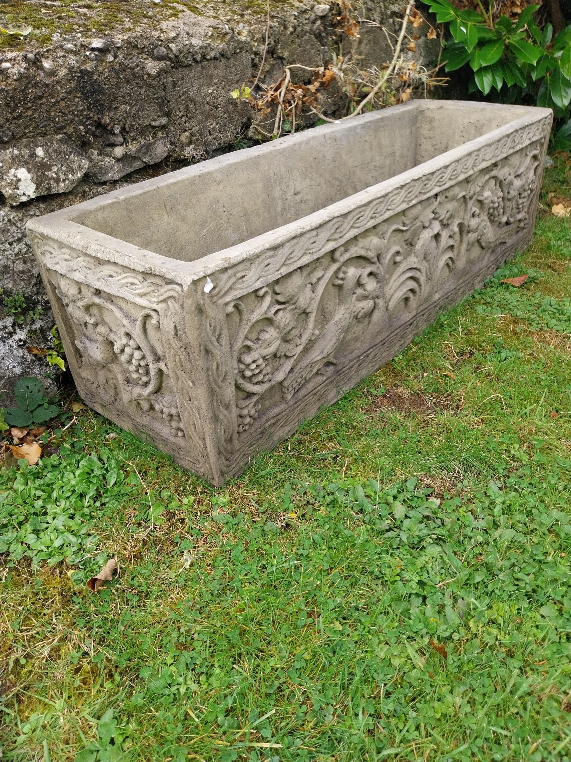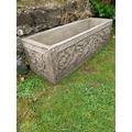 Good quality decorative moulded sandstone planter. { 32cm H X 107cm W X 36cm D }.