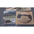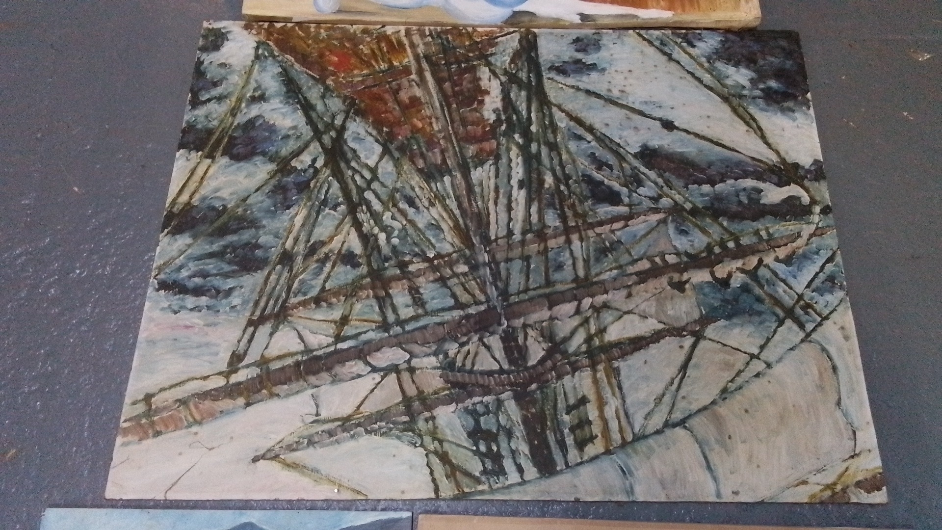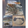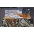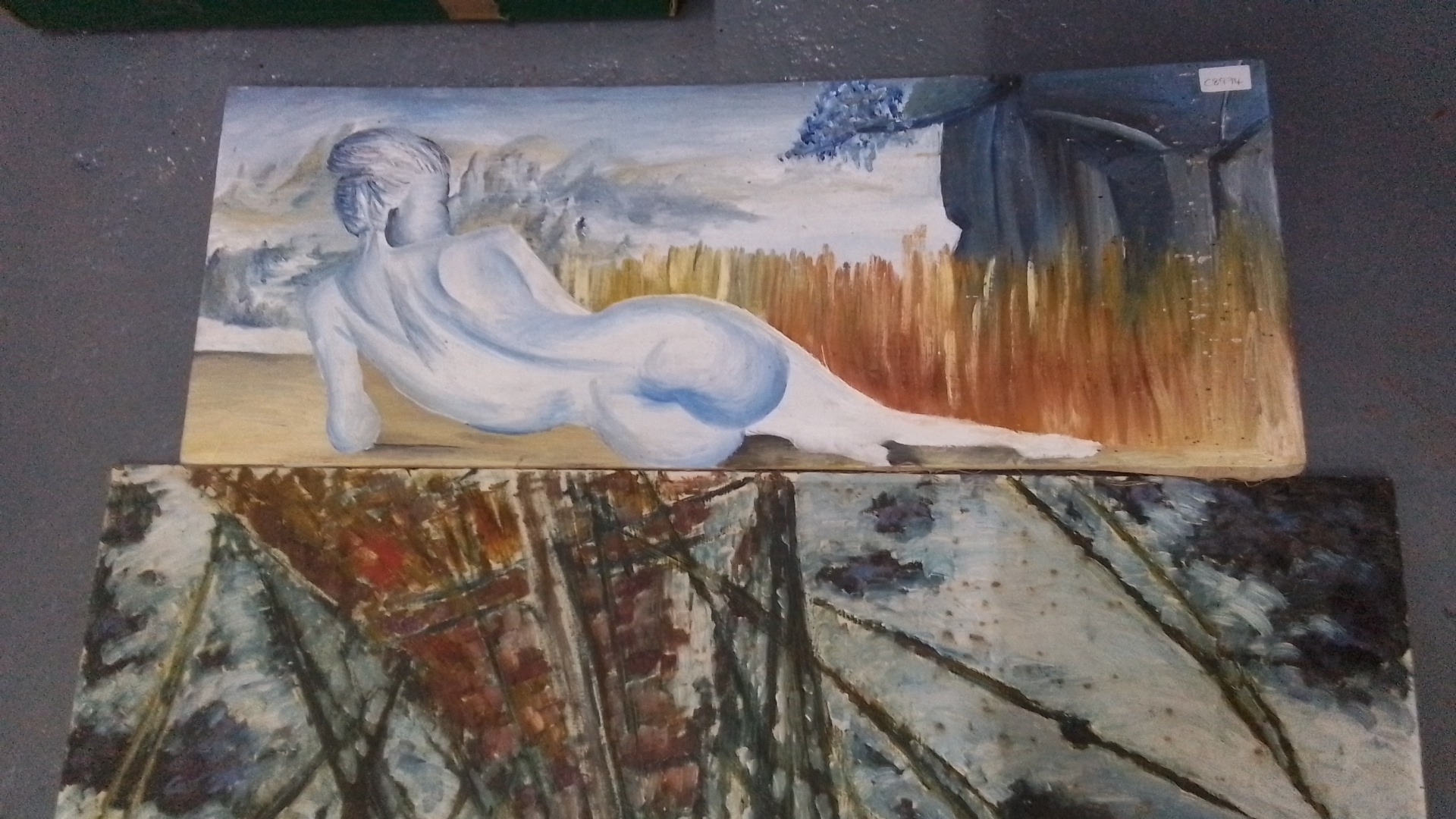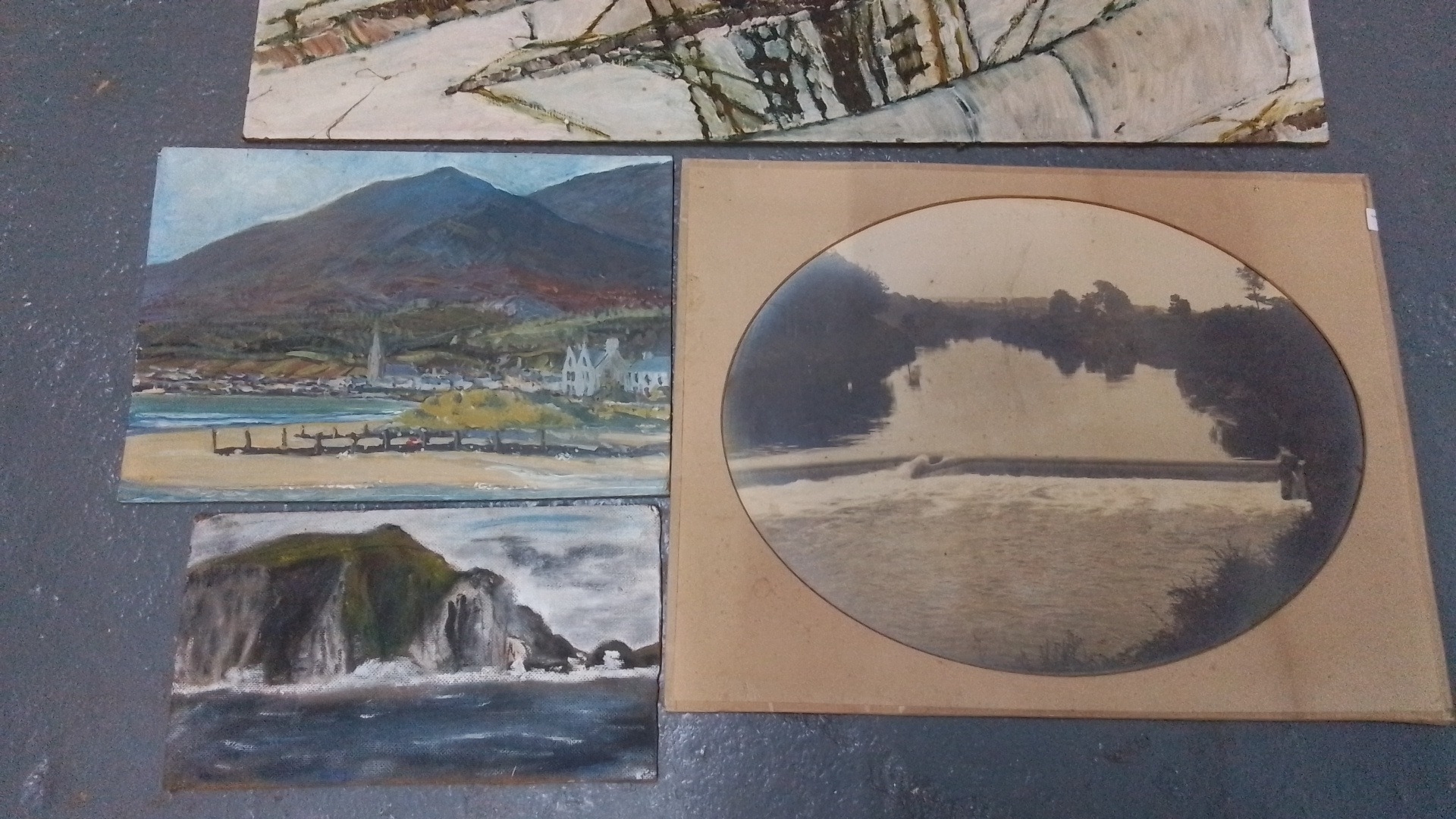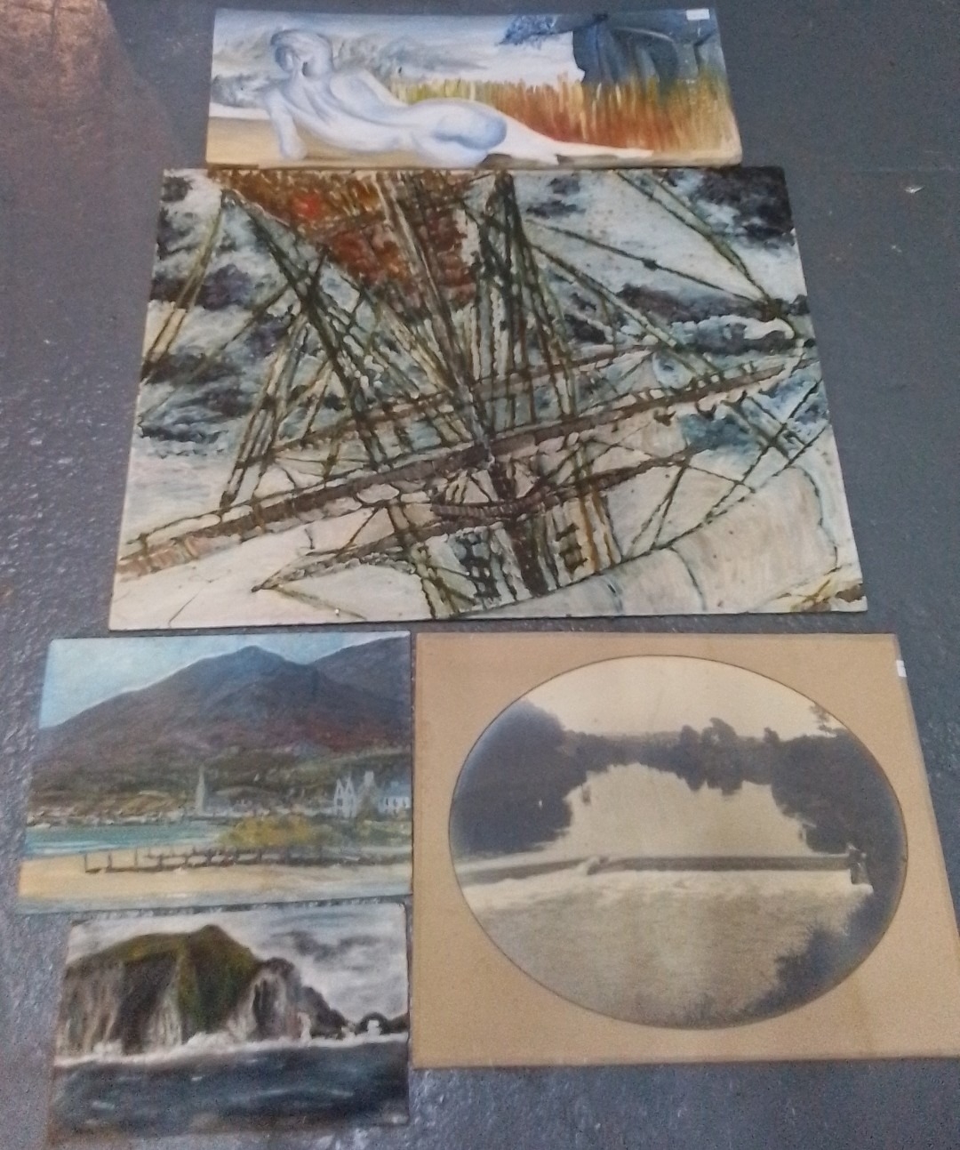 Five unframed art works comprising two oils on board depicting coastal landscapes, an oval photographic print of a river weir, and two painted panels, one with a reclining nude and one with an abstracted sailing vessel.