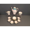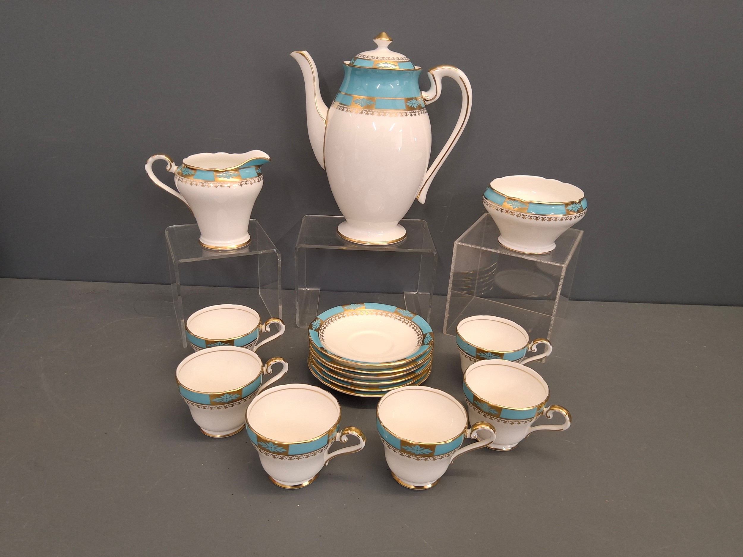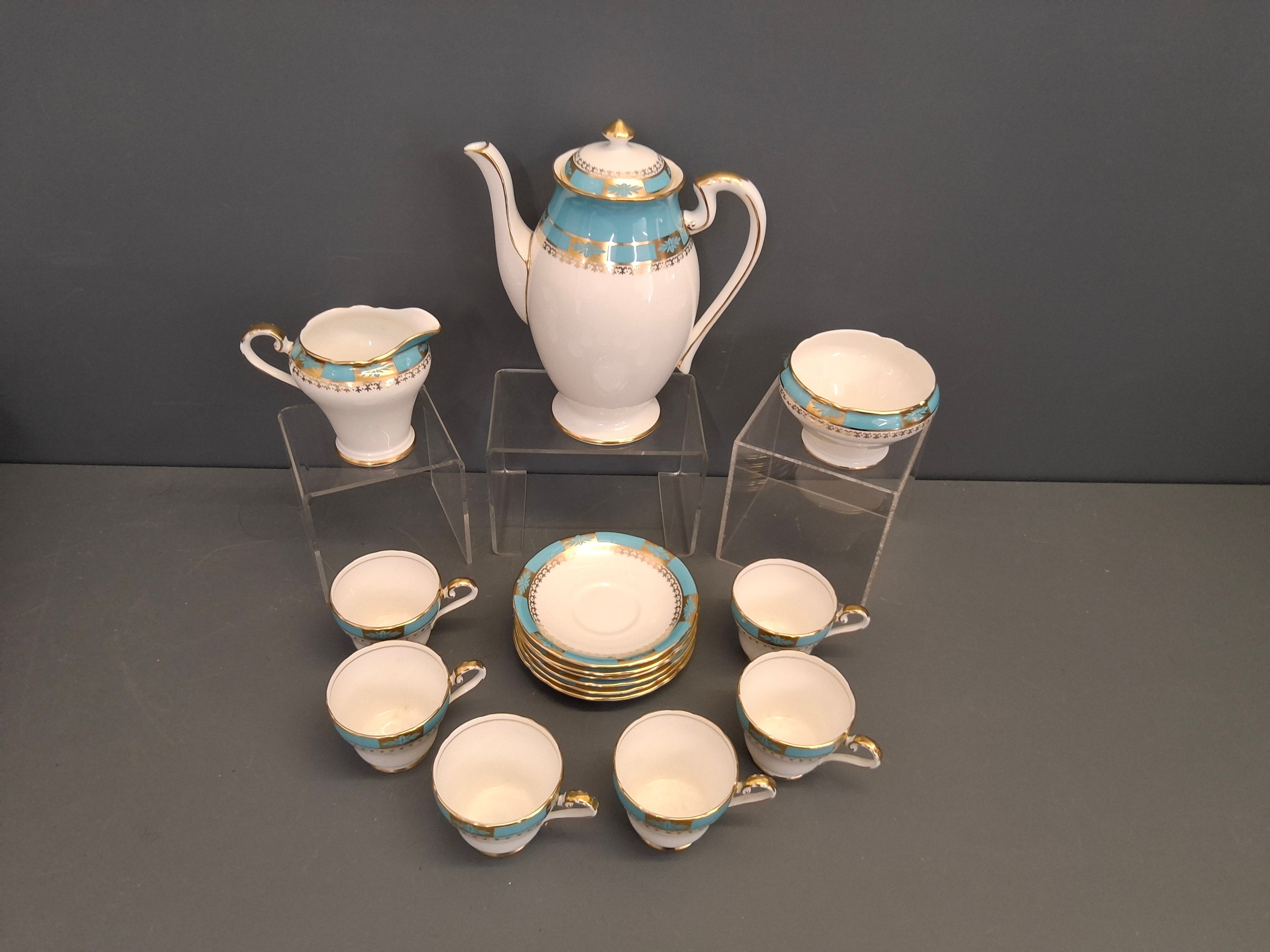 Aynsley teal and white coffee service One saucer has slight hairline crack