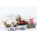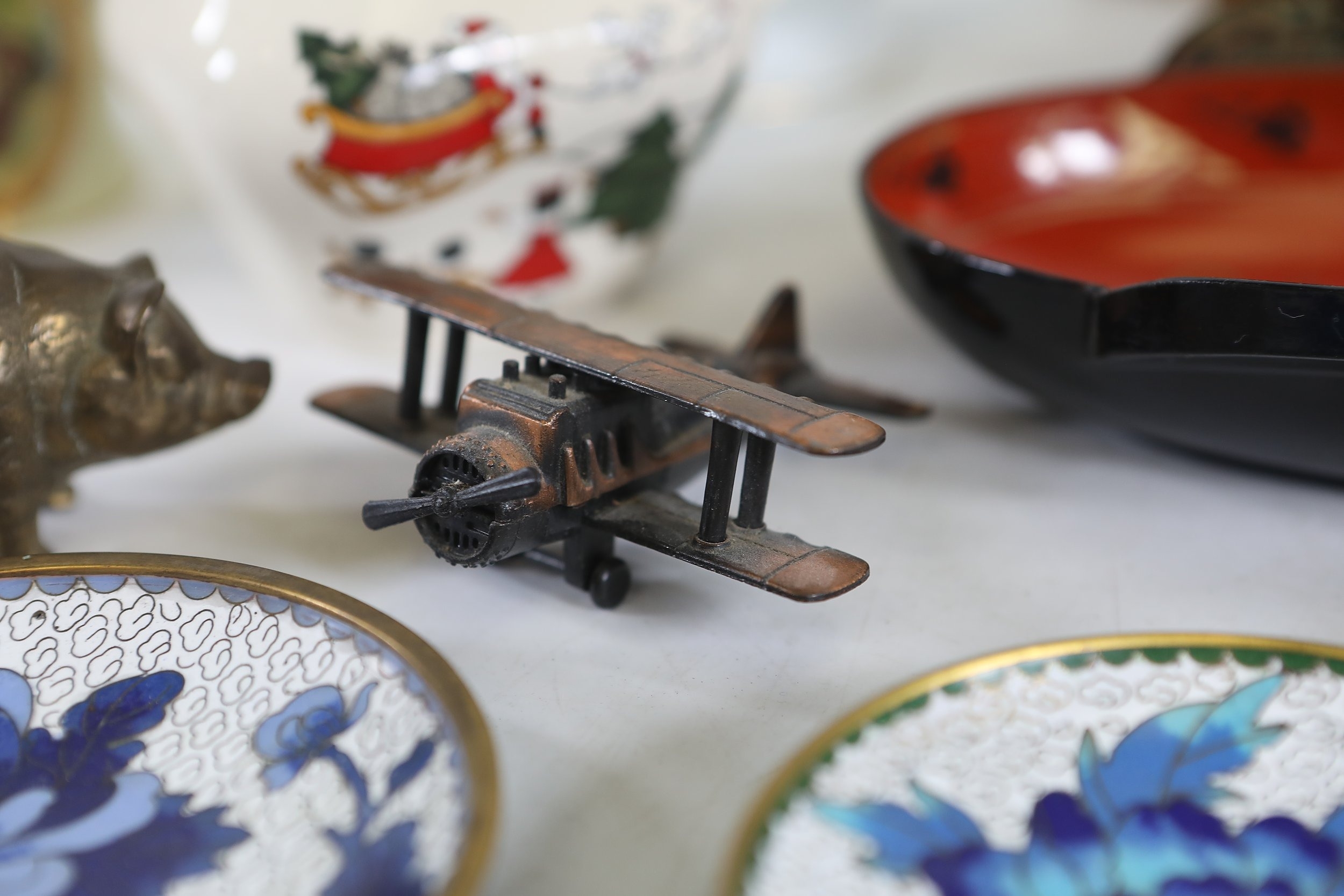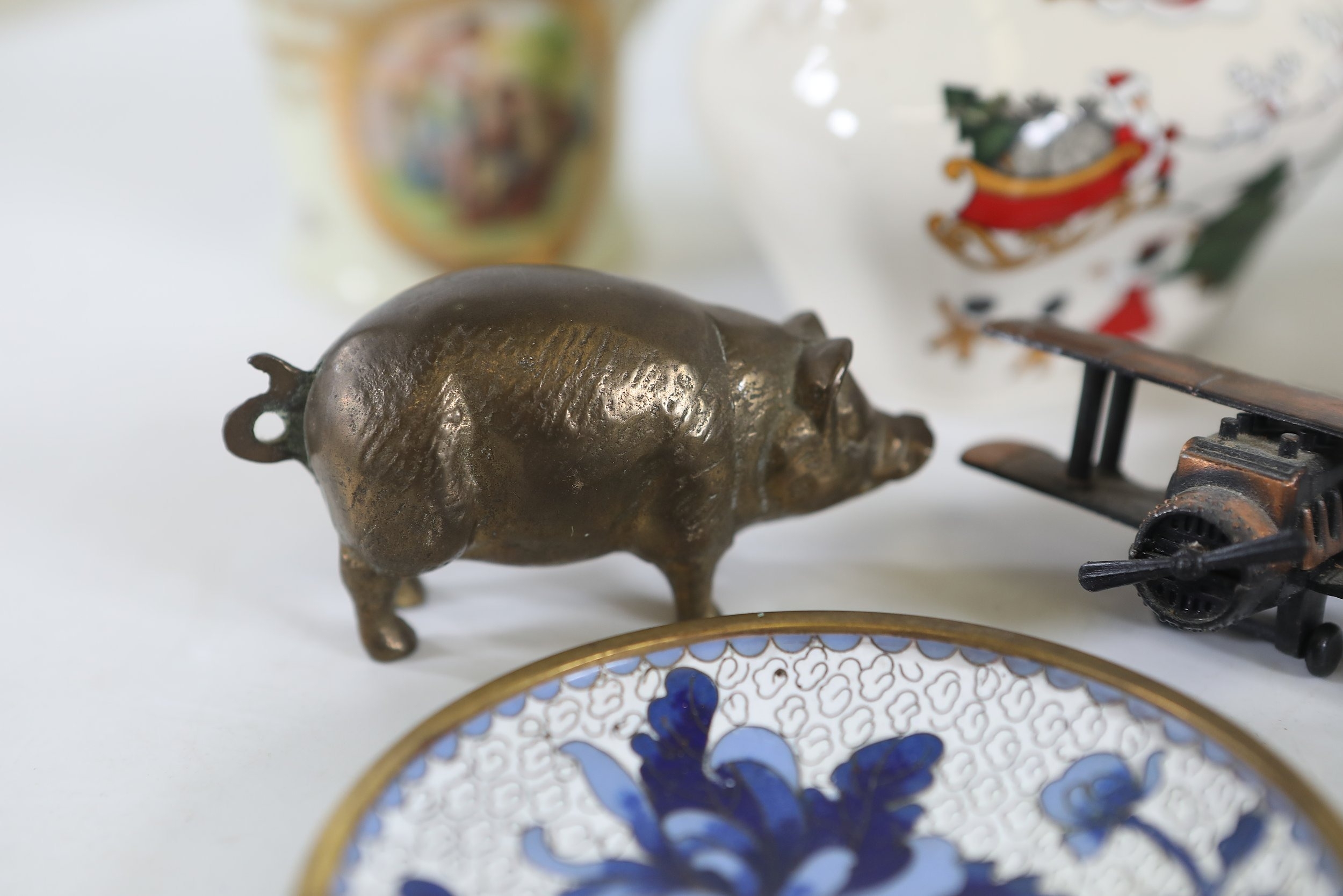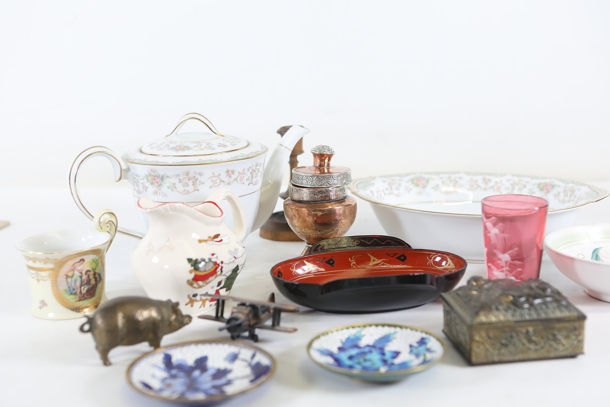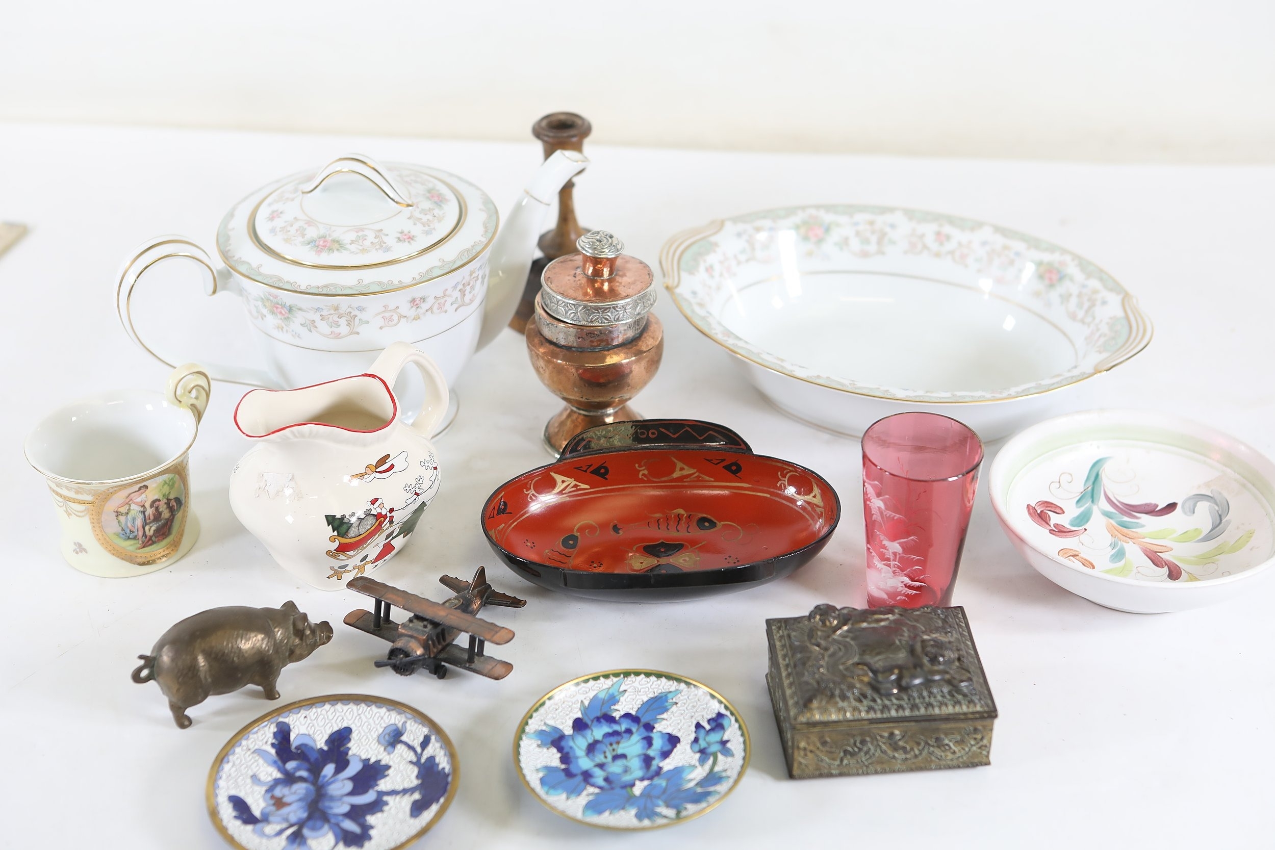 A mixed collection of approximately 12 to 15 small decorative and domestic items, comprising a white porcelain teapot and matching oval serving bowl with pastel floral garland and gilt borders, a small cream cup with classical scene cartouche and gilt decoration, a Mason's Ironstone Christmas Village creamer made in England, a Denby bowl made in England, a small copper vessel on pedestal foot with silver coloured banding and domed lid, a turned wooden candlestick or spindle, a red and black lacquered oval dish with gilt ornament, a pink cranberry glass tumbler with white cameo style figural decoration, a painted earthenware bowl, a small bronze or brass pig figure with loop tail, a cast metal biplane model, a pair of blue and white cloisonne style enamel dishes with gilt rims, and a rectangular relief decorated metal trinket box. The group dates from the late 19th century to the late 20th century, with the majority 20th century, and includes English ceramic manufacturers Mason's and Denby alongside decorative metalwork and export style wares. Condition is consistent with an estate group, with surface wear, rubbing to gilding, patina and tarnish to metal surfaces, and minor handling marks.