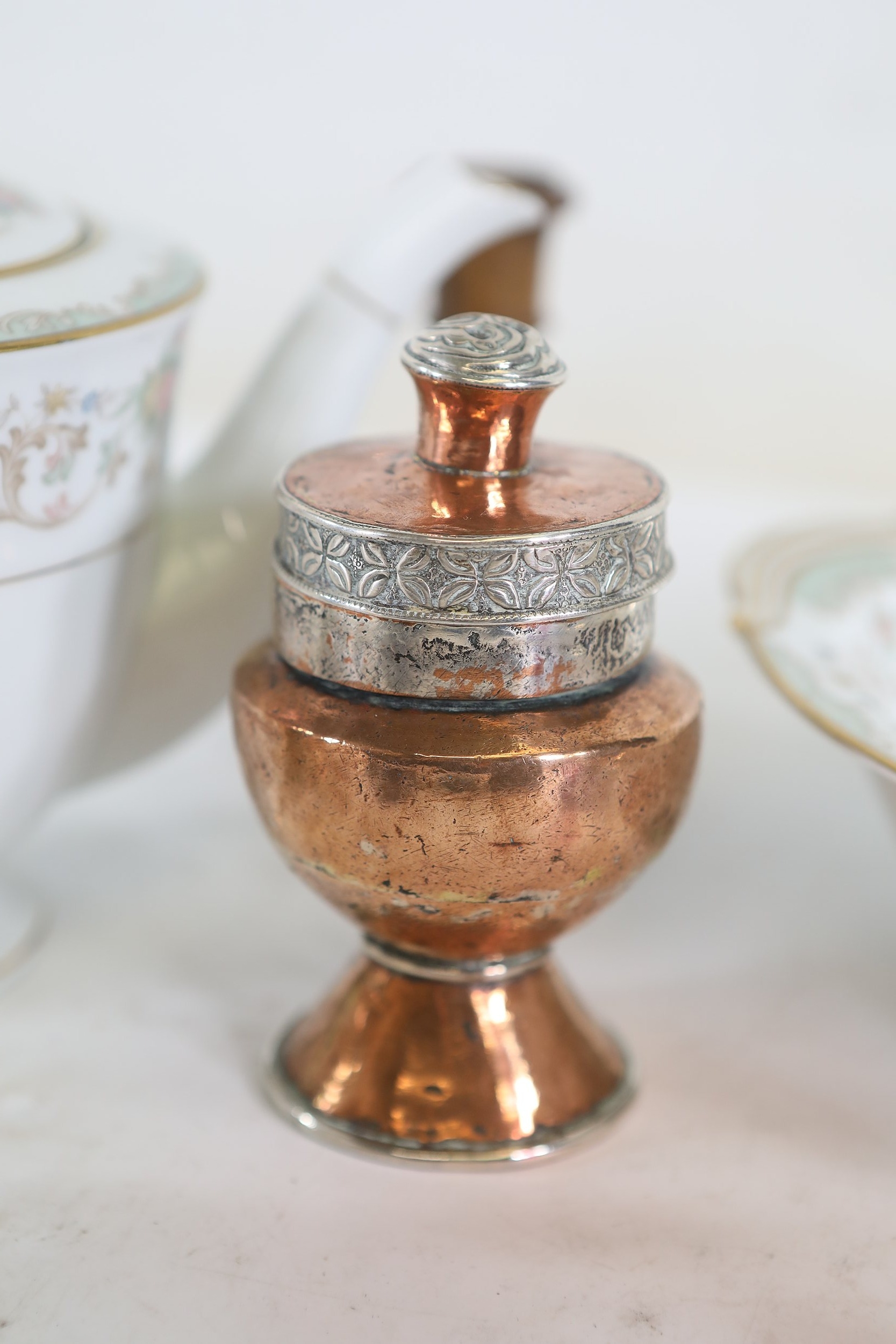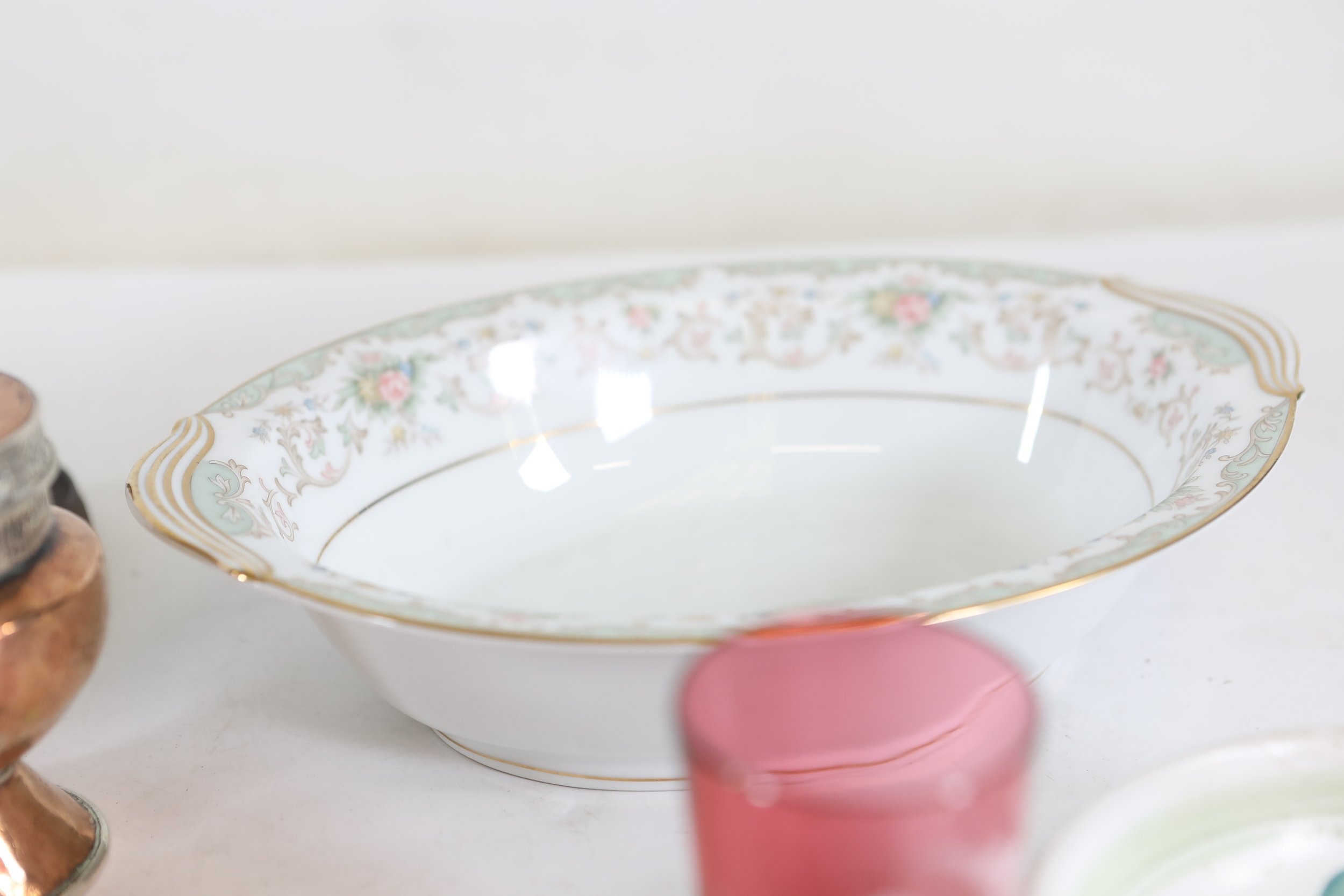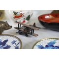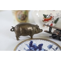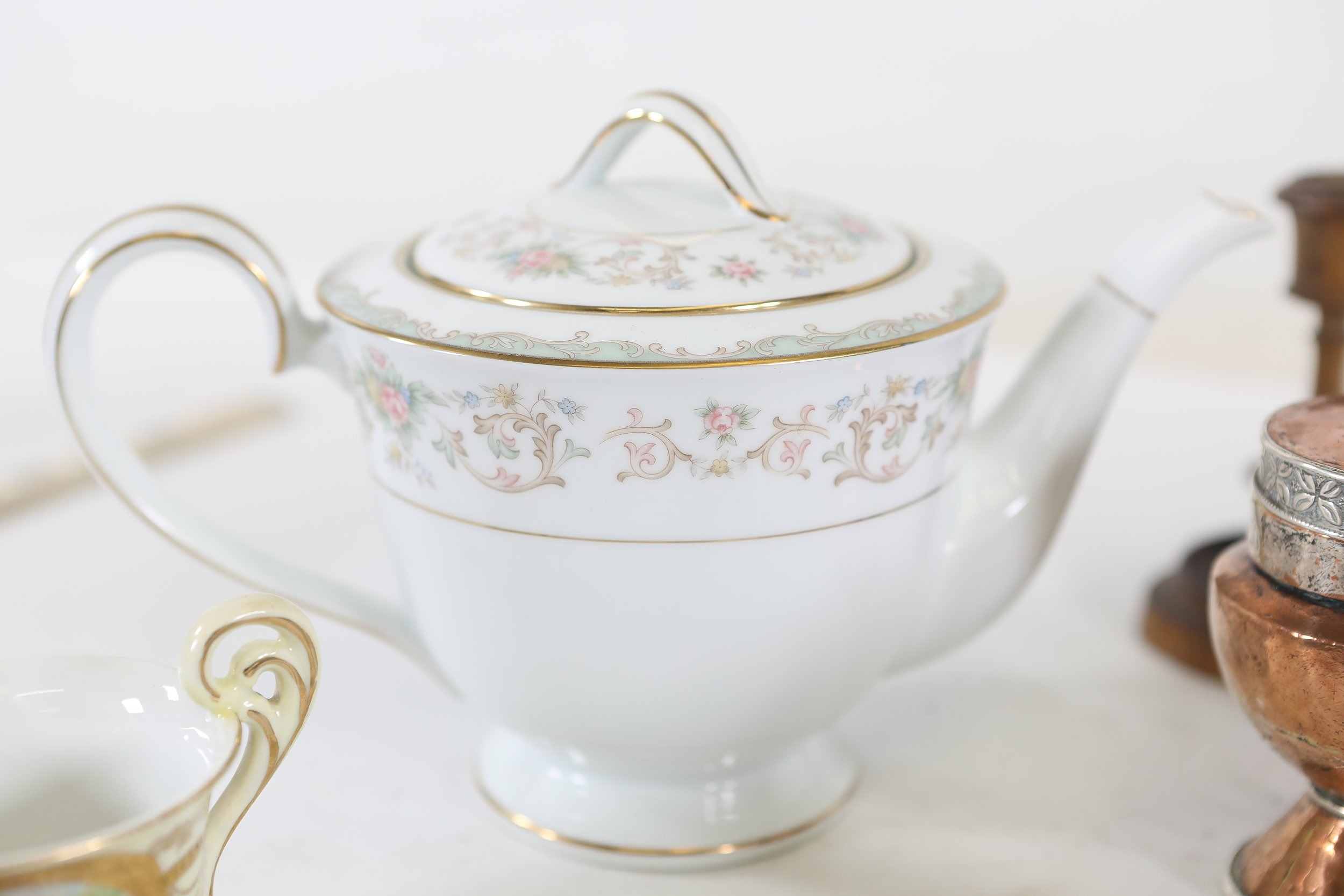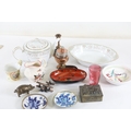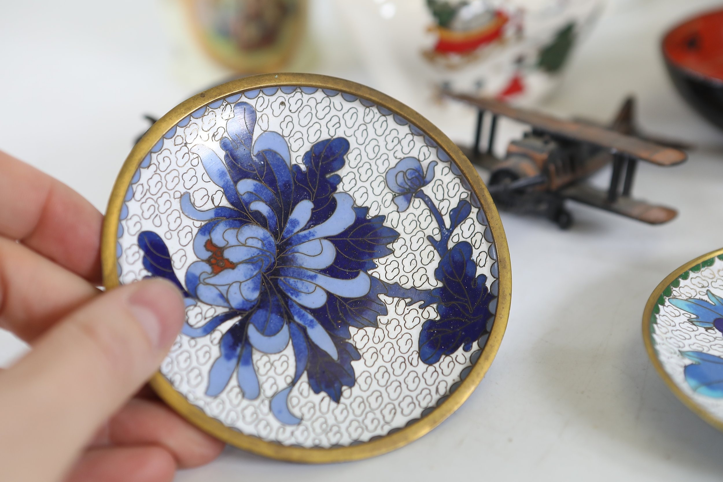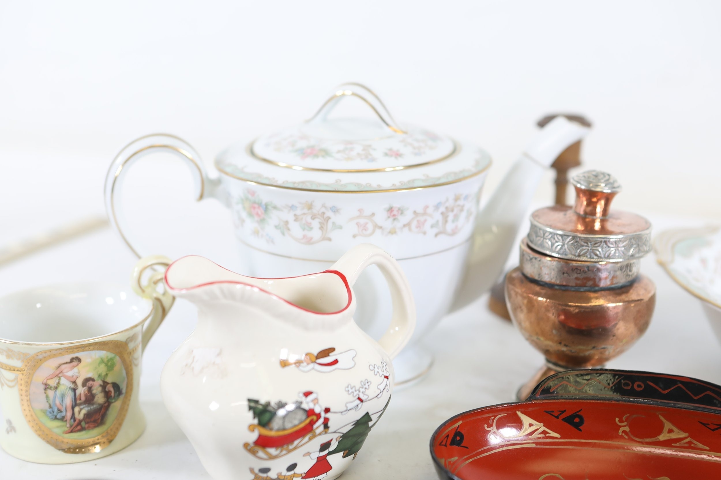 A mixed collection of approximately 12 to 15 small decorative and domestic items, comprising a white porcelain teapot and matching oval serving bowl with pastel floral garland and gilt borders, a small cream cup with classical scene cartouche and gilt decoration, a Mason's Ironstone Christmas Village creamer made in England, a Denby bowl made in England, a small copper vessel on pedestal foot with silver coloured banding and domed lid, a turned wooden candlestick or spindle, a red and black lacquered oval dish with gilt ornament, a pink cranberry glass tumbler with white cameo style figural decoration, a painted earthenware bowl, a small bronze or brass pig figure with loop tail, a cast metal biplane model, a pair of blue and white cloisonne style enamel dishes with gilt rims, and a rectangular relief decorated metal trinket box. The group dates from the late 19th century to the late 20th century, with the majority 20th century, and includes English ceramic manufacturers Mason's and Denby alongside decorative metalwork and export style wares. Condition is consistent with an estate group, with surface wear, rubbing to gilding, patina and tarnish to metal surfaces, and minor handling marks.