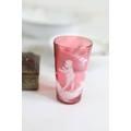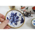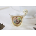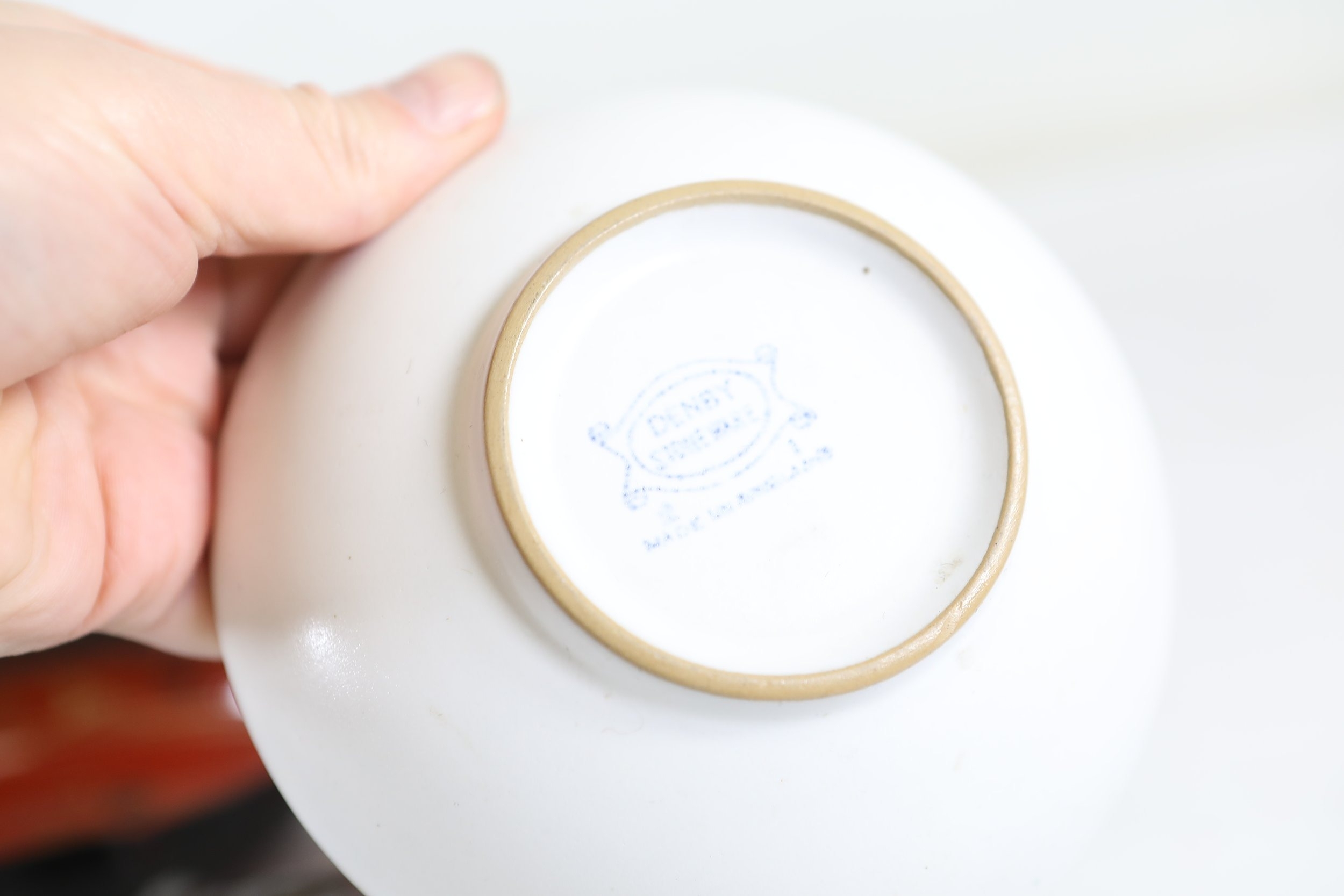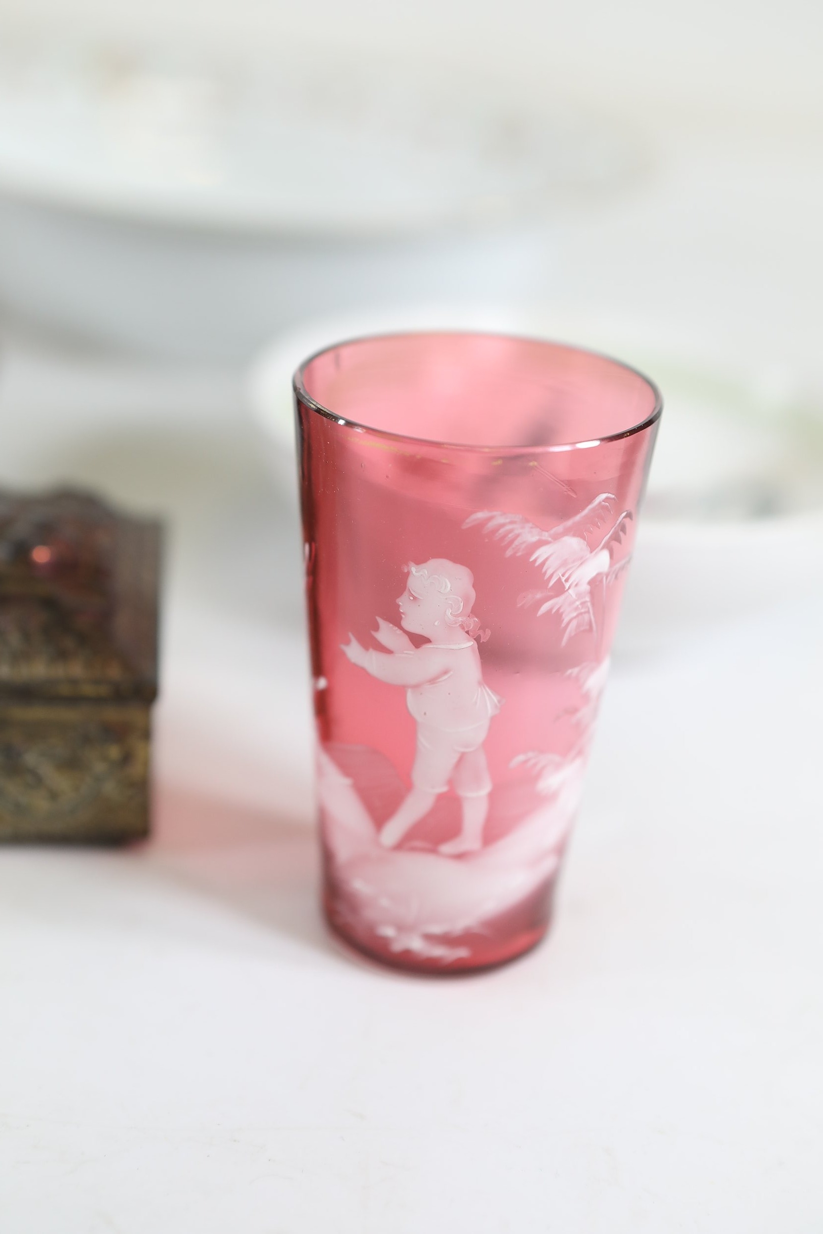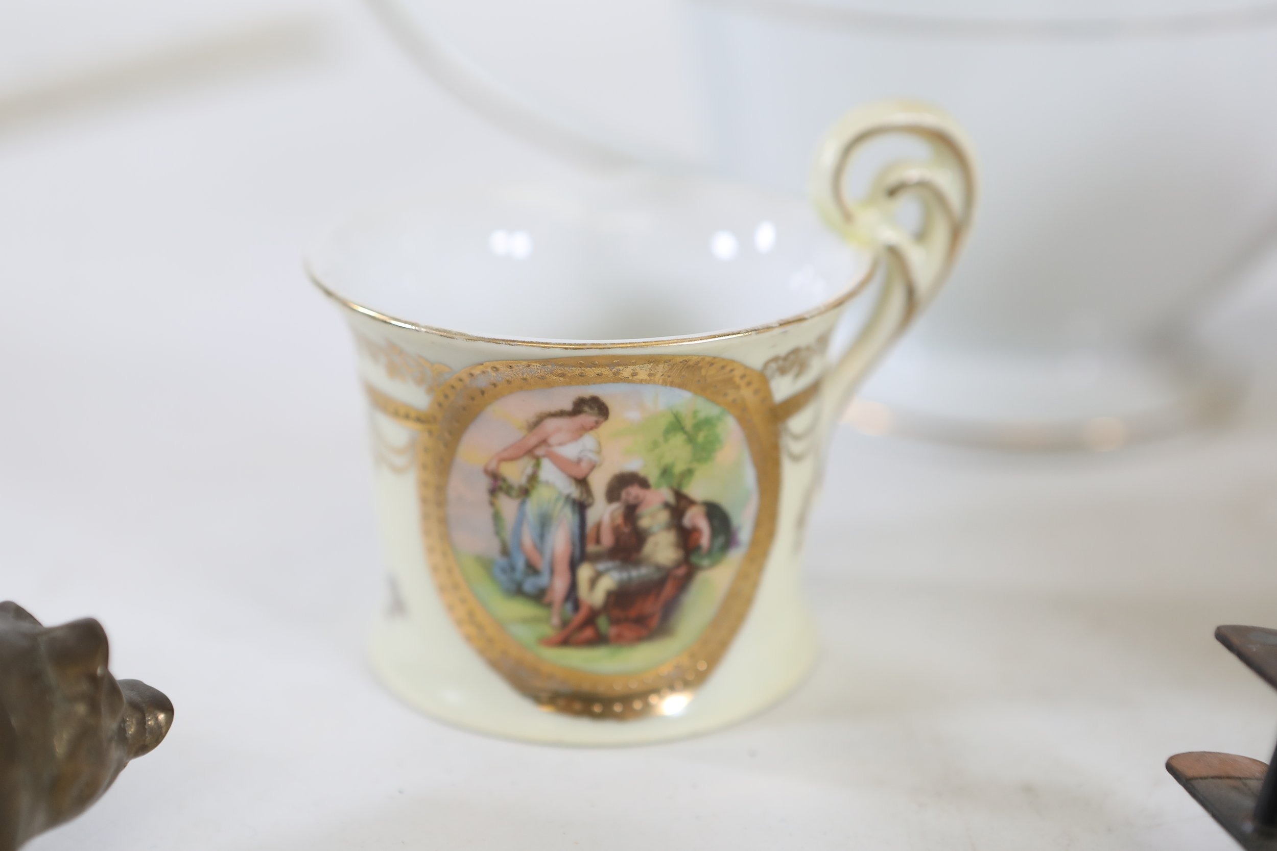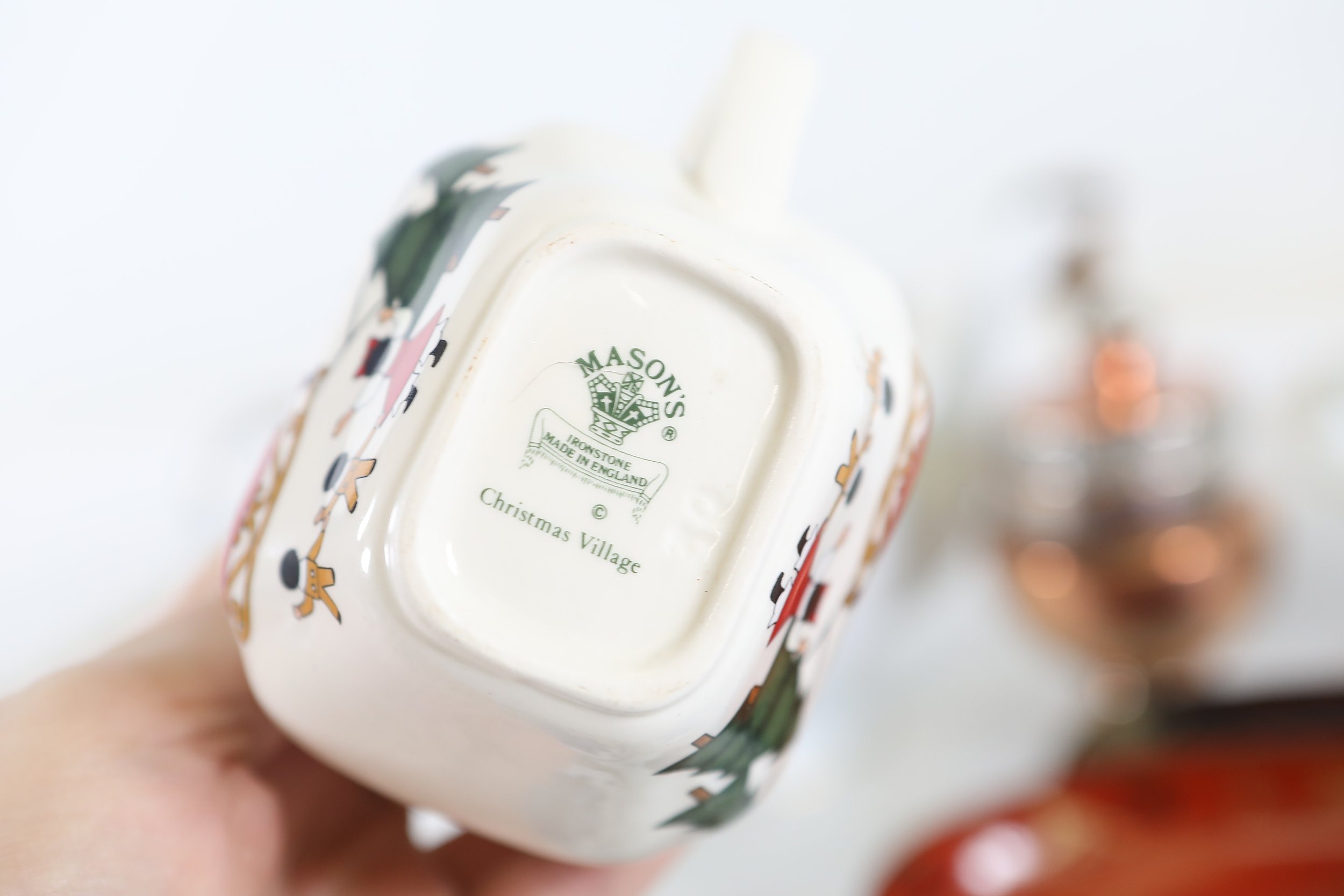 A mixed collection of approximately 12 to 15 small decorative and domestic items, comprising a white porcelain teapot and matching oval serving bowl with pastel floral garland and gilt borders, a small cream cup with classical scene cartouche and gilt decoration, a Mason's Ironstone Christmas Village creamer made in England, a Denby bowl made in England, a small copper vessel on pedestal foot with silver coloured banding and domed lid, a turned wooden candlestick or spindle, a red and black lacquered oval dish with gilt ornament, a pink cranberry glass tumbler with white cameo style figural decoration, a painted earthenware bowl, a small bronze or brass pig figure with loop tail, a cast metal biplane model, a pair of blue and white cloisonne style enamel dishes with gilt rims, and a rectangular relief decorated metal trinket box. The group dates from the late 19th century to the late 20th century, with the majority 20th century, and includes English ceramic manufacturers Mason's and Denby alongside decorative metalwork and export style wares. Condition is consistent with an estate group, with surface wear, rubbing to gilding, patina and tarnish to metal surfaces, and minor handling marks.