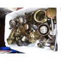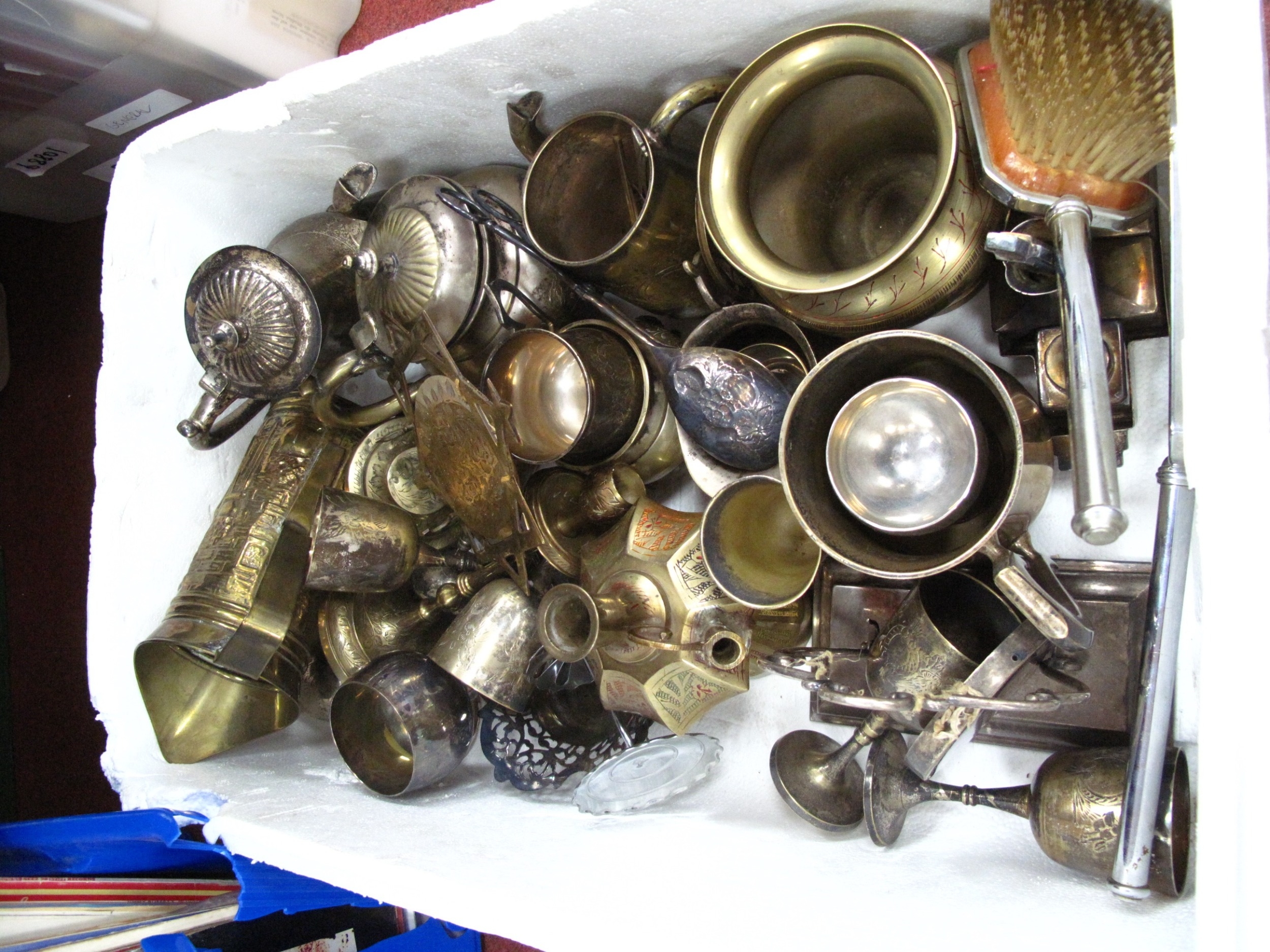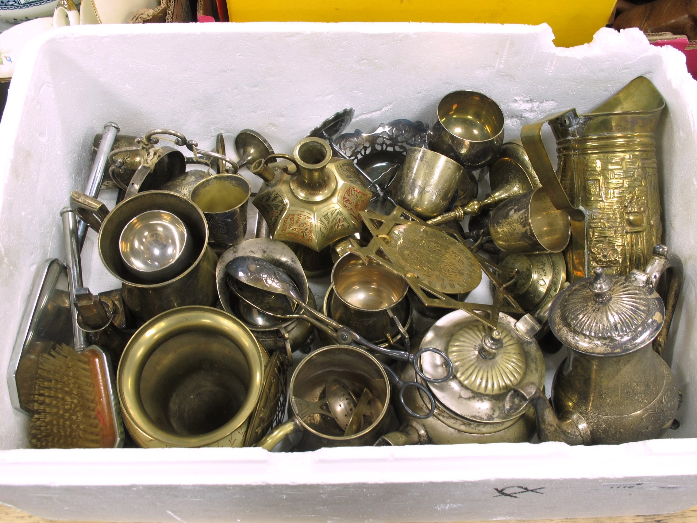 A Quantity of Metalware, including mixed brassware and silver-plated items, examples of teapots, cups, gongs and jugs, etc:- One box.