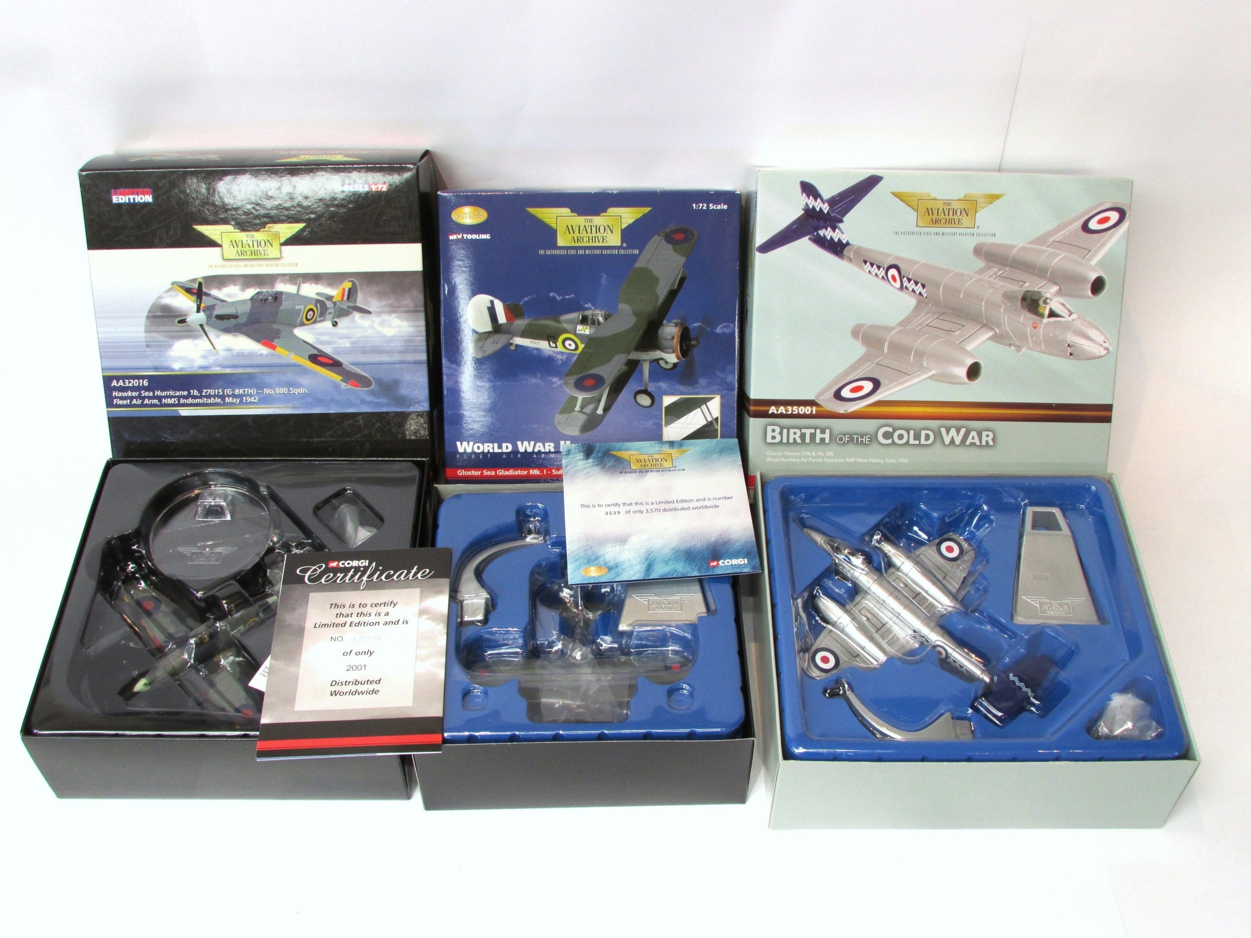 Three Corgi Aviation Archive metal diecast models to include 1:72 scale World War II Gloster Sea Gladiator Mk. I - Sub Lt. J W Selgih, 804 NAS, Fleet Air Arm, July 1940, AA36202, 1:72 scale Gloster Meteor F.Mk.8, No 500 (Royal Auxiliary Air Force) Squadron, RAF West Malling Kent 1953, AA35001, and 1:72 scale Hawker Sea Hurricane 1b Z7015 (G-BKTH) - No.880 Sqdn. Fleet Air Arm, HMS Indomitable, May 1942, AA32016, all in original boxes (3, unchecked for completeness)