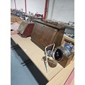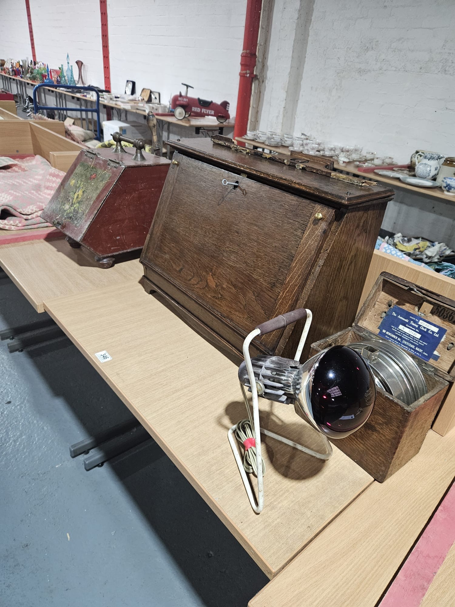 A vintage racing pigeon clock with timer, tin coal bin, infra red lamp and an oak drop front cabinet