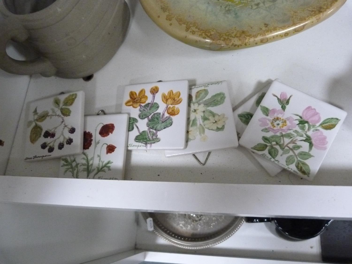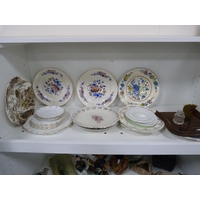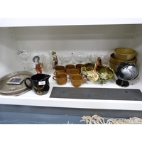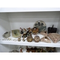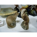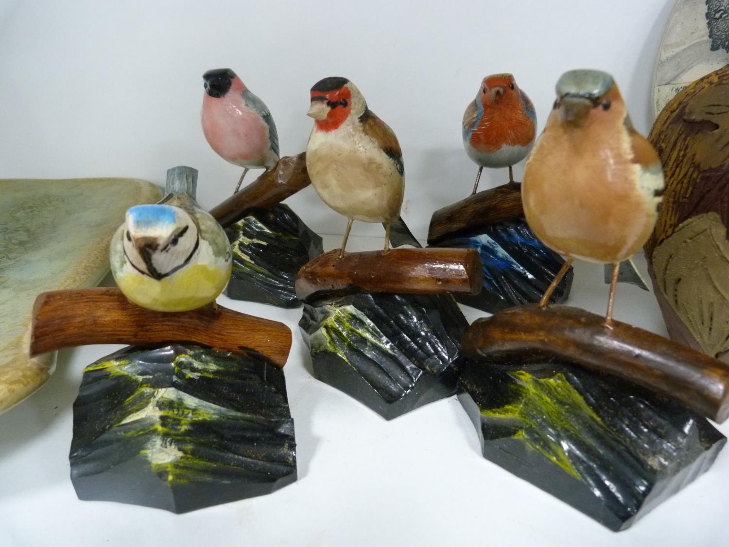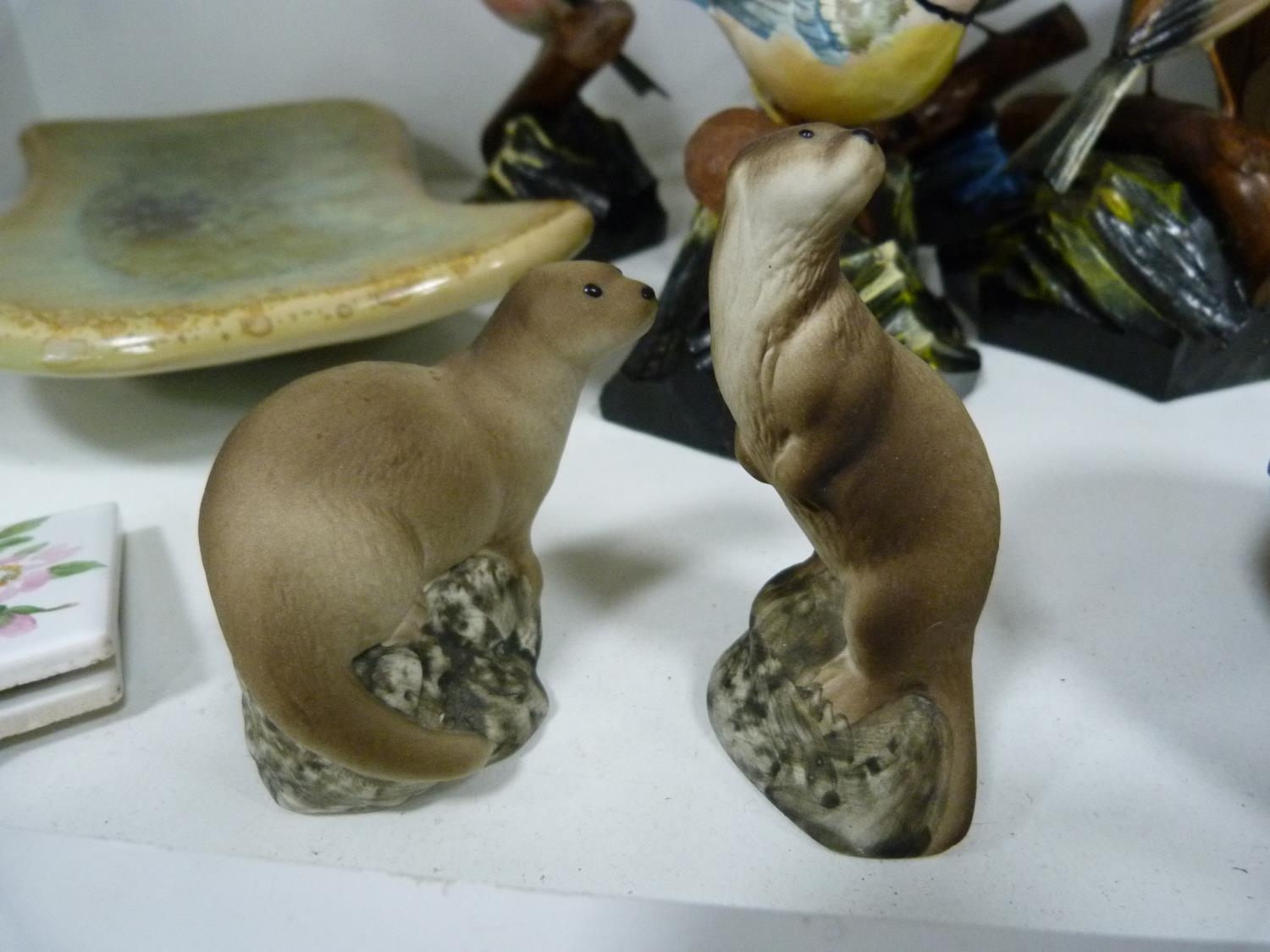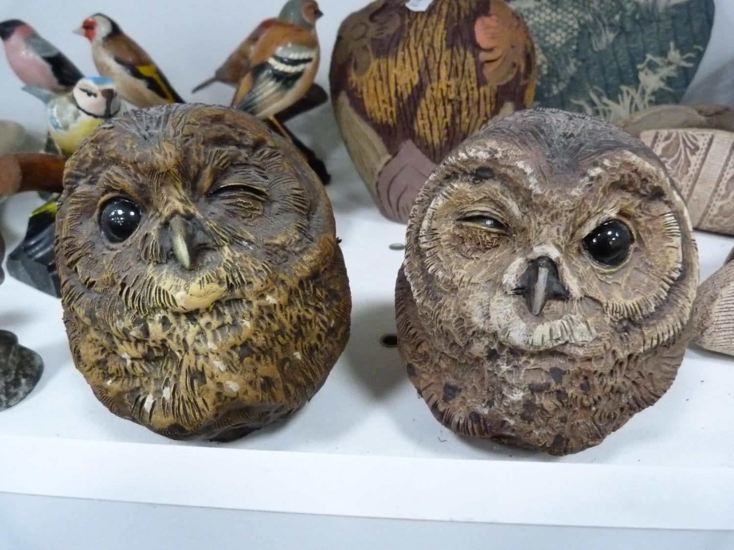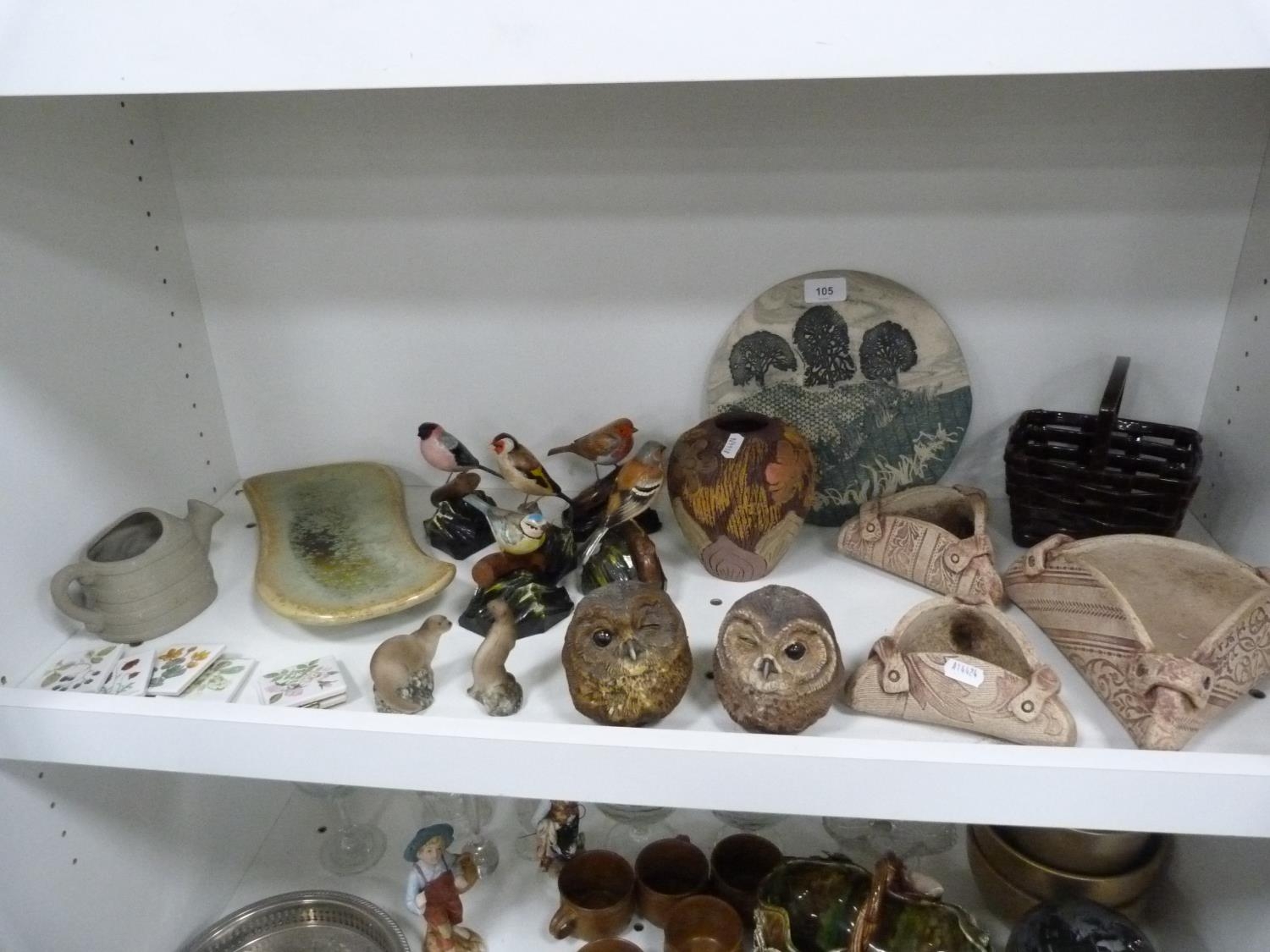 Collection of bird figures including owls, modern art plaque, modern bowls, otter figures, basket, ceramic wall plaques etc.
