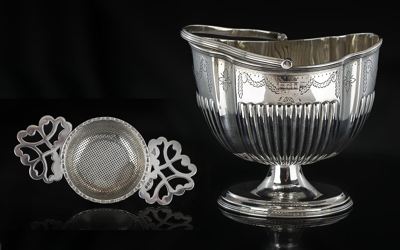 Late Victorian Period Superb Quality Sterling Silver Swing Handle Sugar Basket, With Half Fluted Body on An Oval Stepped Base. Hallmark Sheffield 1898, Maker Walker & Hall. Wonderful Condition and Quality. 253.8 grams. 5 Inches - 12.5 cms Diameter + An Elizabeth II Ornate Twin Handle Sterling Silver Tea Strainer. Hallmark London 1975. 44.9 grams. 5 Inches - 12.5 cms In length. Nr Mint Condition.