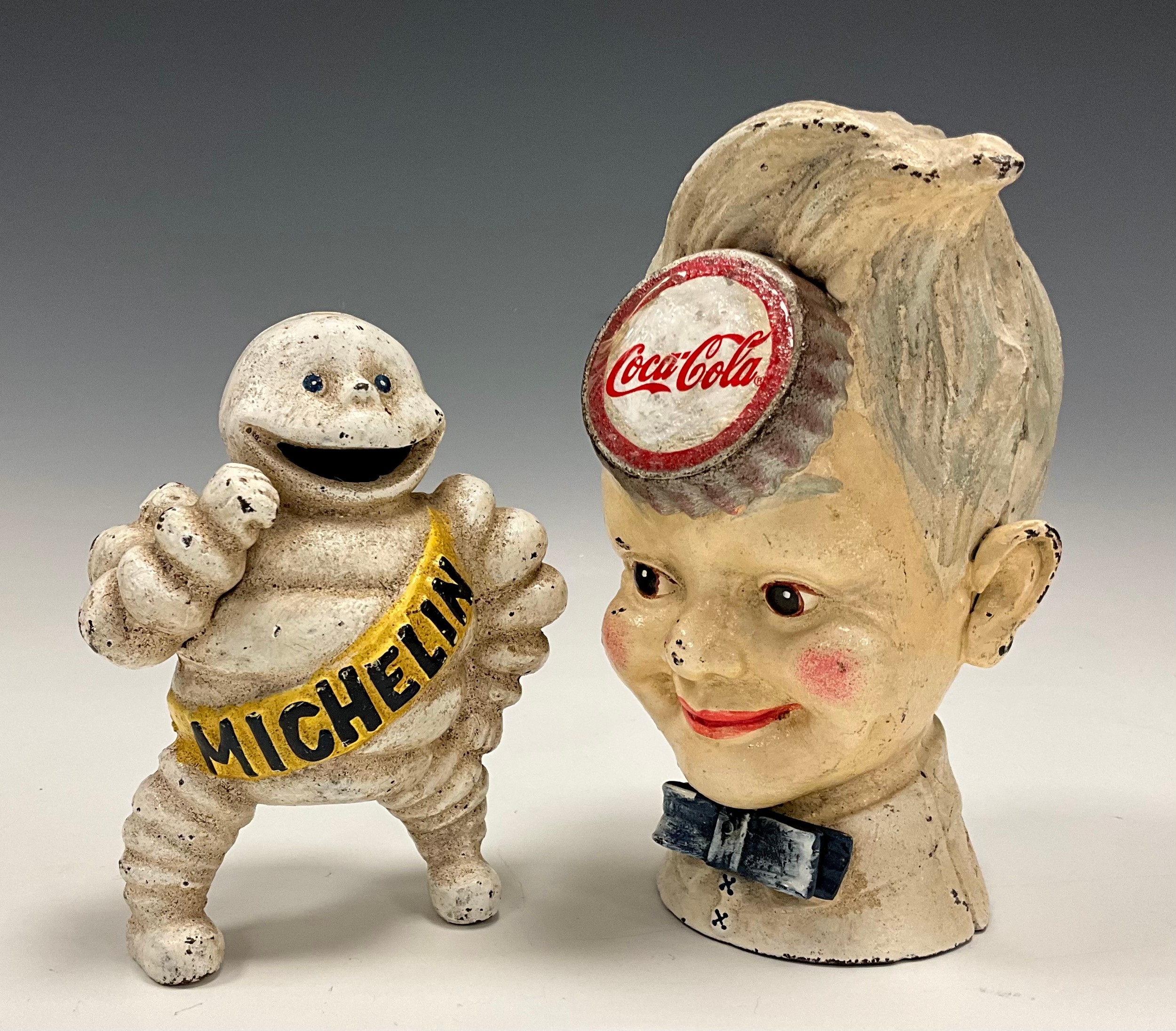 A Coca-Cola cast iron money box in the form of a boy with bottle top to forehead, 19cm high, another Michelin man, 15cm high (2)