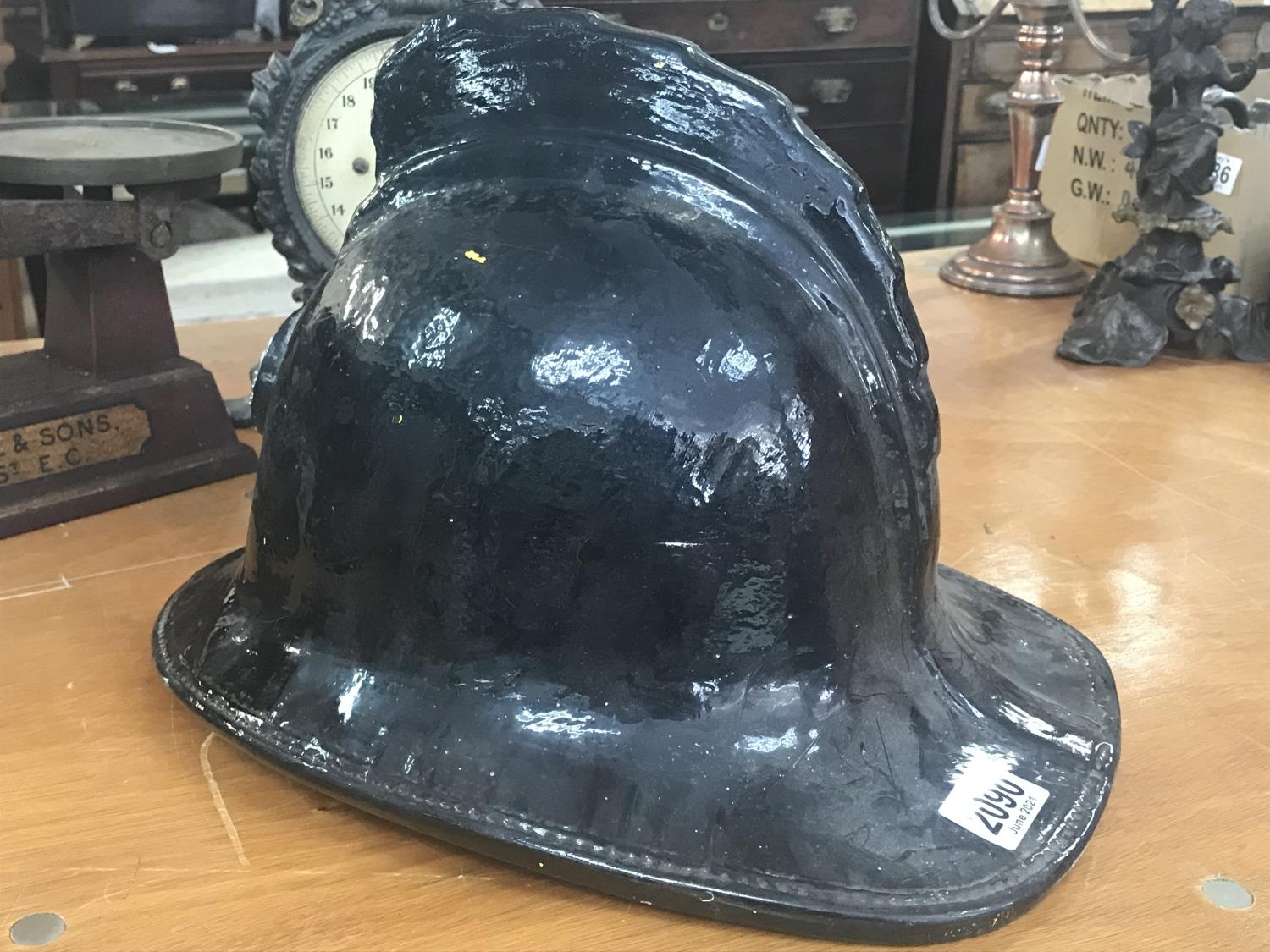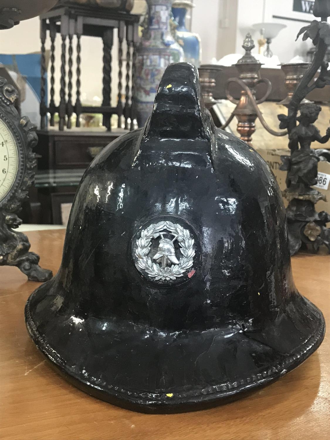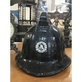A black leather Fireman's helmet with helmet badge depicting old fire helmet
