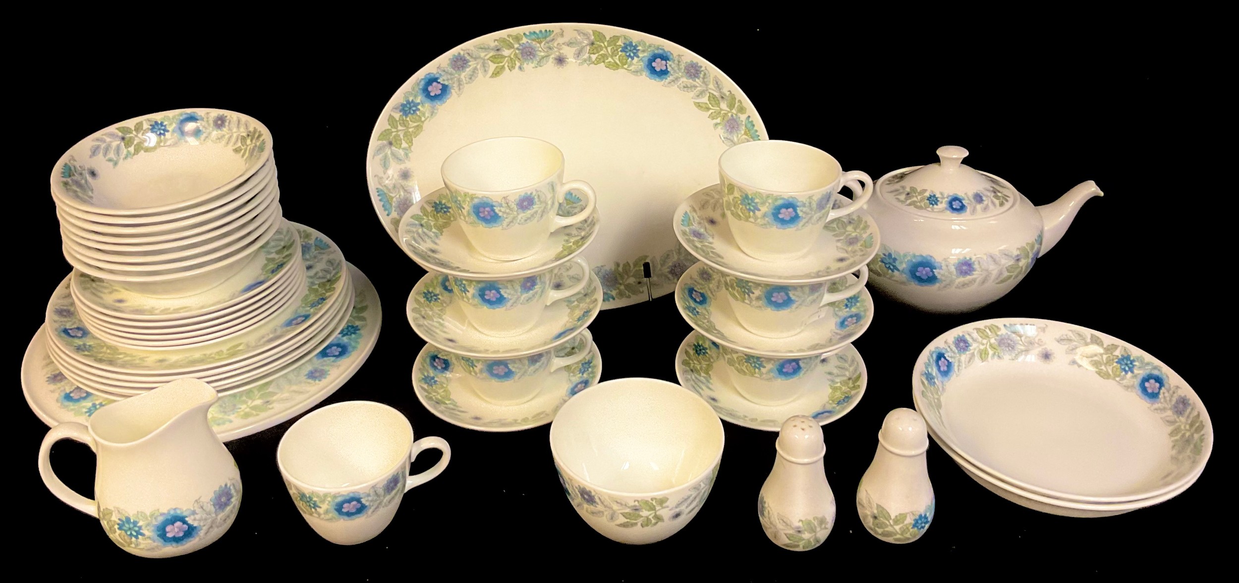 A Wedgwood Clementine pattern tea and dessert service for six comprising dessert plates, dessert bowls, cake stand, teapot, cream jug, sugar bowl, cups and saucers, etc