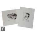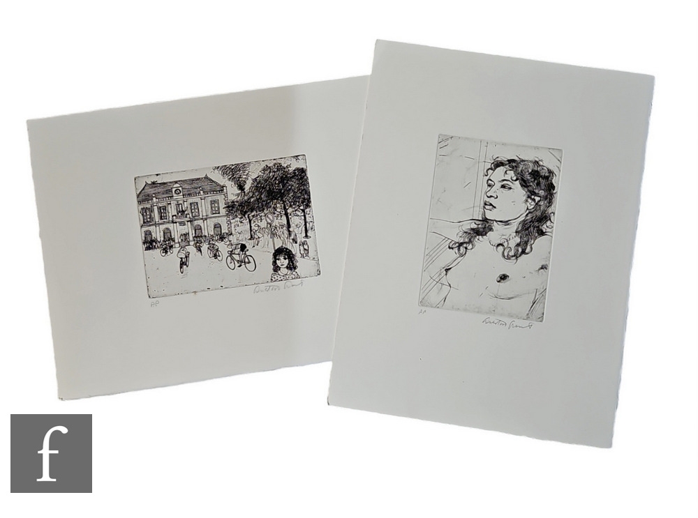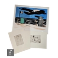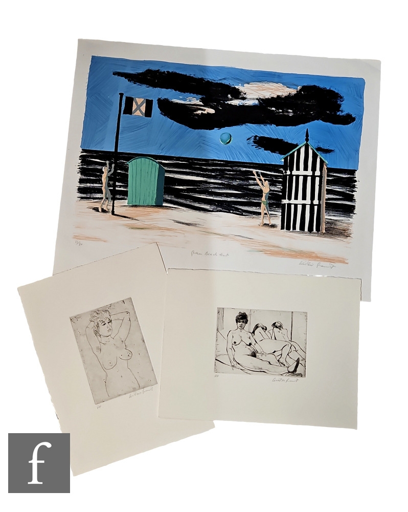 Alistair Grant (1925-1997) - 'Green Beach Hut', lithograph, signed and titled in pencil, numbered 11/30, unframed, 38cm x 56cm, sheet size 50cm x 66cm, also four unframed figure study etchings by the same hand. (5)