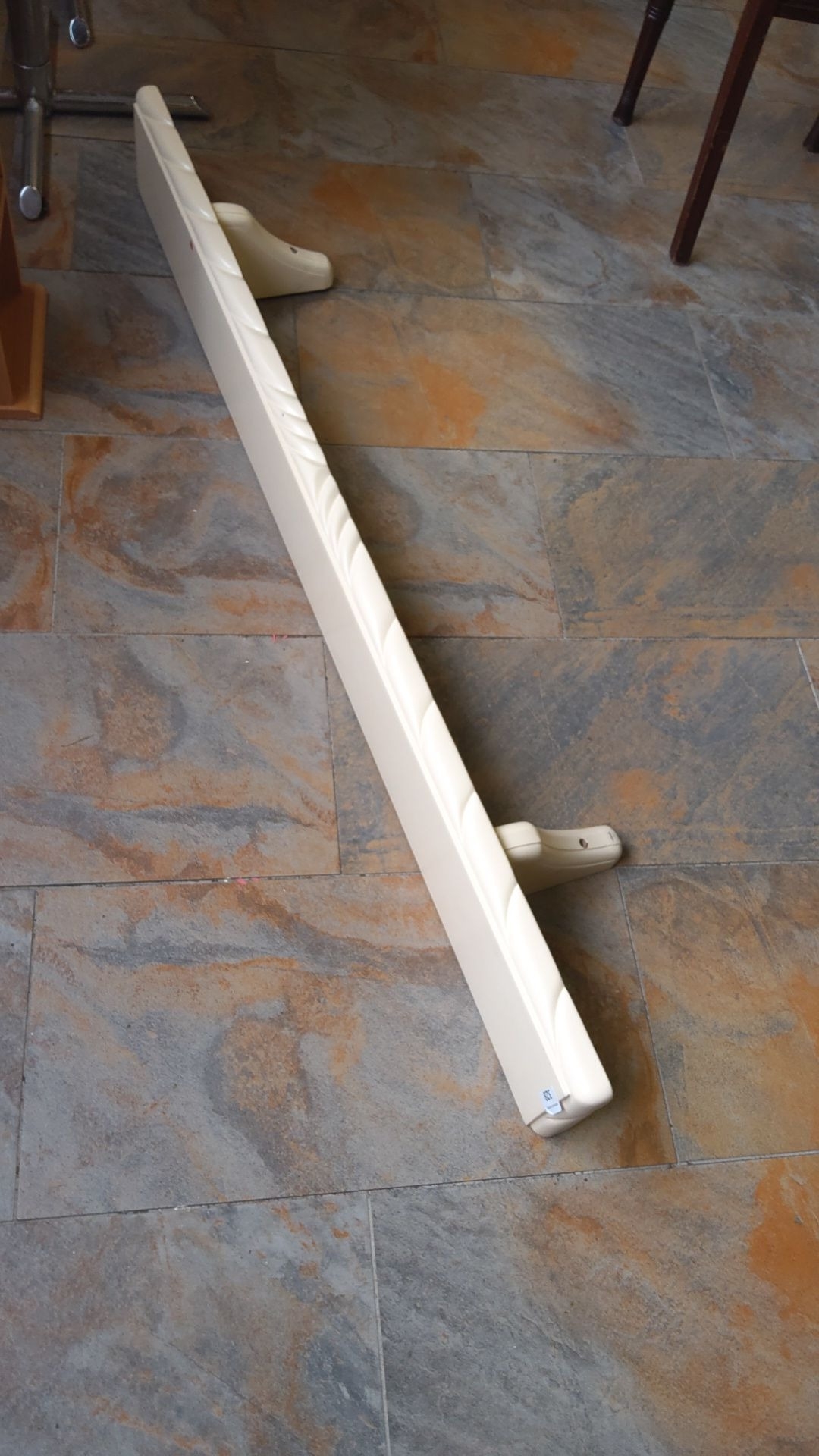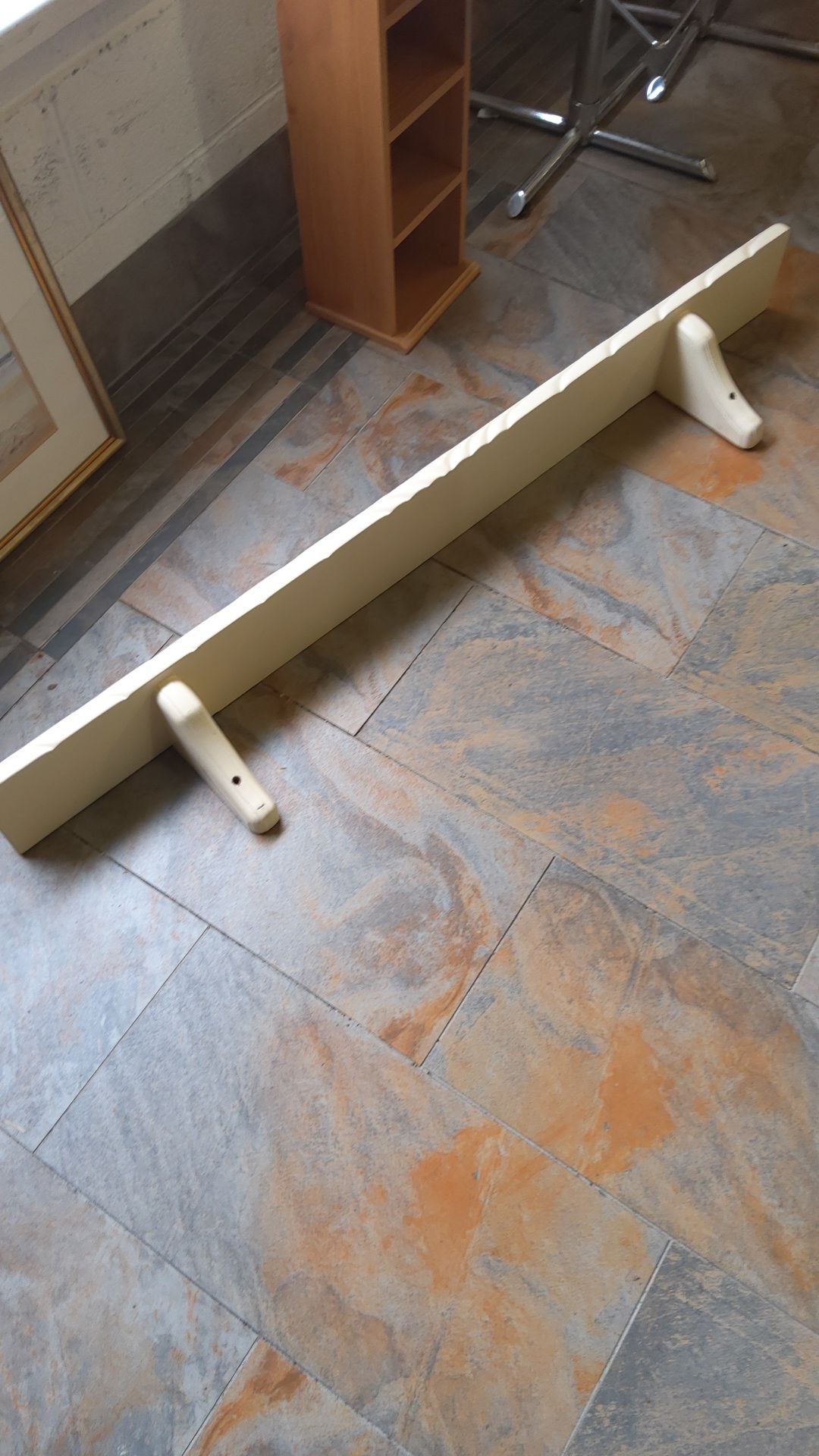 Wooden wall-mounted shelf with a white finish and decorative edge. Includes two attached brackets for support.(5ft)