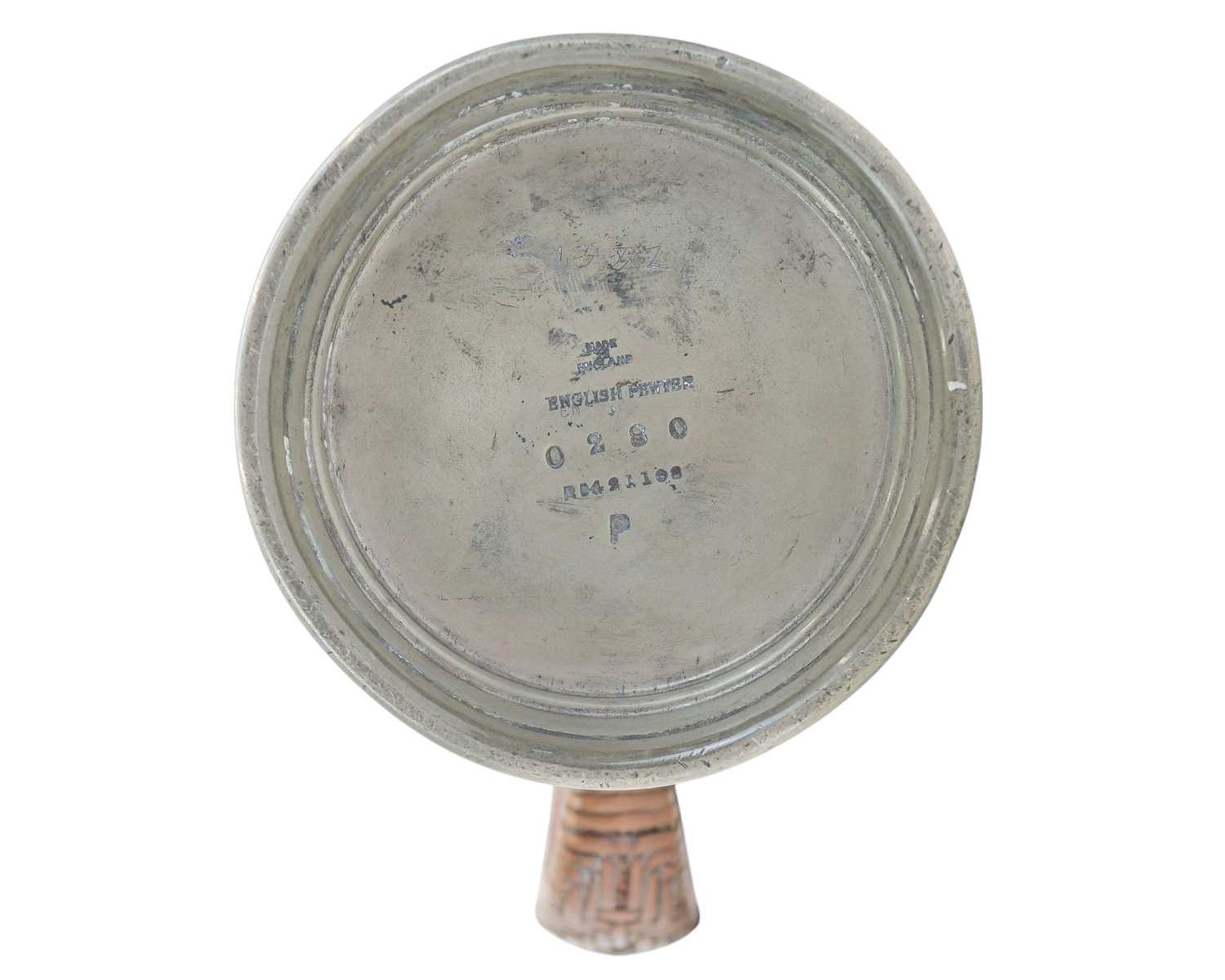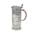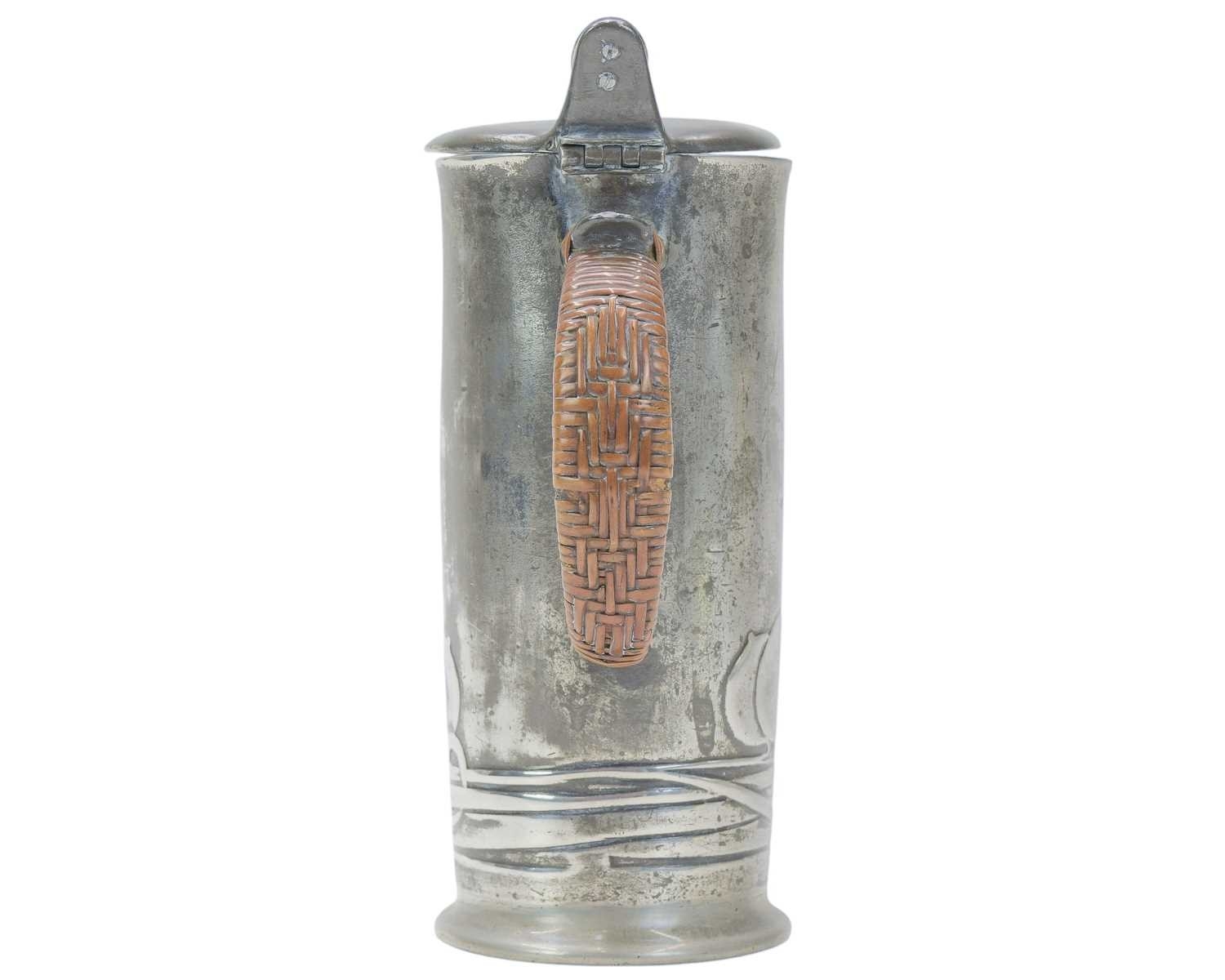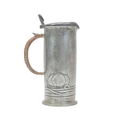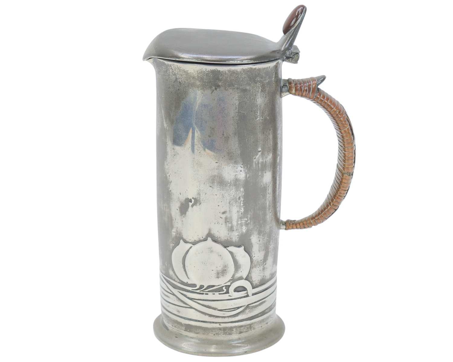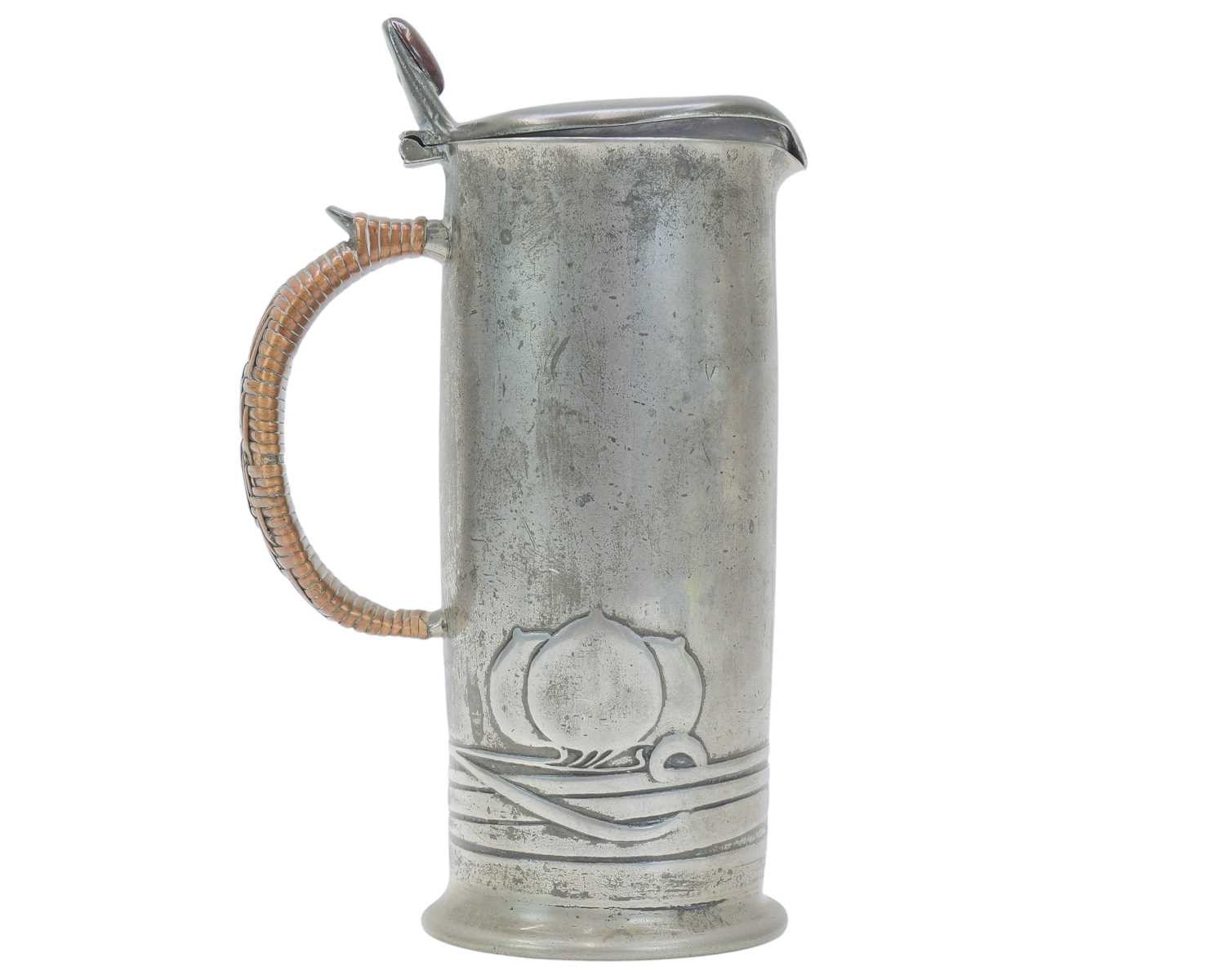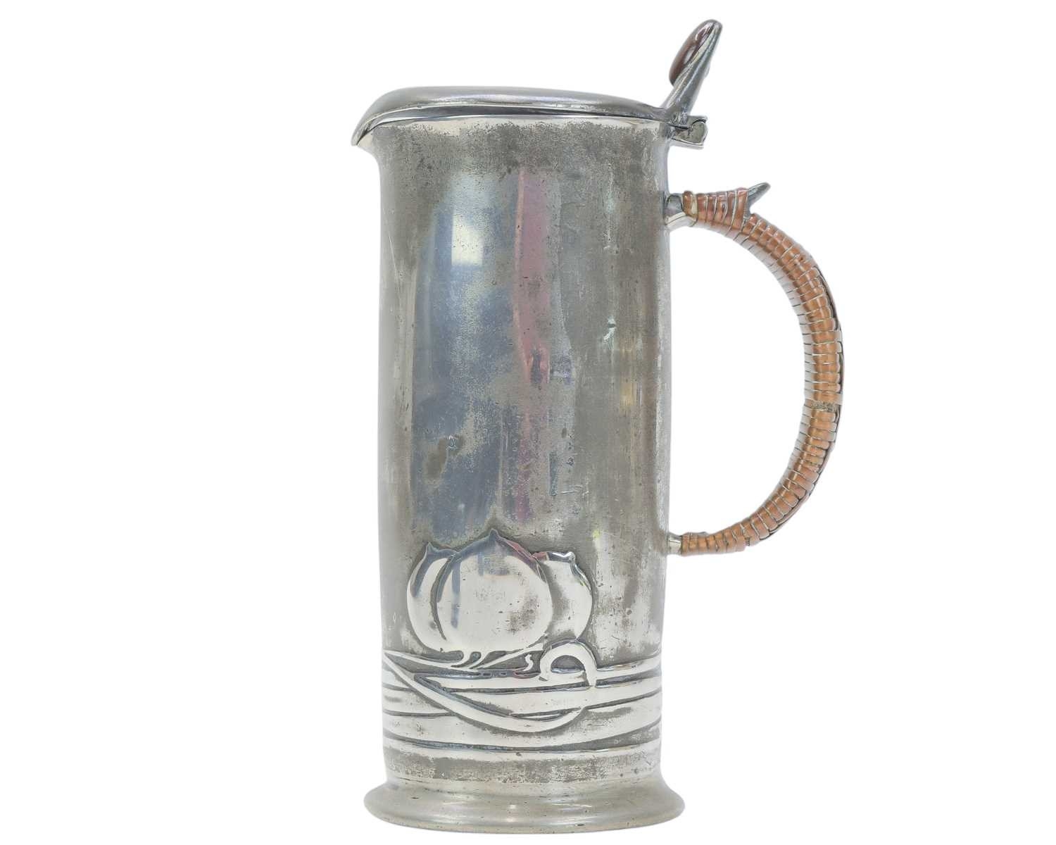 A Liberty & Co pewter lidded jug. Designed by Archibald Knox, cast with a stylised fruit, the thumbpiece with a Ruskin type oval cabochon, with a wicker handle, stamped marks 'English Pewter', numbered '0280' and with registration marks, height 20.5cm.