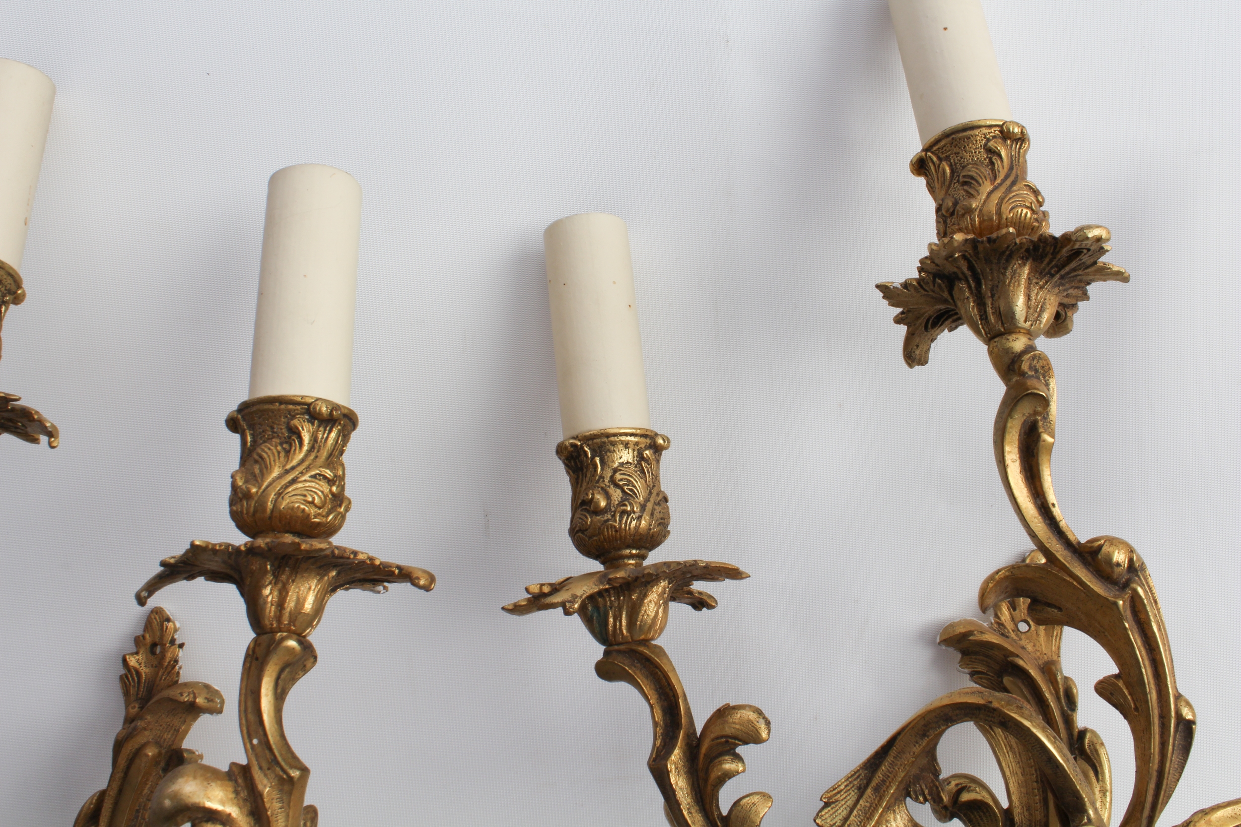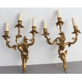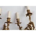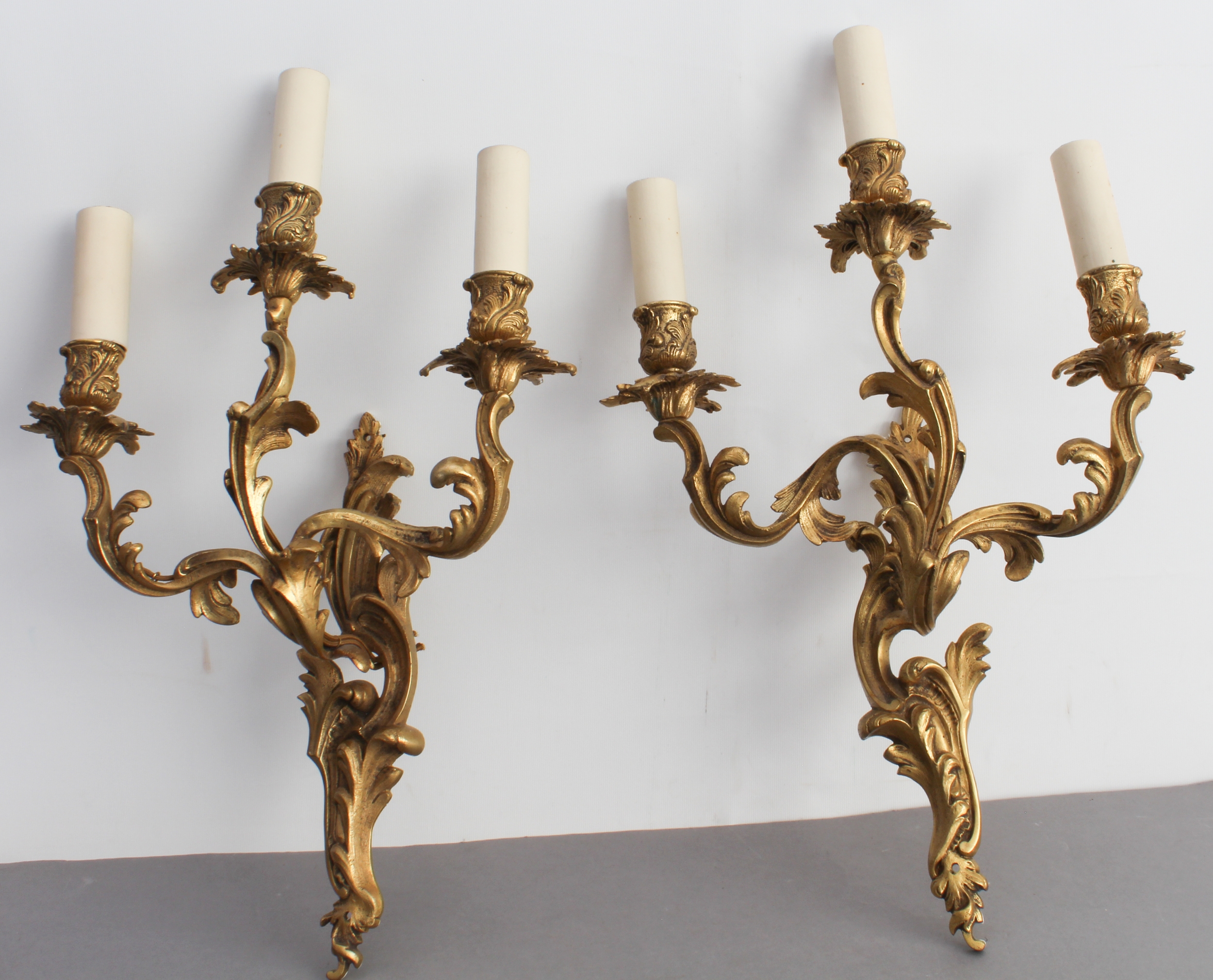 A pair of early 20th century gilt-metal three-light wall appliques in high mid-18th century Rococo style (48.5 cm high including brass electrical fitting)